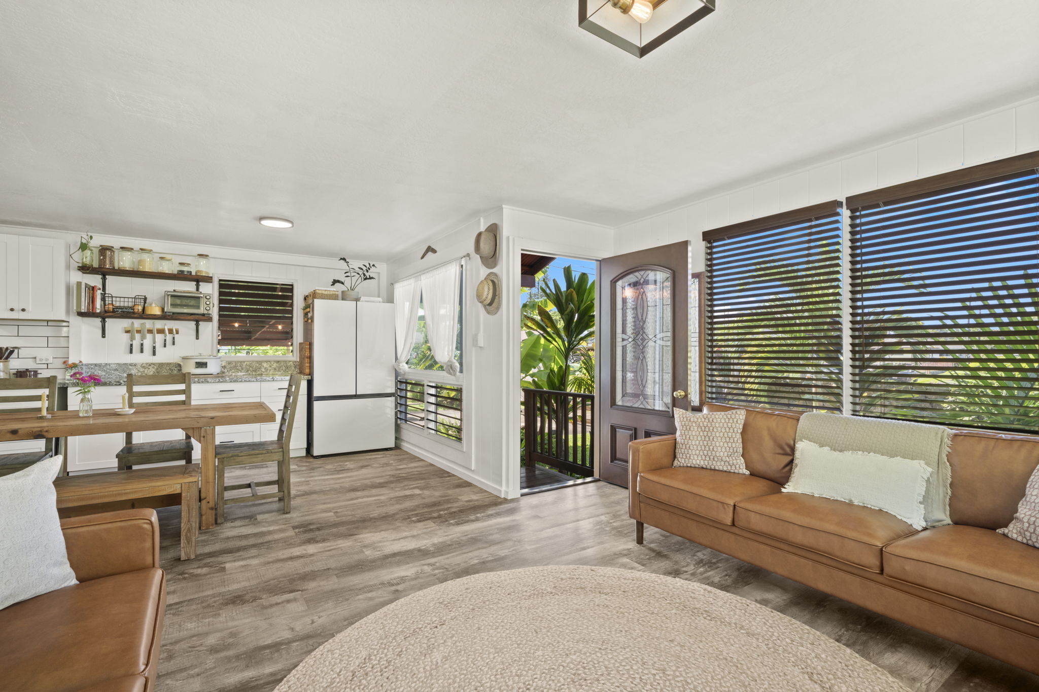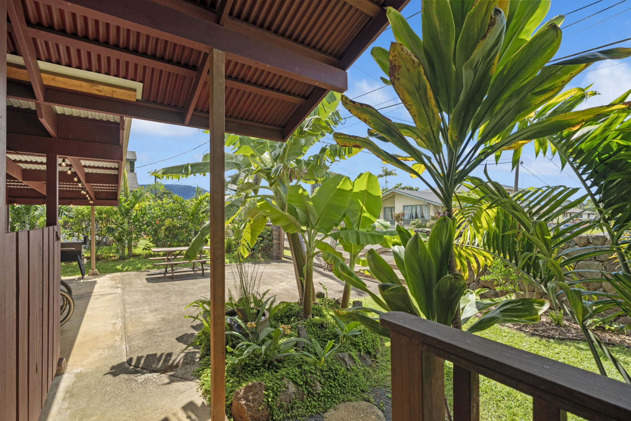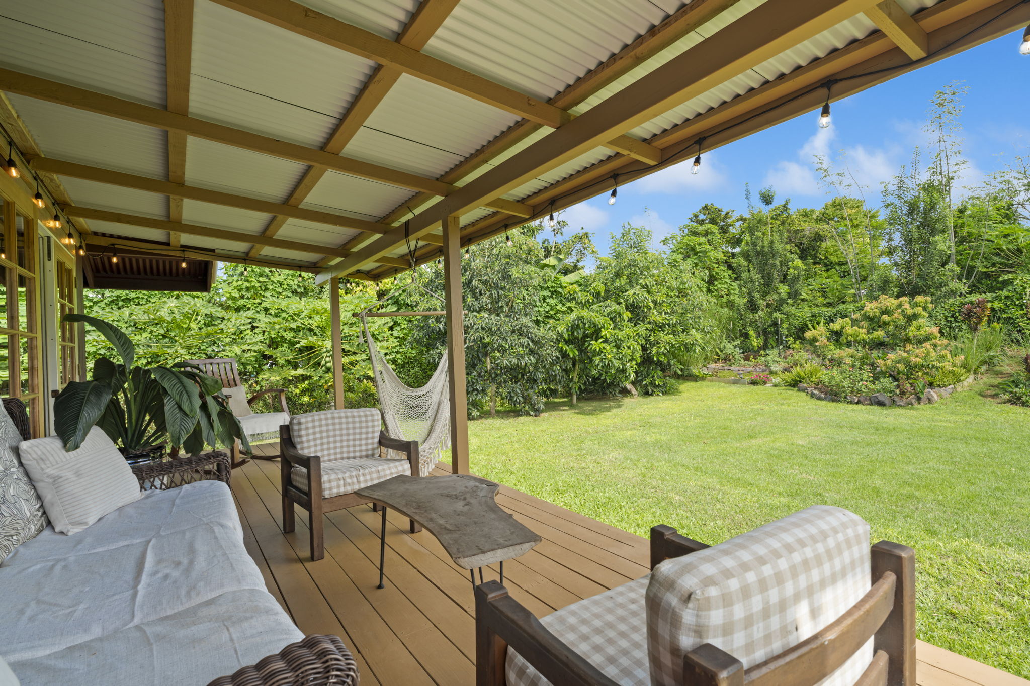 The backyard is spacious, fully fenced, and beautifully landscaped with Brazilian cherry, dragon fruit, mulberry, guava, avocado, banana, macadamia nut, lychee, limes, orange, grapefruit, pineapple, papaya, bread fruit, and more. A vegetable garden and a small chicken coop add to the property's unique island charm.