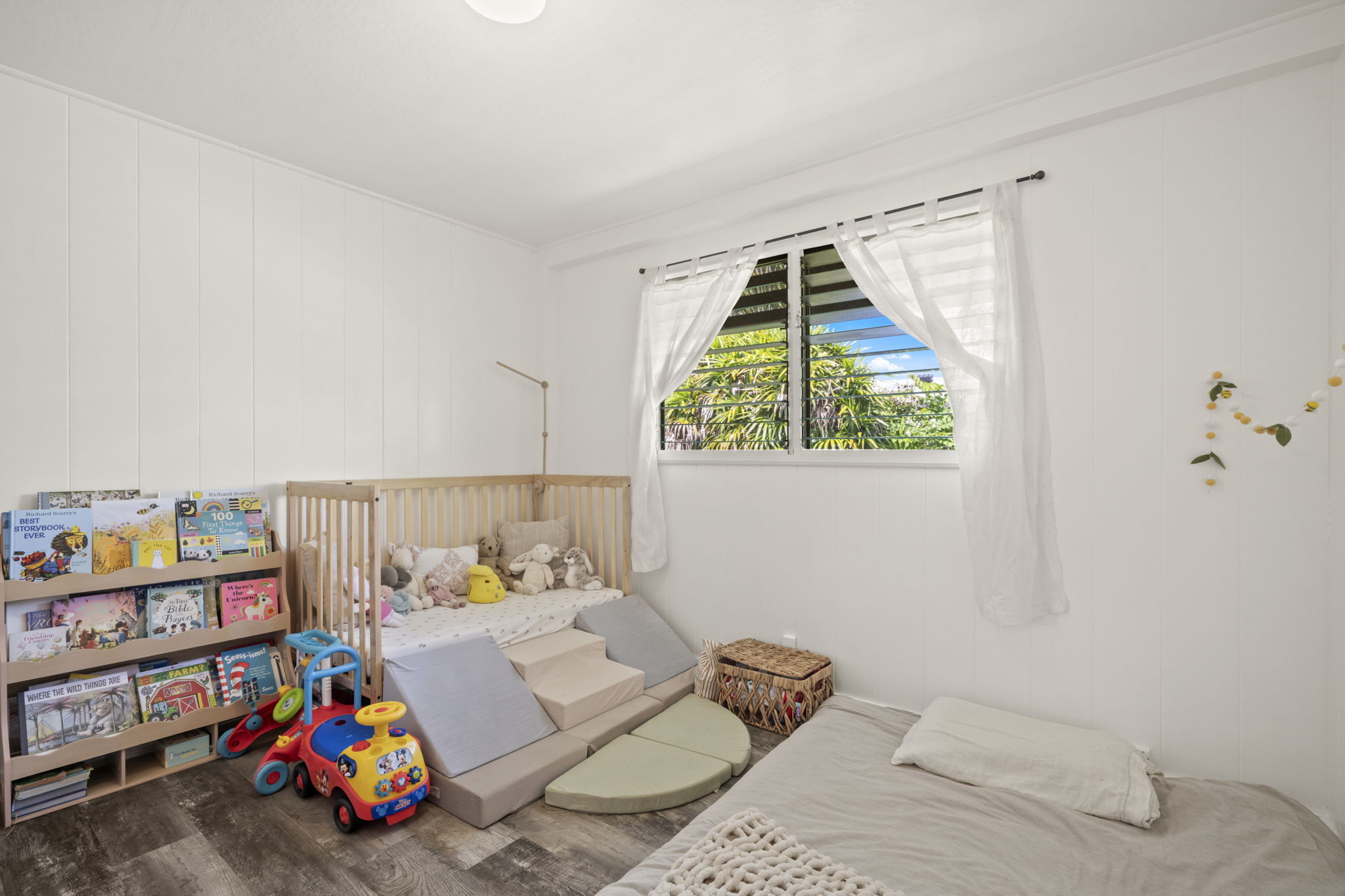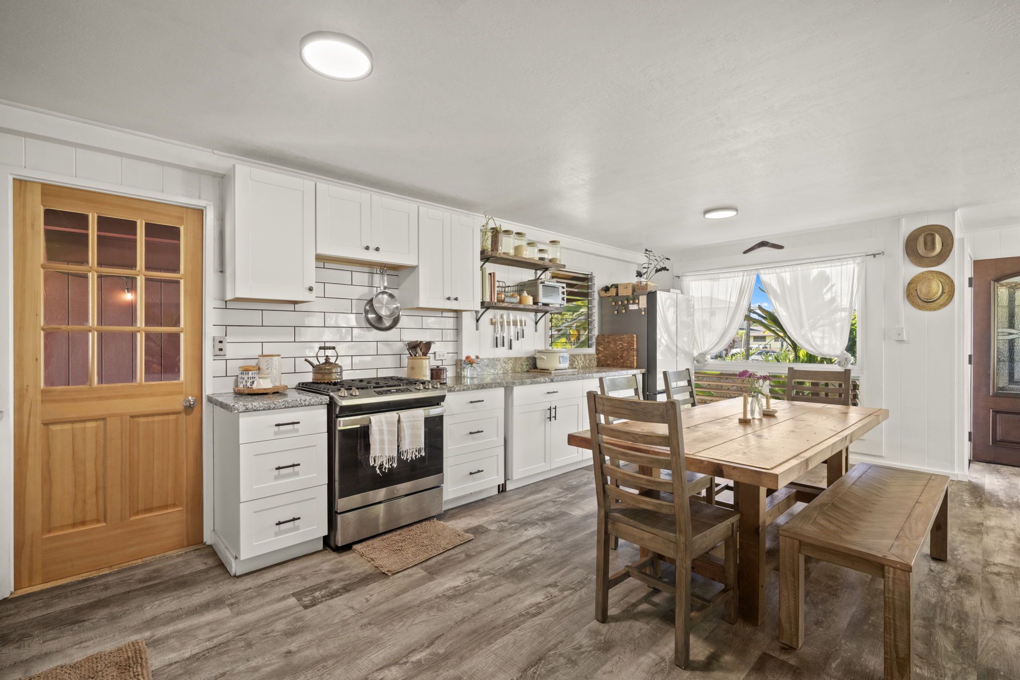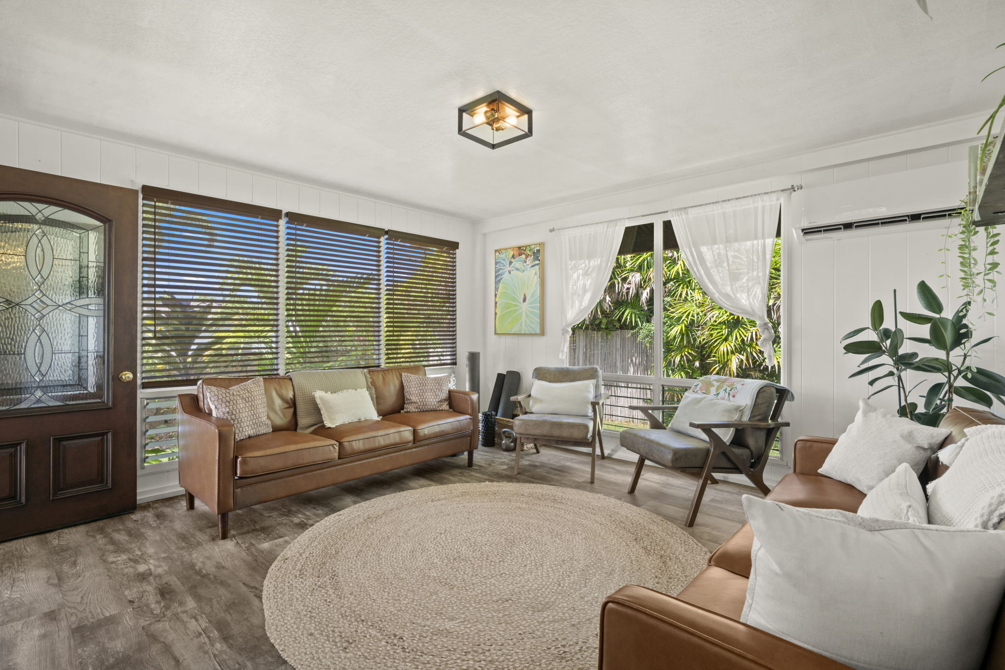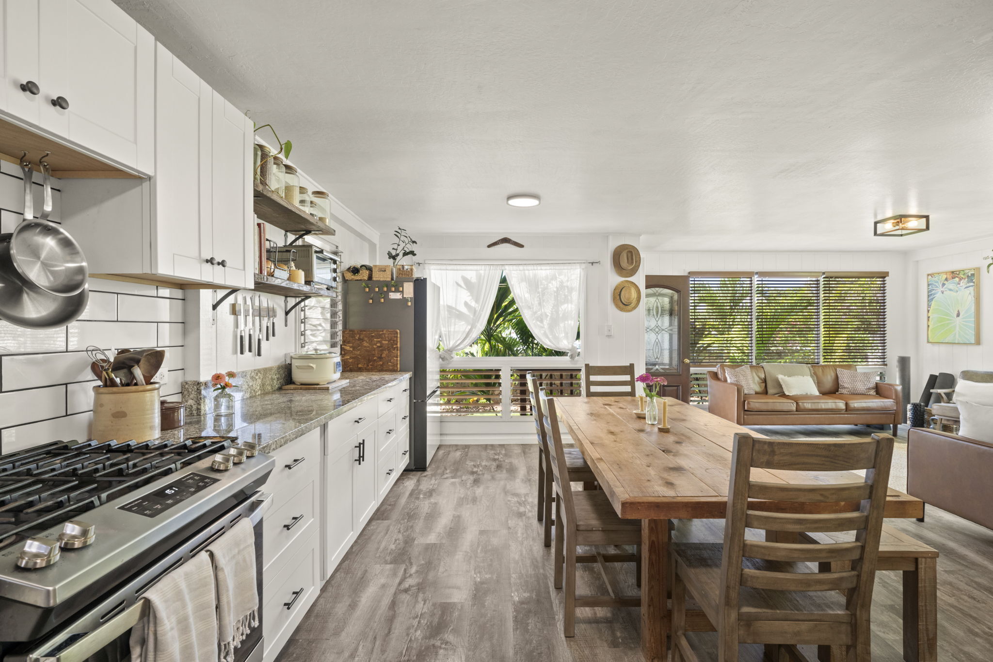The backyard is spacious, fully fenced, and beautifully landscaped with Brazilian cherry, dragon fruit, mulberry, guava, avocado, banana, macadamia nut, lychee, limes, orange, grapefruit, pineapple, papaya, bread fruit, and more. A vegetable garden and a small chicken coop add to the property's unique island charm.