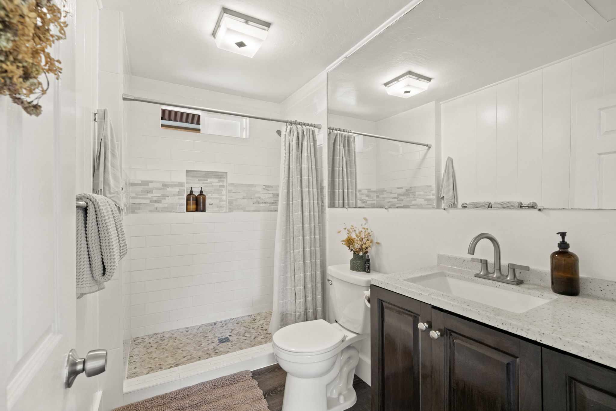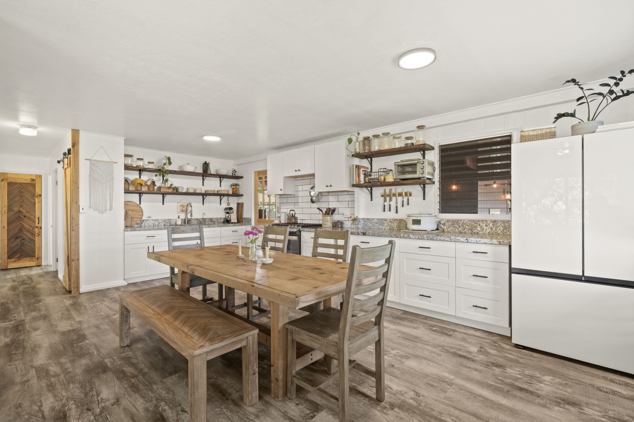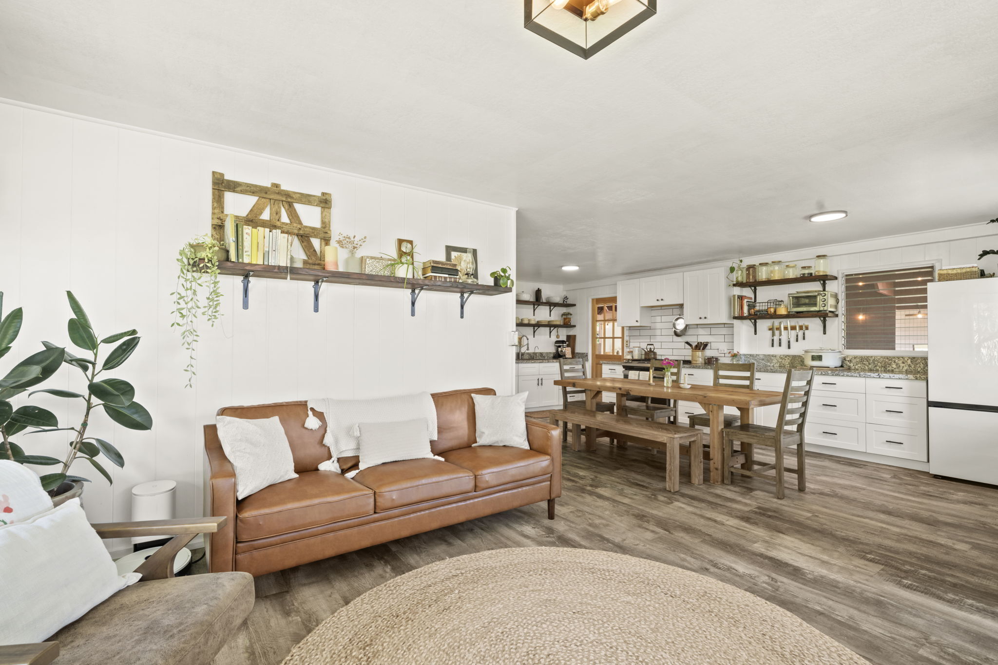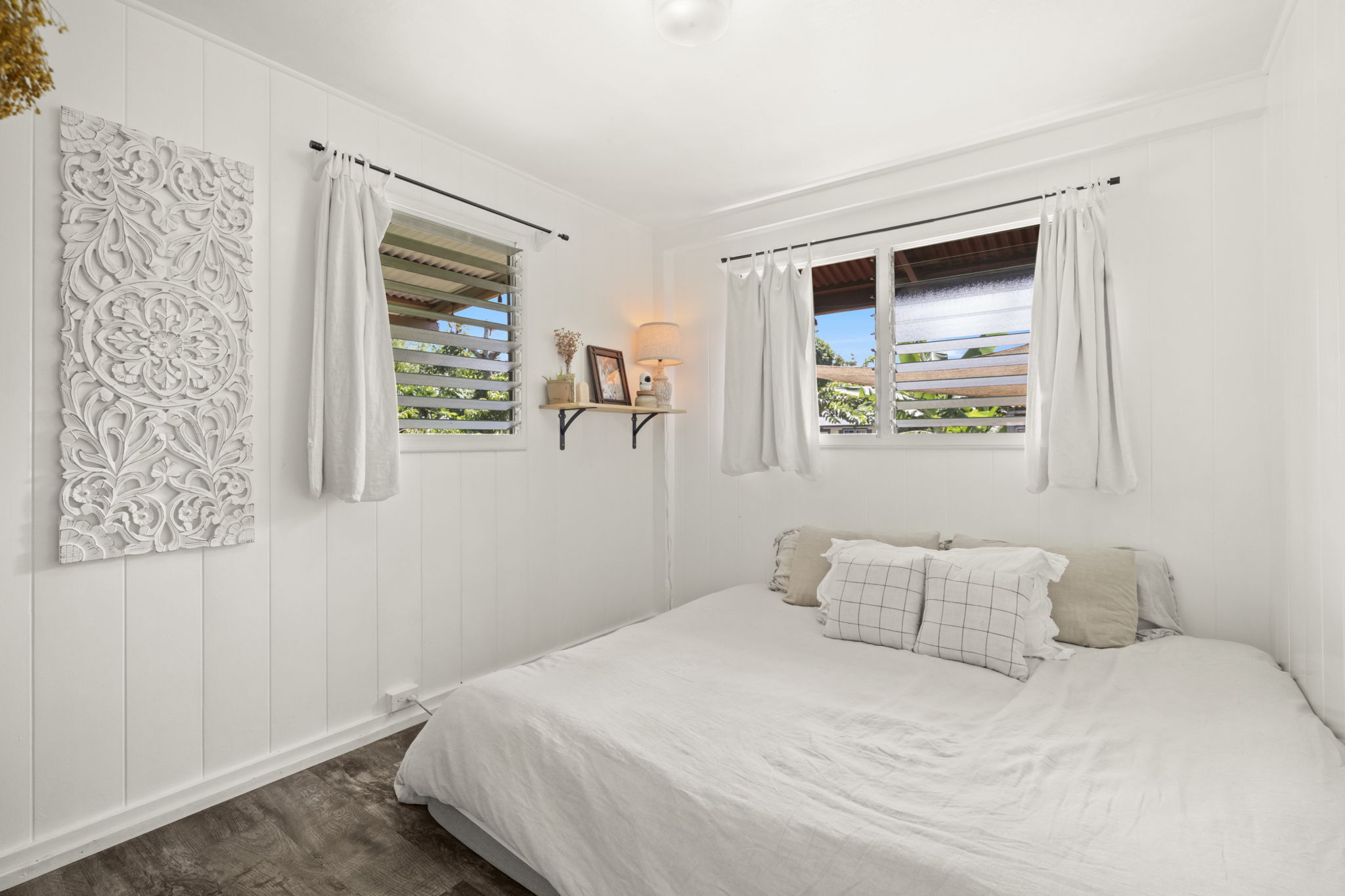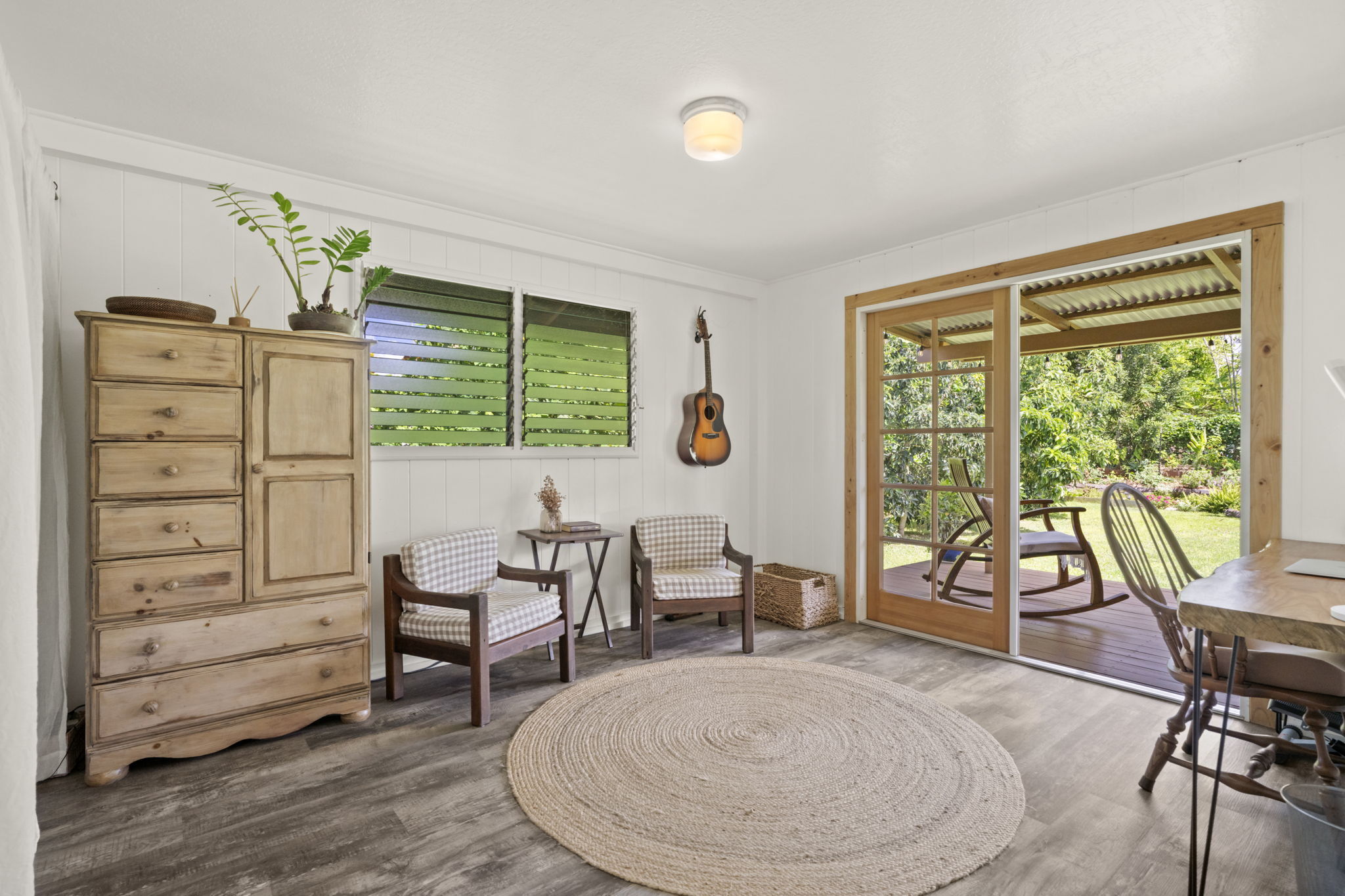 The home's open layout allows one bedroom to effortlessly serve as additional living space offering a tranquil escape with French doors that lead out to a large, covered deck overlooking the garden, blending indoor and outdoor living.