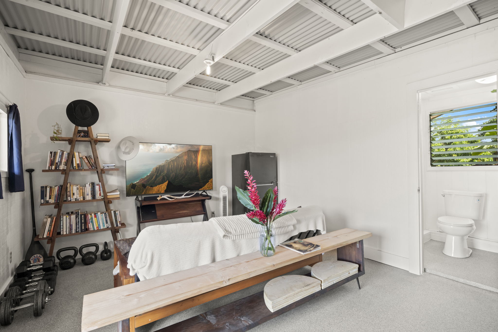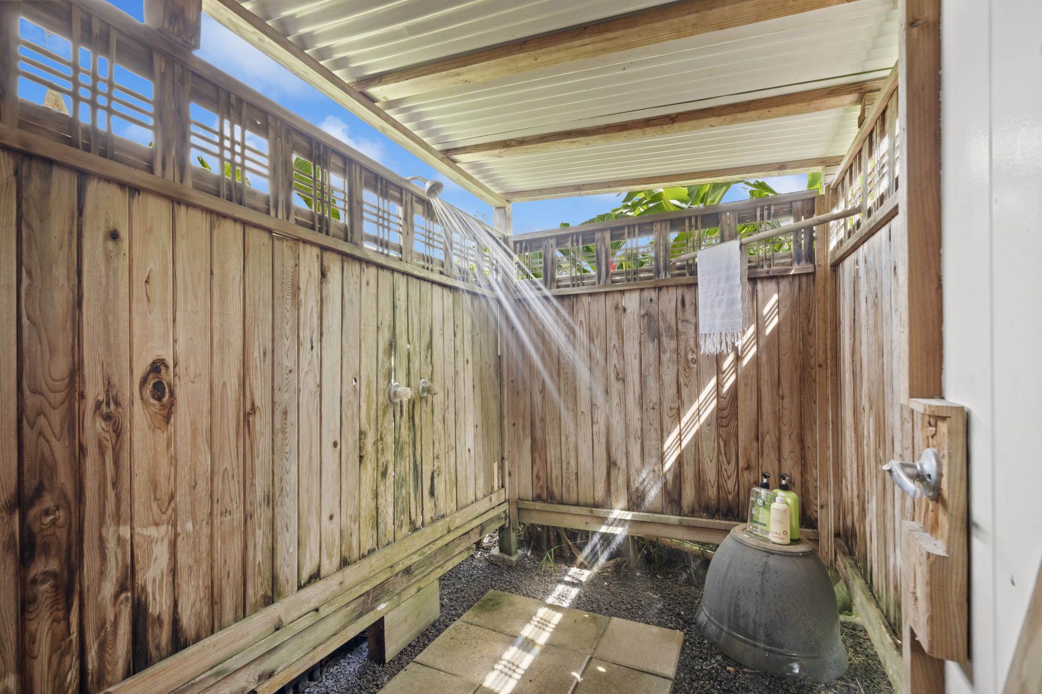 A separate ohana unit, currently in use as a pottery studio, may easily be used as an additional bedroom, a private retreat for guests, or a potential rental. There's an outside shower.
