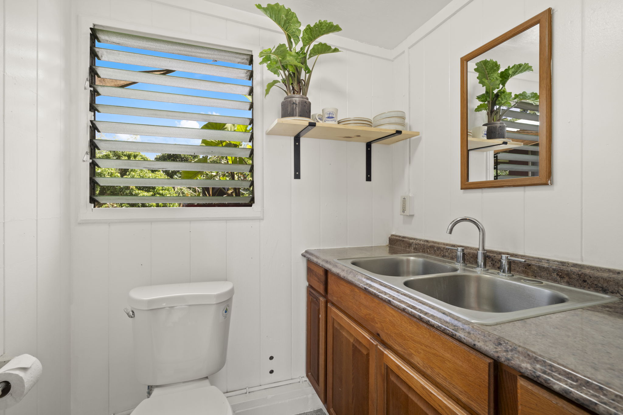 Fronting the property is a lava rock wall offering privacy with a Hawaiian touch. Inside you’ll feel welcomed by the comfortably updated, breezy open floor plan that’s full of natural light. Updates from 2016-present include new flooring, fresh interior & exterior paint, a completely renovated bathroom, and a new roof over the studio. All new cabinets, granite counters, and appliances in the remodeled kitchen. A split AC unit and on demand hot water heater have been installed.