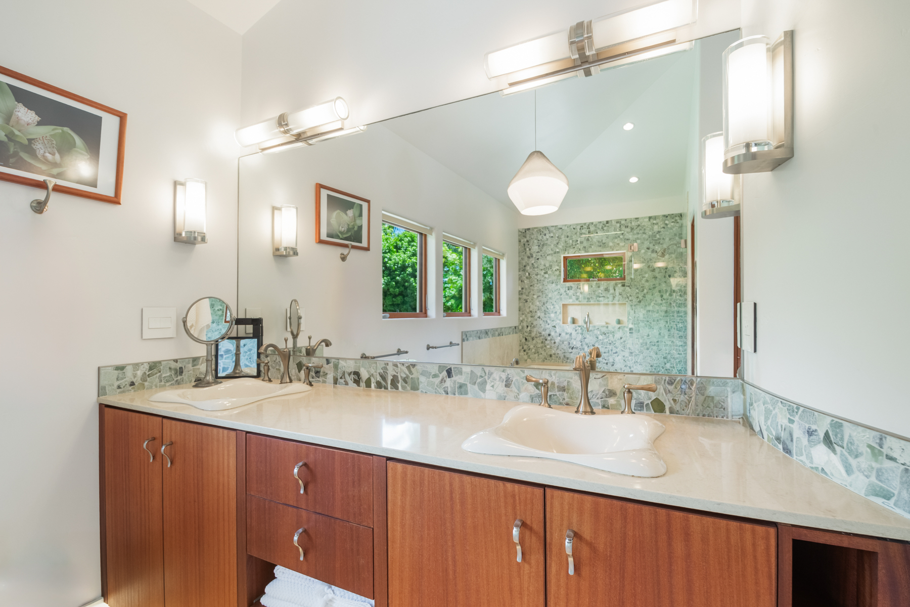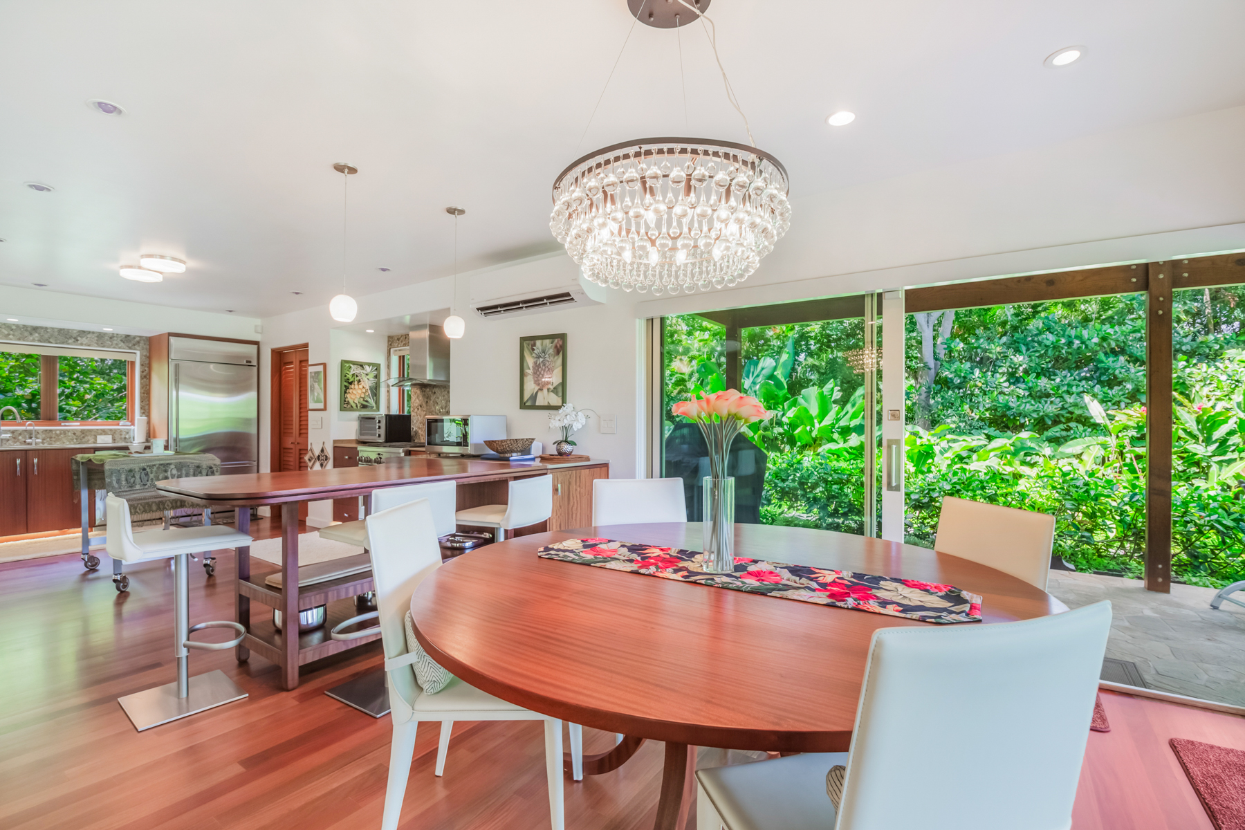 Set above one of Kauai’s most iconic stretches of coastline, this 1.3-acre property offers private, deeded access to coveted Secret Beach via a scenic footpath. Built just 10 years ago and meticulously maintained by its original owner, the 2,000 sqft residence is tucked into a lush botanical landscape with ocean views and a focus on indoor/outdoor living. Sapele wood flooring runs throughout, with tile and stone finishes in the bathrooms. A sculptural Sapele wood and glass floating staircase anchors the two-story layout. Upstairs, the main living space opens to an expansive lanai with sweeping ocean and sunset views. Multiple sliding doors and well-placed windows bring in natural light and steady trade winds, blending the interior spaces with the surrounding gardens. The home is fully air-conditioned and equipped with a whole-house water purification system, electric tankless water heater, and a 14-panel owned photovoltaic system. Additional highlights include a dedicated dance or exercise room, a tropical outdoor shower off the half bath, and copper gutters and trim. Infrastructure is in place to support future additions, including underground electrical for a potential pool. An attached garage and carport offer ample storage for all the gear needed to enjoy Kauai’s outdoor lifestyle. Select custom furnishings are included, and concept plans are available to expand the residence into a 3-bedroom, 3.5-bath estate. A private, well-executed retreat in one of the North Shore’s most sought-after locations–just minutes from Kilauea town, the historic lighthouse, world-class golf in Princeville, and a collection of Kauai’s finest beaches.