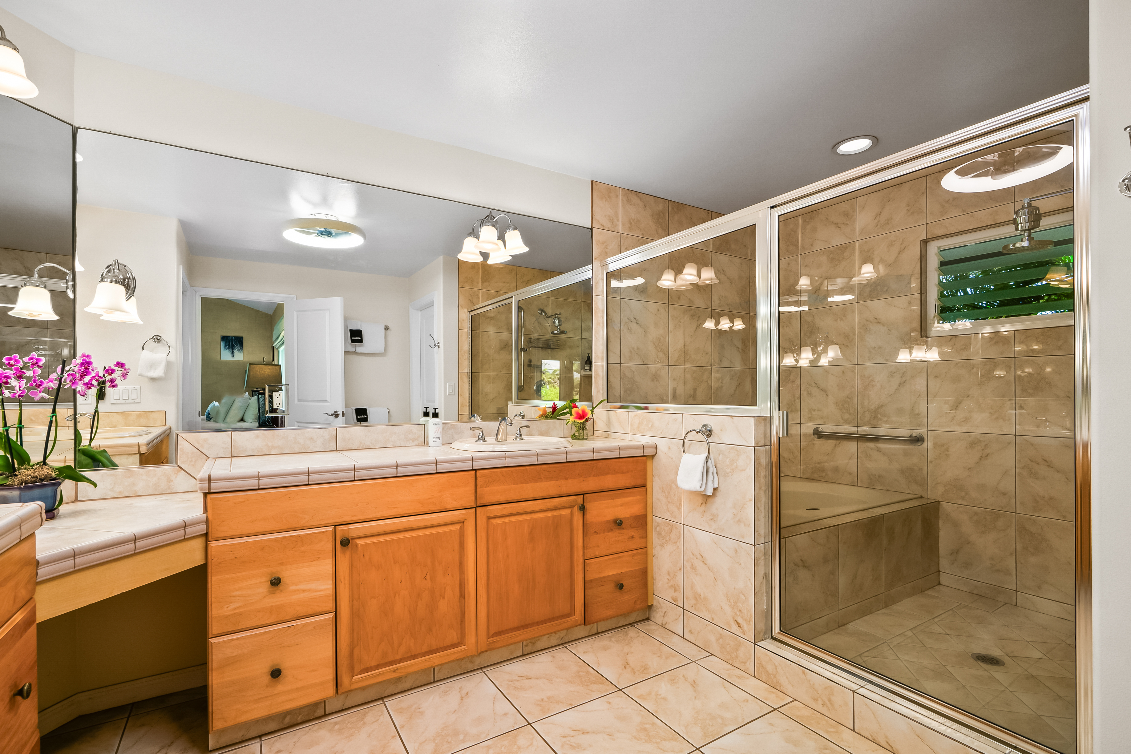 On the lower level, four bedrooms, plus an office converted into a 5th bedroom, offer ample space for extended family and guests. The primary bedroom suite boasts a private lanai and a beautiful ensuite bath complete with walk-in shower and soaking tub. The second bedroom suite is oversized with its own sitting area and attached bathroom.