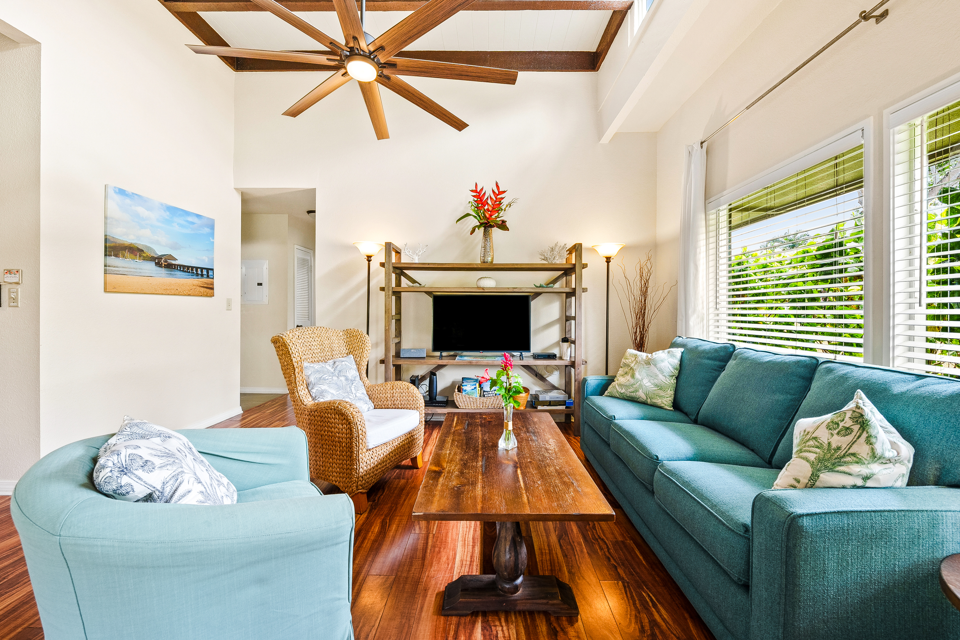 Priced to Sell! Light-filled end unit surrounded by private gardens at Puamana! #26A is an ideal, single story floor plan with soaring ceilings and luxury finishes. Enjoy morning coffee or afternoon Mai Tai’s on either of the two covered lanais. This two-bedroom townhome offers a comfortable living room with a lovely open beam ceiling, large picture windows, and a slider opening up on a private garden lanai. The spacious kitchen connects seamlessly with the dining area and features quartz counter tops and upgraded recessed lighting. The large primary suite has its own renovated en-suite bathroom, a walk-in closet, and a private lanai. The guest bedroom and bath also offer privacy and tropical views. Take advantage of full-size laundry and additional exterior storage space perfect for storing surf boards and other beach gear. Ideally located in the center of the complex, close to amenities. Take a dip in the pool after a day in the sun. Delight in fresh flowers from Puamana’s private cutting garden. Stroll across to the golf course, the perfect place to catch the sunset! Puamana is also located near restaurants & bars, shopping, secluded beaches, the Makai Golf Course, and just a short drive to world-renowned Hanalei Bay. Beautifully decorated, #26A is being offered fully furnished including new living room and lanai furniture, plus a brand new washer and dryer. Sold turn-key as an established vacation rental, nothing to do but relax and enjoy!