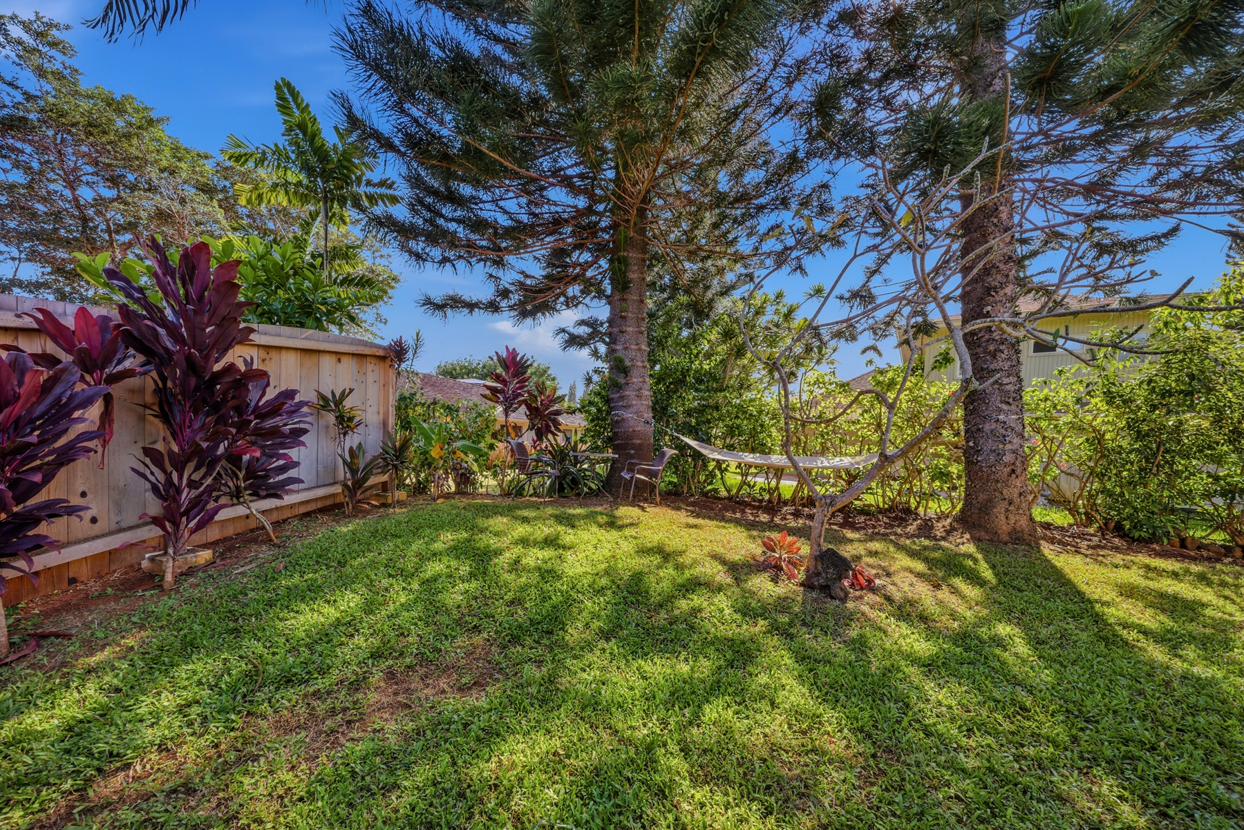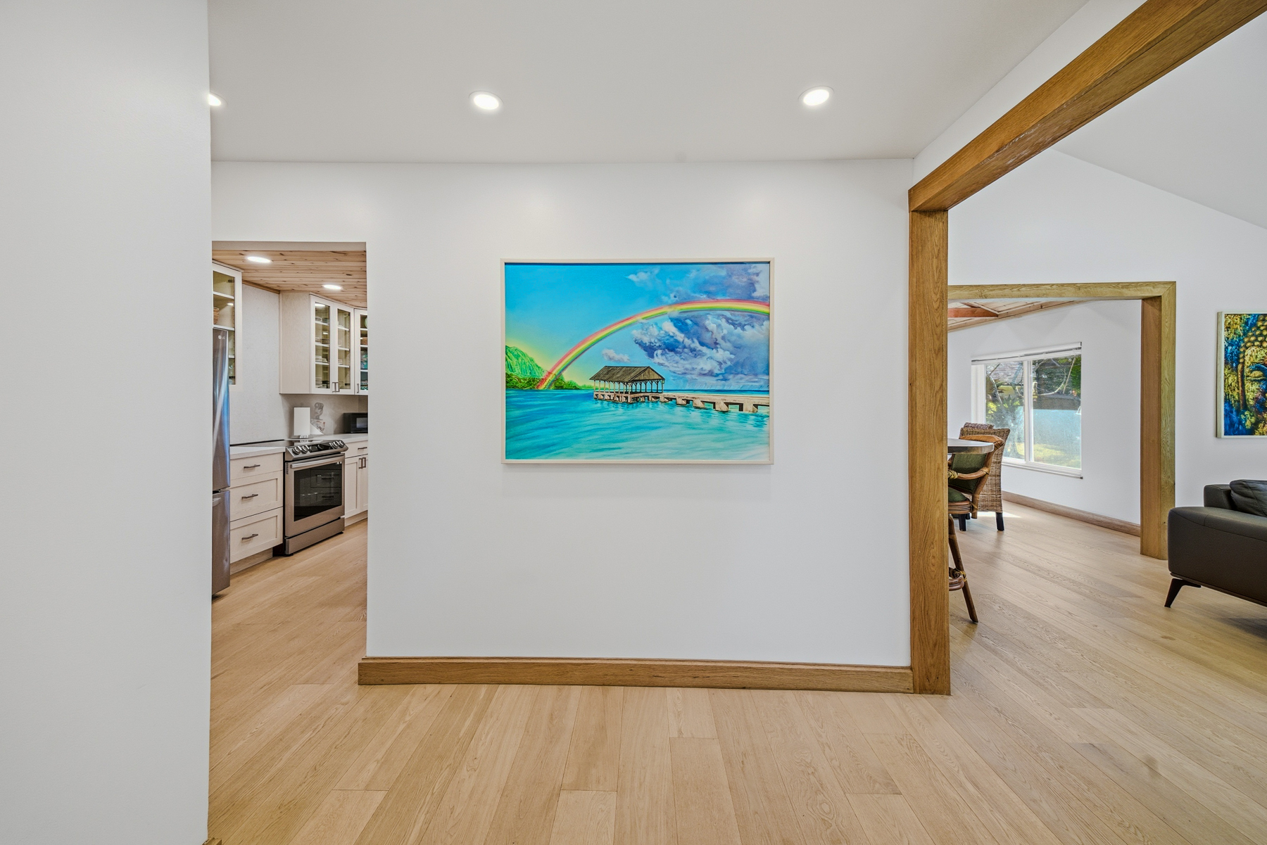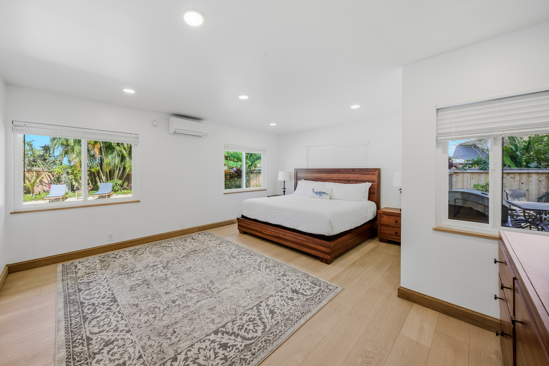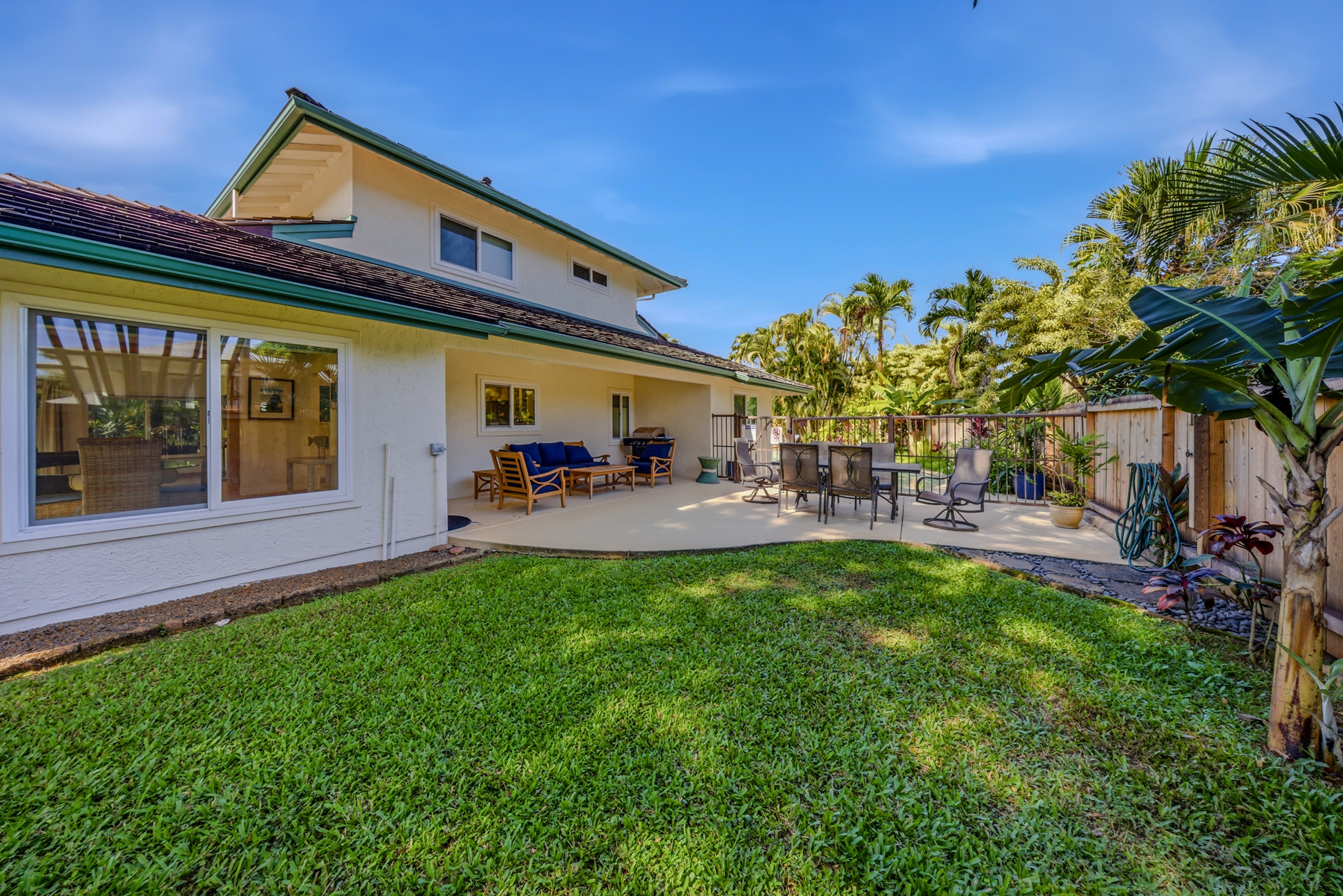 Extensively remodeled and turnkey, this 2-bedroom, 2-bath home offers a clean and modern retreat in the heart of Kauai's North Shore. The renovation which was just completed at the end of 2024 includes oak flooring throughout, custom oak trim, new kitchen and bathrooms, all new lighting, air conditioning throughout, new interior and exterior paint, new fencing, and a new pool heater with a saltwater filtration system, as well as numerous other upgrades. The comforts of this home extend outside with a private, fenced-in pool that is surrounded by newly installed landscaping and irrigation, as well as an outdoor dining patio that is ideal for hosting guests.