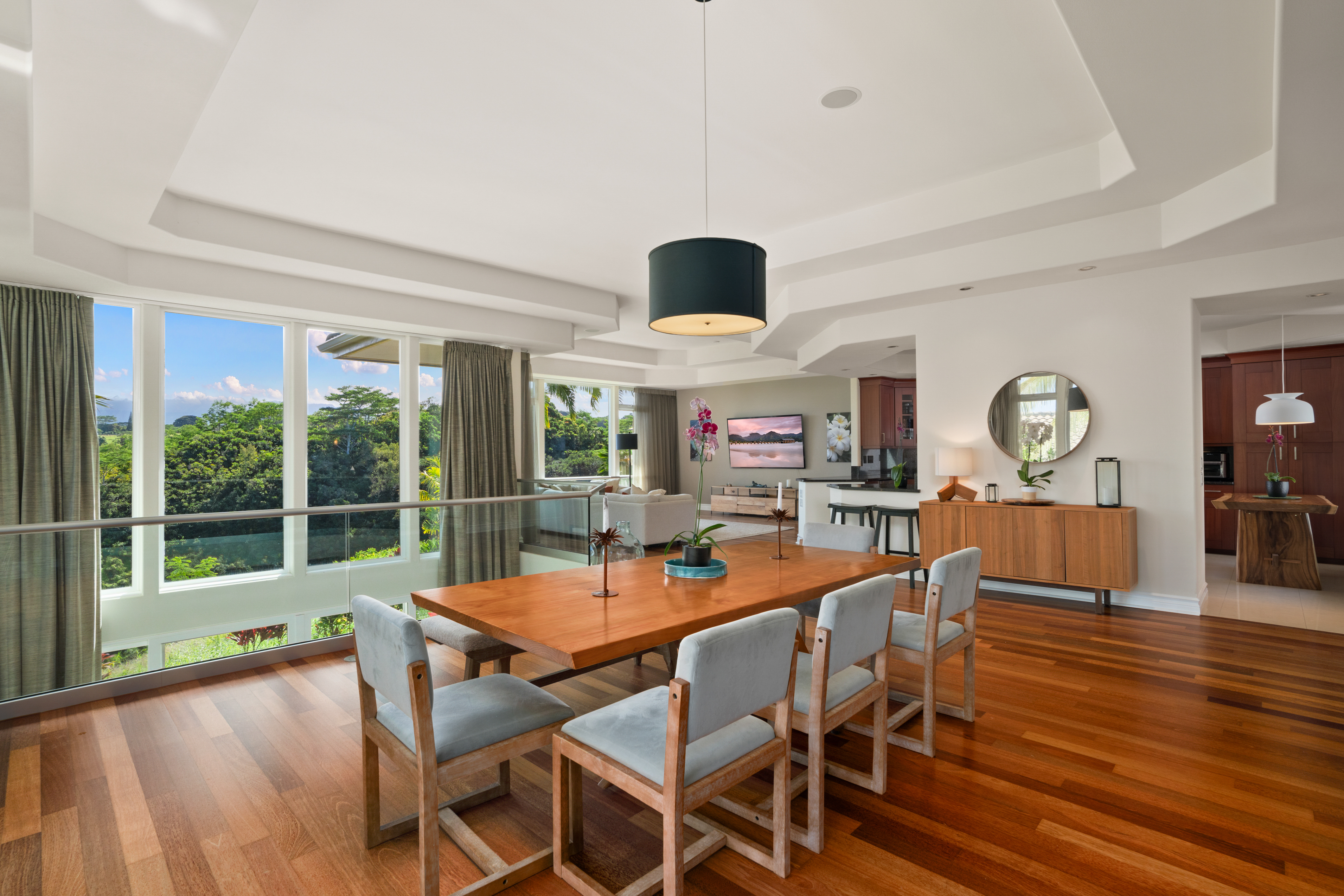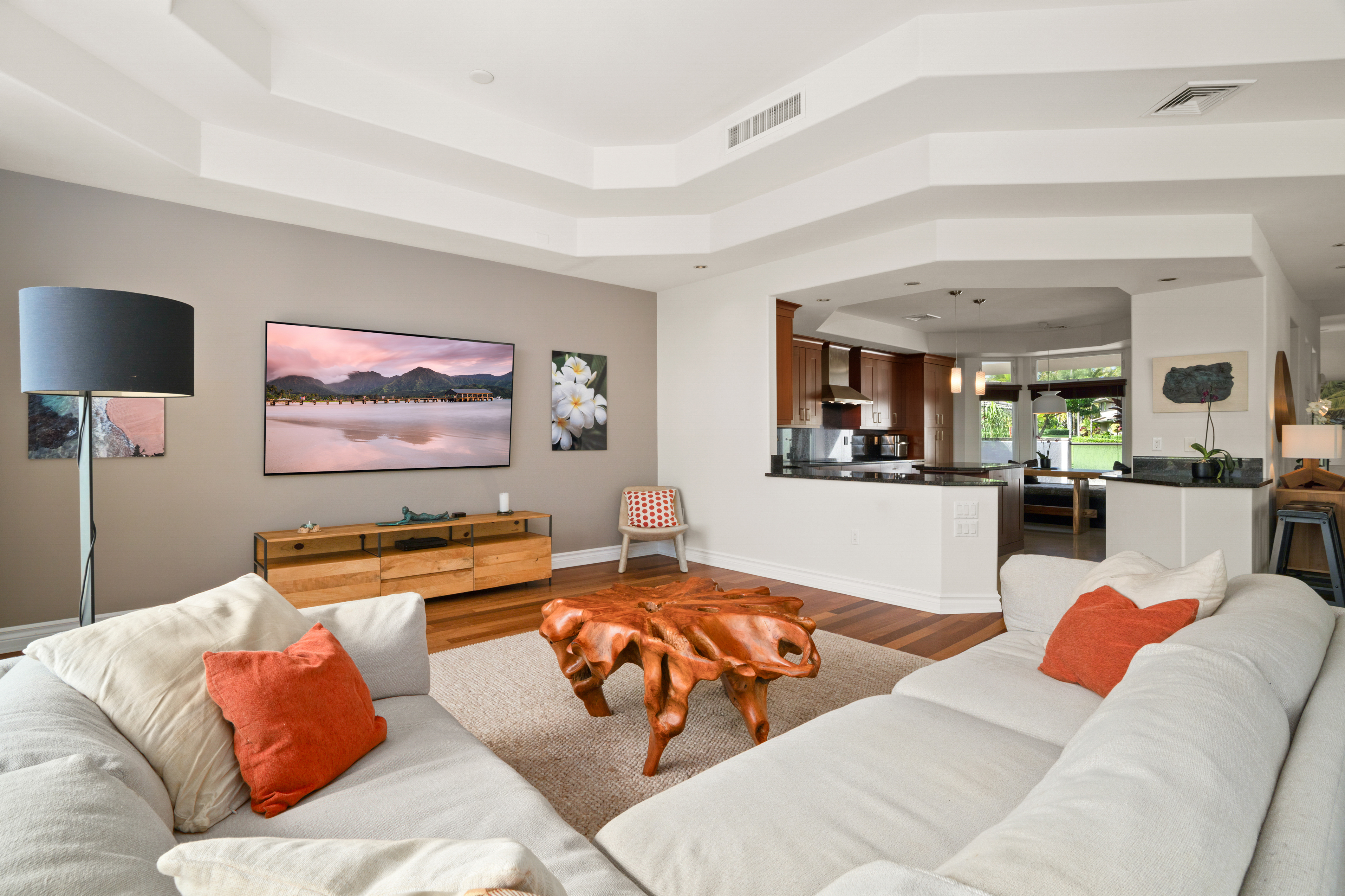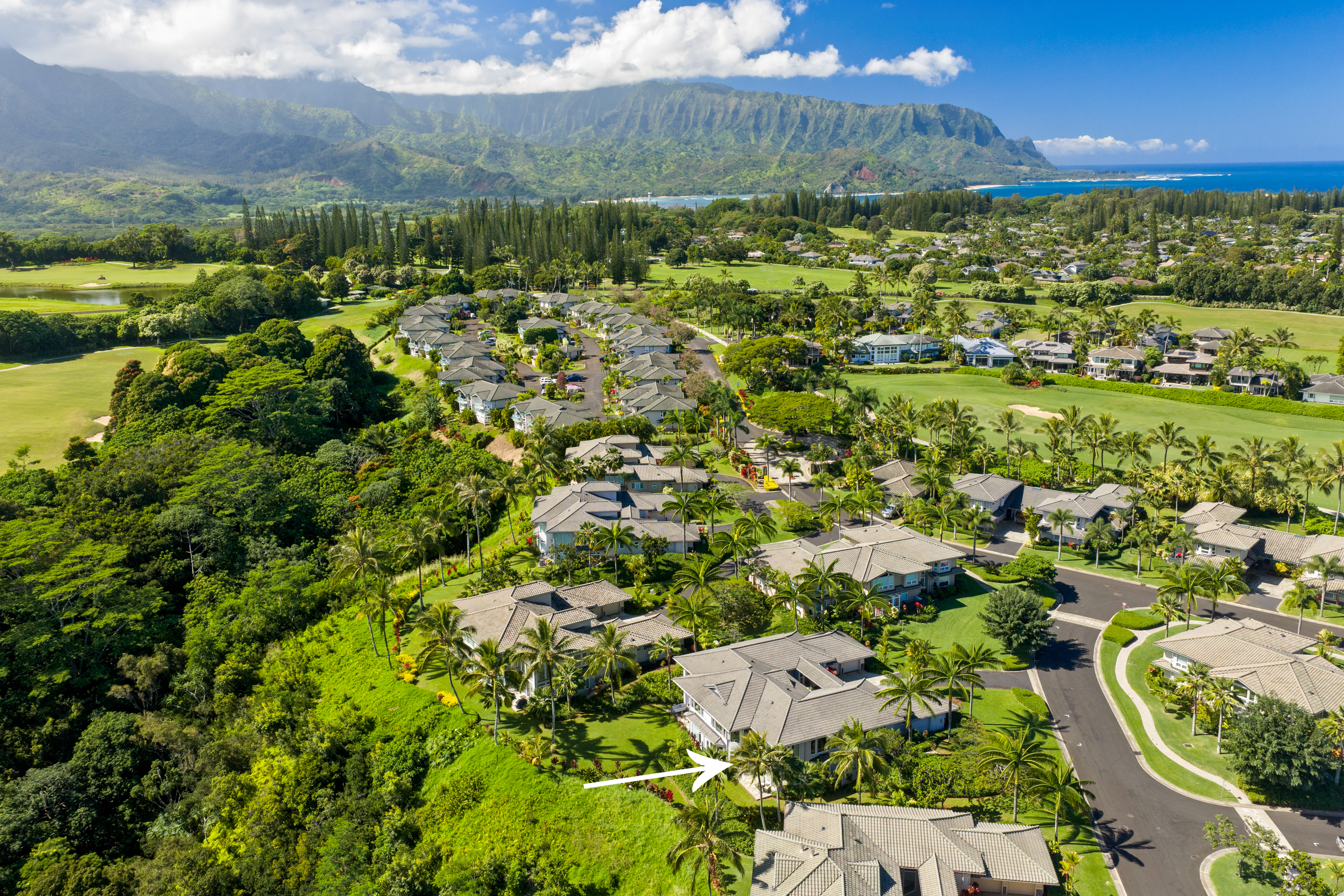 Nestled on Kauai’s North Shore, Ka‘iulani at Princeville offers an opportunity to own within a prestigious, private community. Known for its close-knit atmosphere and surrounded by breathtaking natural beauty, Ka‘iulani makes the perfect full time residence or second home. This townhome features the largest floor plan in the community, with 3,048 square feet across two levels. The home is designed to impress, with soaring ceilings, rich hardwood and ceramic tile flooring, and a dramatic wall of glass framing sweeping views of Anini Valley and the lush mountains beyond. The upper level features a gourmet kitchen with wine cooler, open living and dining areas, one en-suite bedroom, and a half bath. Zoned central air conditioning provides consistent comfort throughout. The lower level includes the primary suite, an additional guest bedroom, a second living area with wet bar, and access to a private lanai. The primary suite offers stunning valley views, and a spacious bath with custom walk-in shower and soaking tub. The suite walks out to a private courtyard and an additional room currently in use as a private gym/yoga studio, a unique feature. Residents enjoy resort-style amenities, including three heated terraced pools, a lava rock spa, and beautifully landscaped grounds. A scenic half-mile lighted walking path with water features winds throughout the property. Attached two-car garage and plenty of storage.