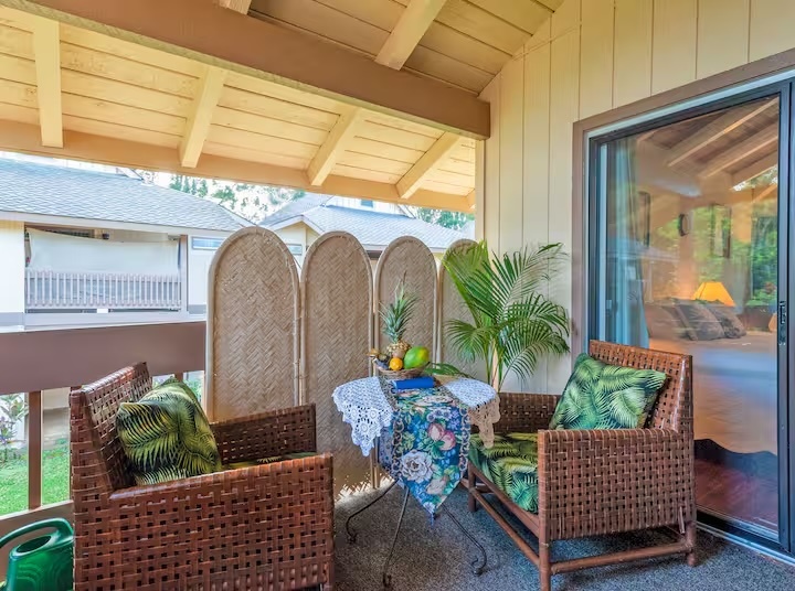 Community highlights include a resort-style pool and relaxing hot tub, surrounded by a lush green space at the center of the complex – perfect for unwinding or gathering with friends. The beautifully landscaped grounds are accented by old-growth tropical plants and mature trees, creating a serene and natural Hawaiian setting.