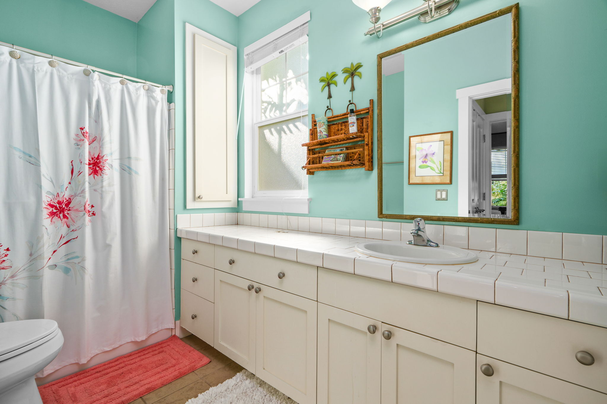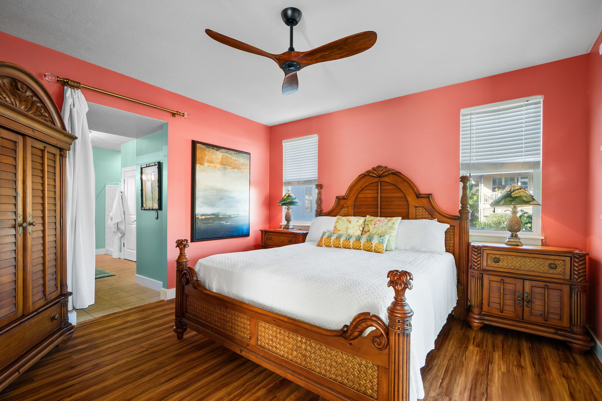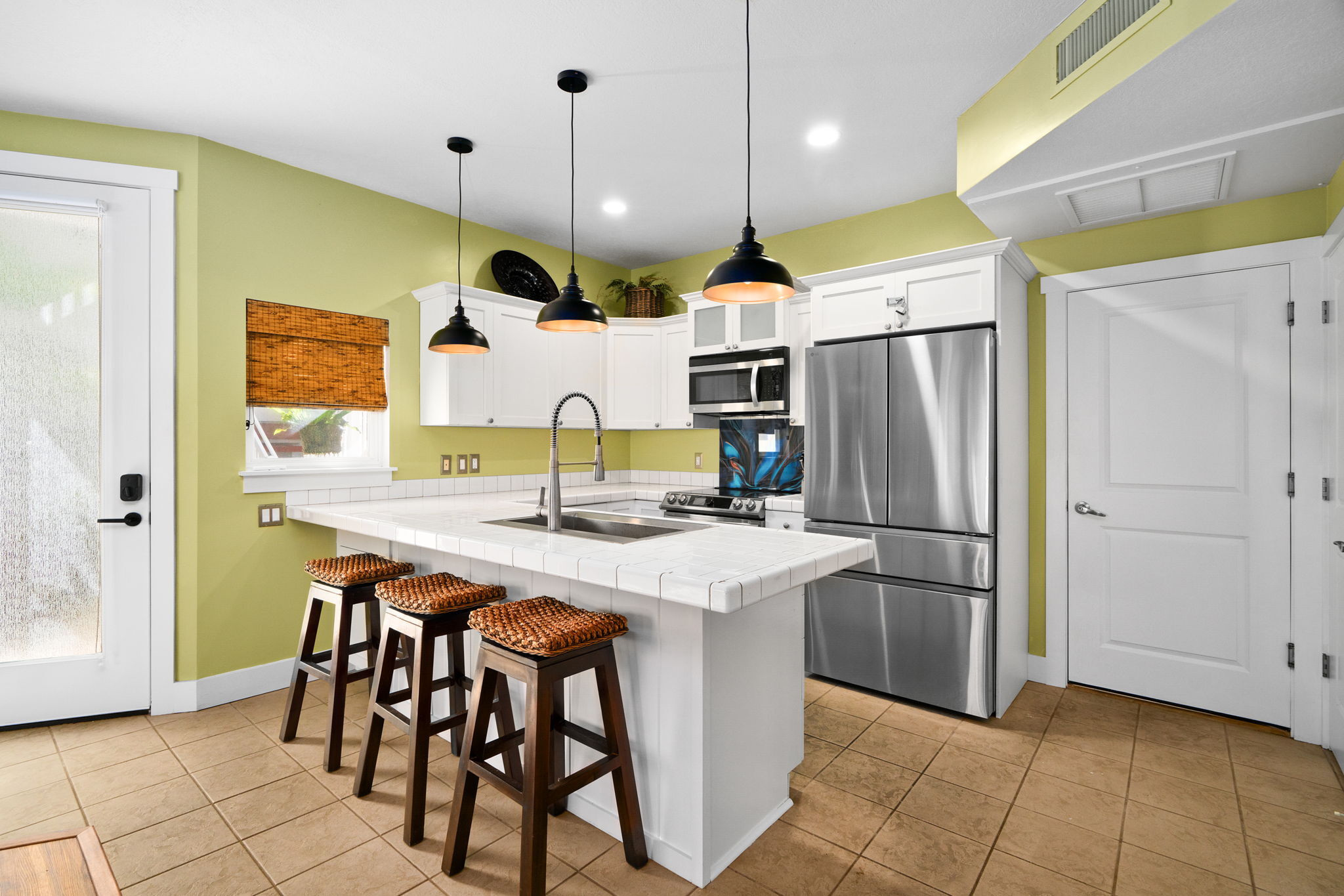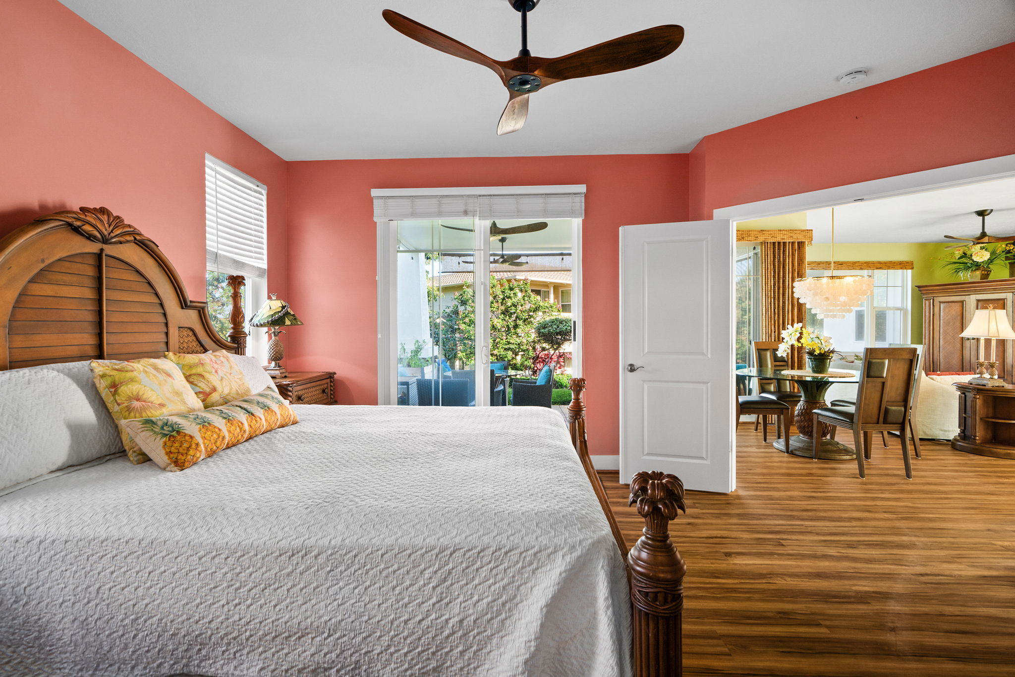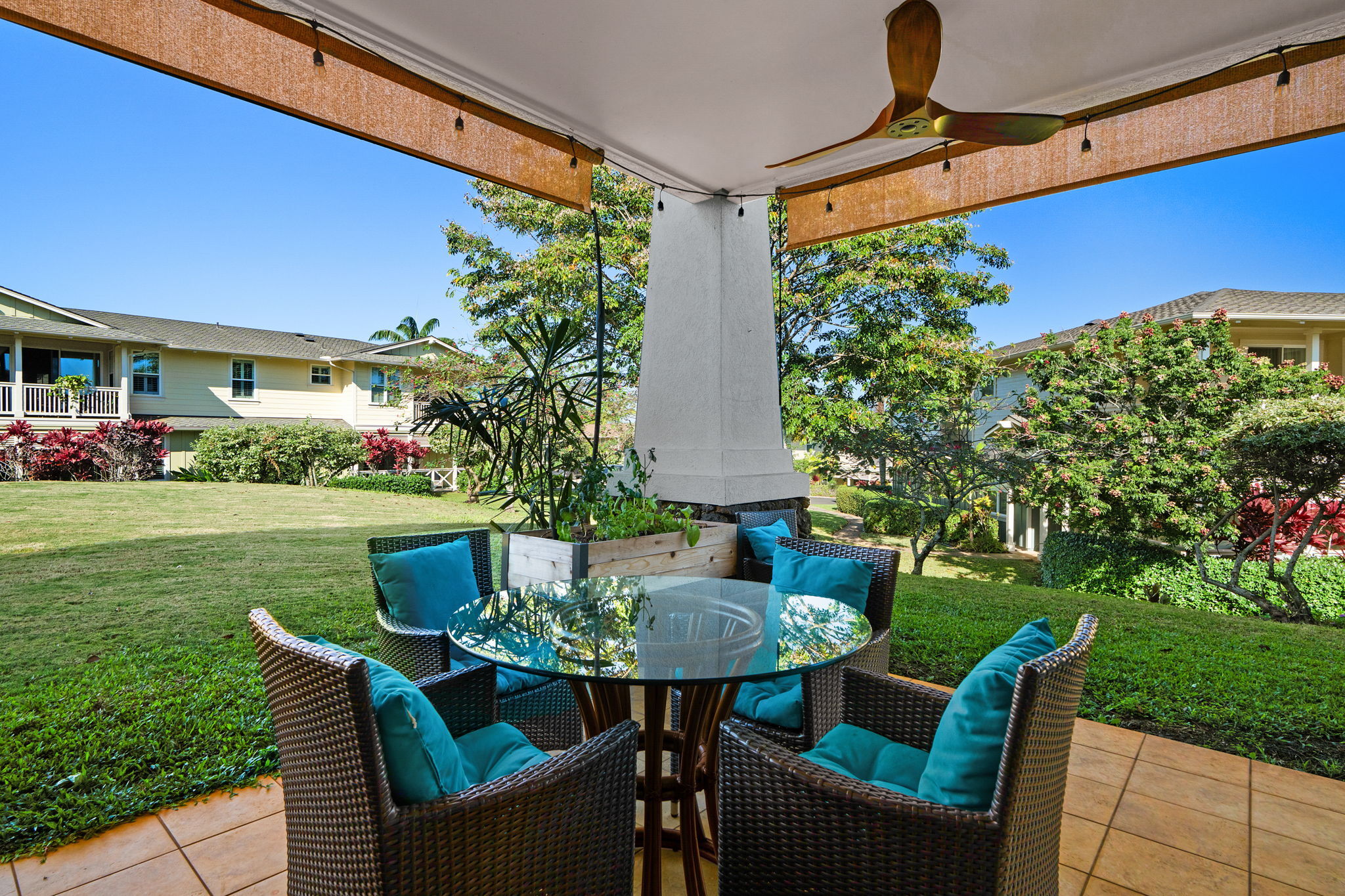 Welcome to Plantation at Princeville 1311, a well-maintained 2-bedroom, 2-bath condo offering comfort, privacy, and island living. Tucked away from the main road, this home features one of the most private backyards in the community, with favorable north- and west-facing exposure. The open-concept living, dining, and kitchen areas are filled with natural light and open to a covered lanai with hardwood ceiling fans, pull-down sun screens, and decorative string lighting–ideal for relaxing or entertaining. Luxury vinyl plank flooring in a koa pattern, upgraded lighting, and enhanced storage are found throughout. A barn door allows the guest bedroom to function as a second primary suite. The kitchen includes an induction range with air fryer, convection broil, bread proofing, and dehydration settings; a stainless steel sink with a commercial-style faucet; added pantry shelving; and a newer three-rack dishwasher. Additional upgrades include a newly installed A/C unit, on-demand water heater, upgraded electrical panel, LG washer and dryer, newer TV, upgraded blinds, and six DC hardwood ceiling fans, including three on the lanai. The attached single-car garage offers direct access and ceiling-mounted storage racks. Plantation at Princeville offers a pool with a waterfall, a hot tub, BBQ areas, a clubhouse, a fitness center, an on-site resident manager, and guest parking. Located minutes from beaches, golf, tennis, shopping, dining, and scenic trails. Offered furnished and ready to enjoy.