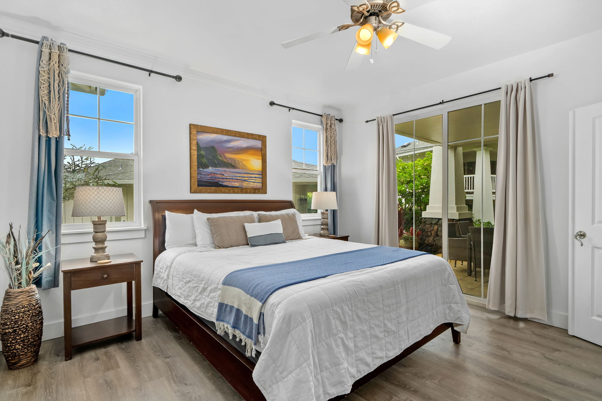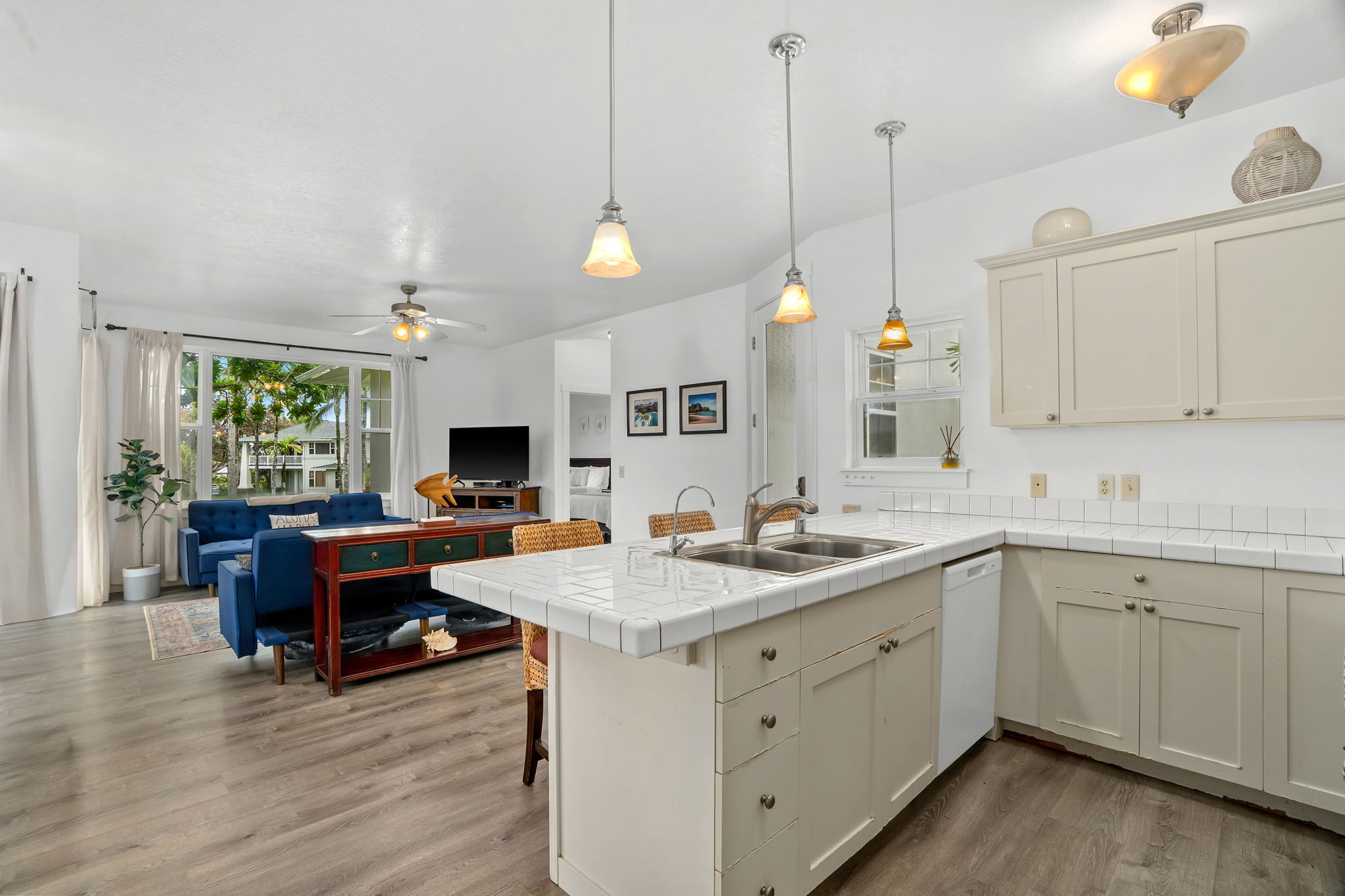 Step inside to an open-concept, island-inspired layout designed for effortless living. High ceilings and oversized slider doors fill the home with natural light and breezes, creating a seamless flow between the kitchen, living, and dining areas. The spacious design extends to covered lanai framed by tropical greenery–ideal for morning coffee, afternoon lounging, or entertaining.