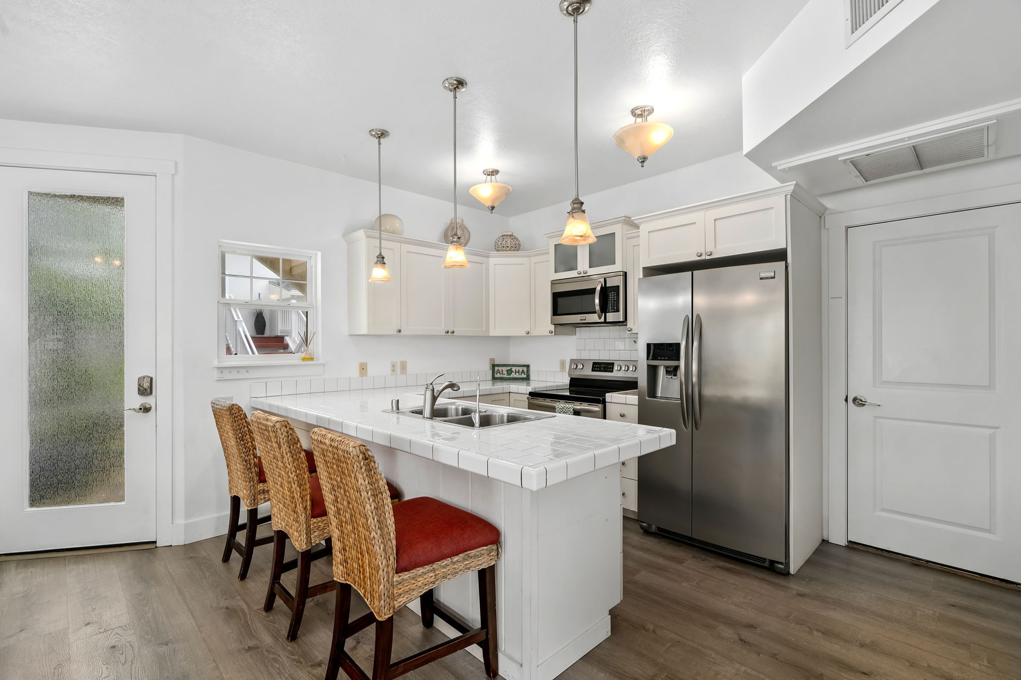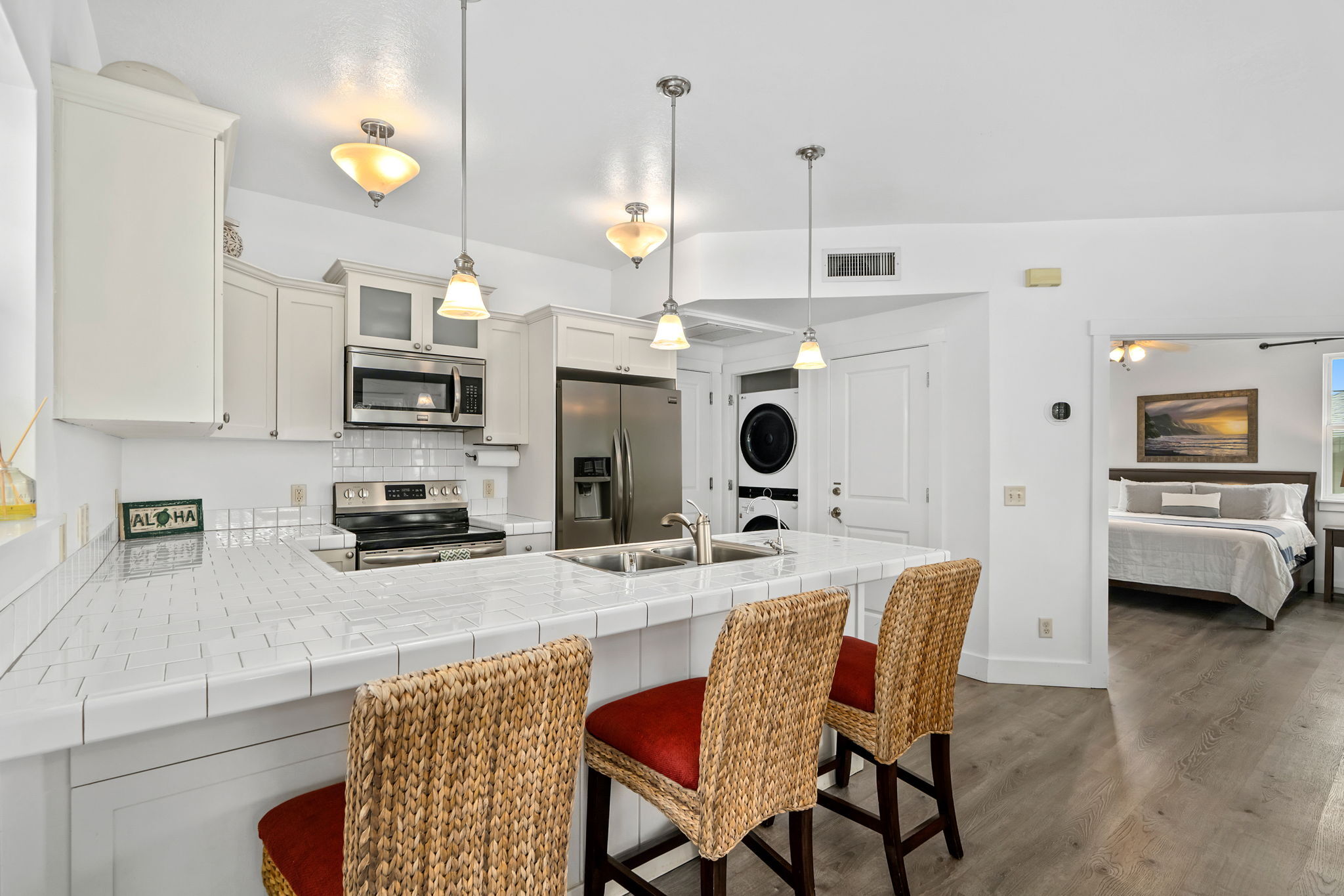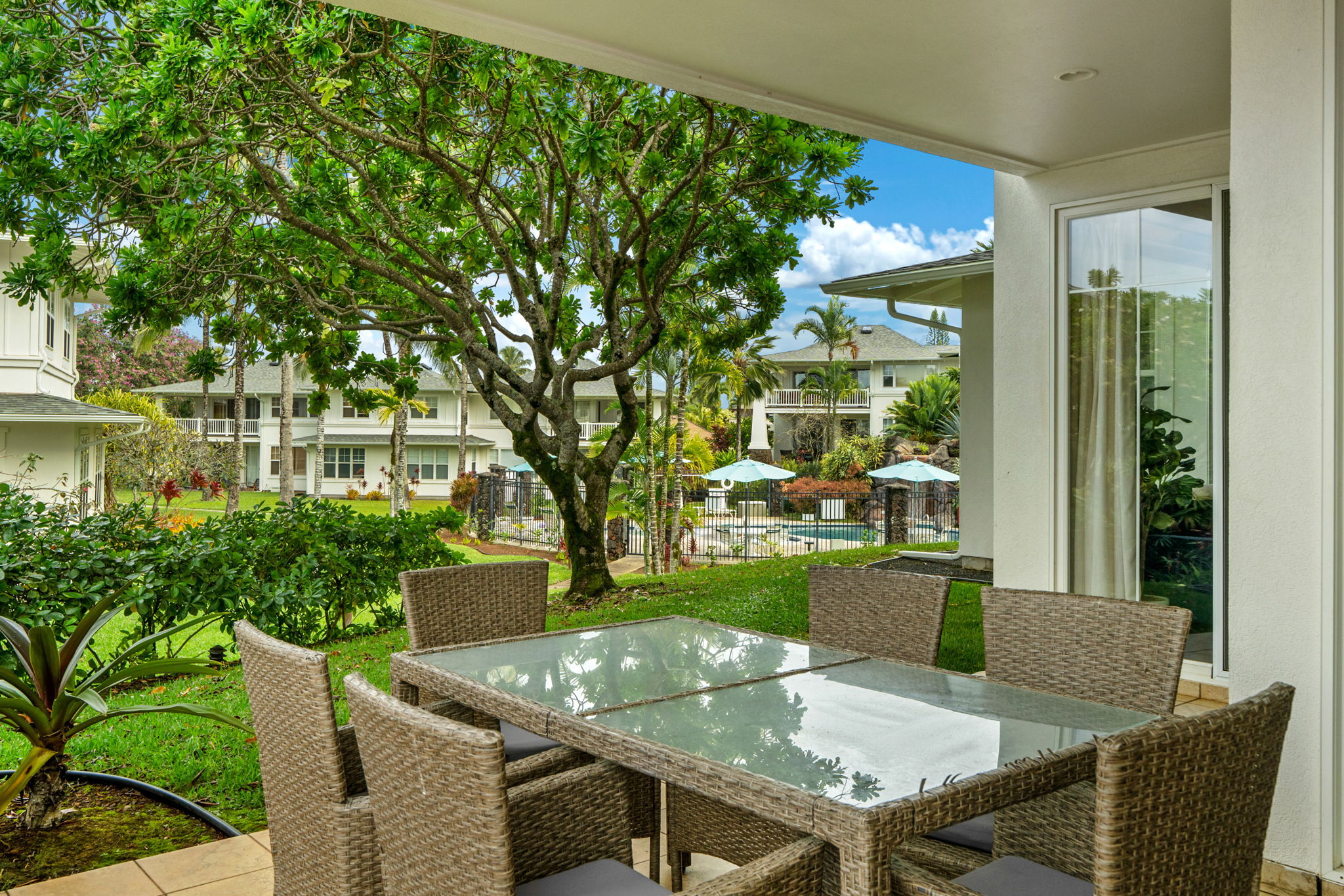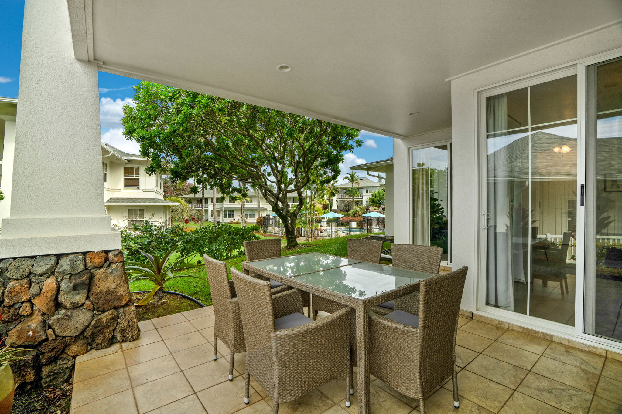 With central air conditioning, quality furnishings, and a warm, welcoming ambiance, this condo is truly move-in ready. As a ground-floor unit, it also offers the rare convenience of a single-stall garage with direct interior access. The greenspace just off the lanai provides easy access to the pool and BBQ area, enhancing the resort-style island lifestyle.