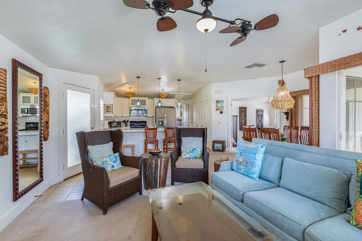 Welcome to PLANTATION AT PRINCEVILLE –one of the few communities in Princeville offering the rare combination of both a private garage and central air conditioning while also featuring a private clubhouse / gym. The complex is impeccably maintained, with new roofs, gutters and solar fans installed just two years ago and recently reduced HOA dues by nearly $500 per month, adding exceptional value to this sought-after location. This beautifully furnished 3-bedroom, 3-bath upstairs residence showcases a timeless Hawaiiana style and enjoys what is arguably one of the best locations in the community. Ideally situated directly across from the clubhouse, gym, and mailboxes, the unit is set back from the road and overlooks a lush, manicured greenbelt with sweeping views of the golf course, mountains, and waterfalls. The spacious central lanai is perfectly angled to capture both the breathtaking scenery and the cooling trade winds, creating an ideal indoor-outdoor living experience. All three bedrooms are thoughtfully separated with no shared walls, offering outstanding privacy. Custom fixtures, plantation shutters throughout, and curated island-inspired artwork enhance the tropical ambiance. This is a highly successful, independently managed vacation rental being sold fully furnished, complete with a healthy forward rental calendar–making it an exceptional turnkey investment as well as a perfect Kauai retreat. Additional highlights include a one-car garage plus an extra-long driveway with ample guest parking, ideal for owners who prefer to keep their vehicle secured. Community amenities include a clubhouse with meeting space and private gym, along with a resort-style pool area featuring a hot tub, waterfall, BBQs, and an outdoor shower. As an added bonus, the seller is willing to include the vehicle (Nissan Cube) with the sale. A rare opportunity to own a proven income-producing property in one of Princeville’s most desirable communities.