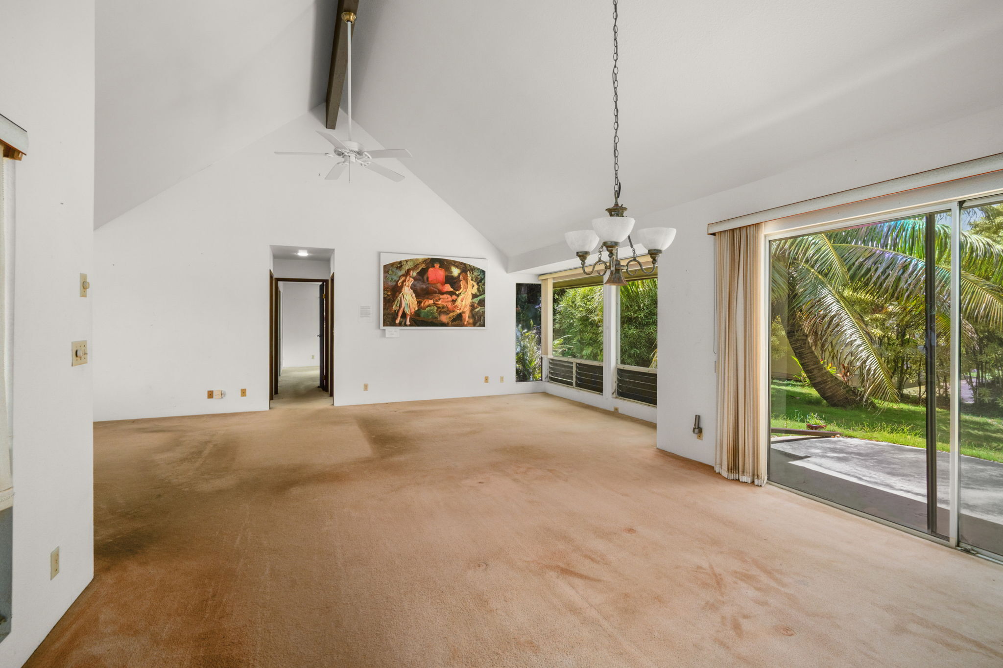 Set on a lush lot, the home has beautiful mature tropical landscaping, providing privacy and a tranquil environment. The open-concept living and dining area, paired with the high ceilings, creates a bright and welcoming space, just waiting for your personal touch.