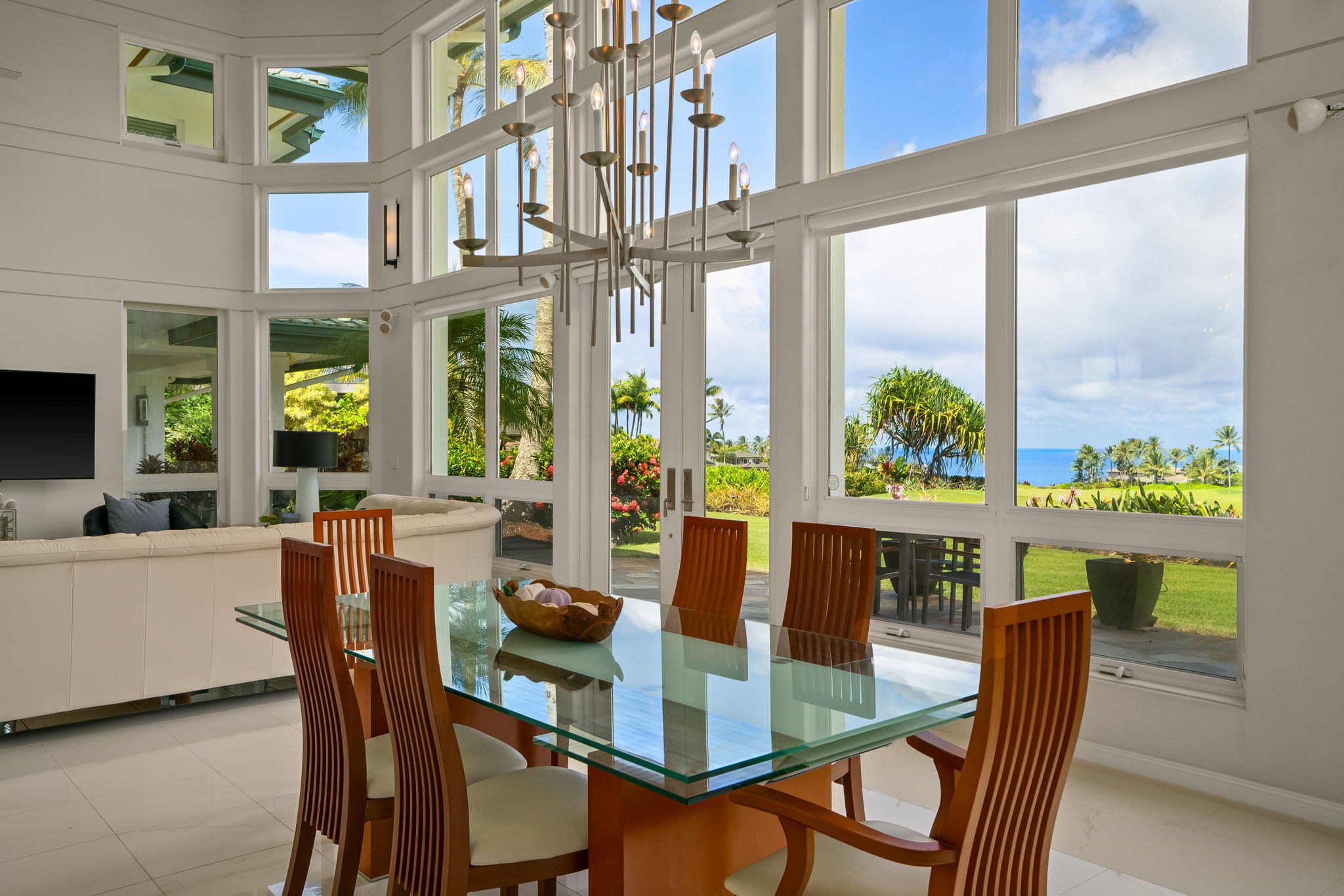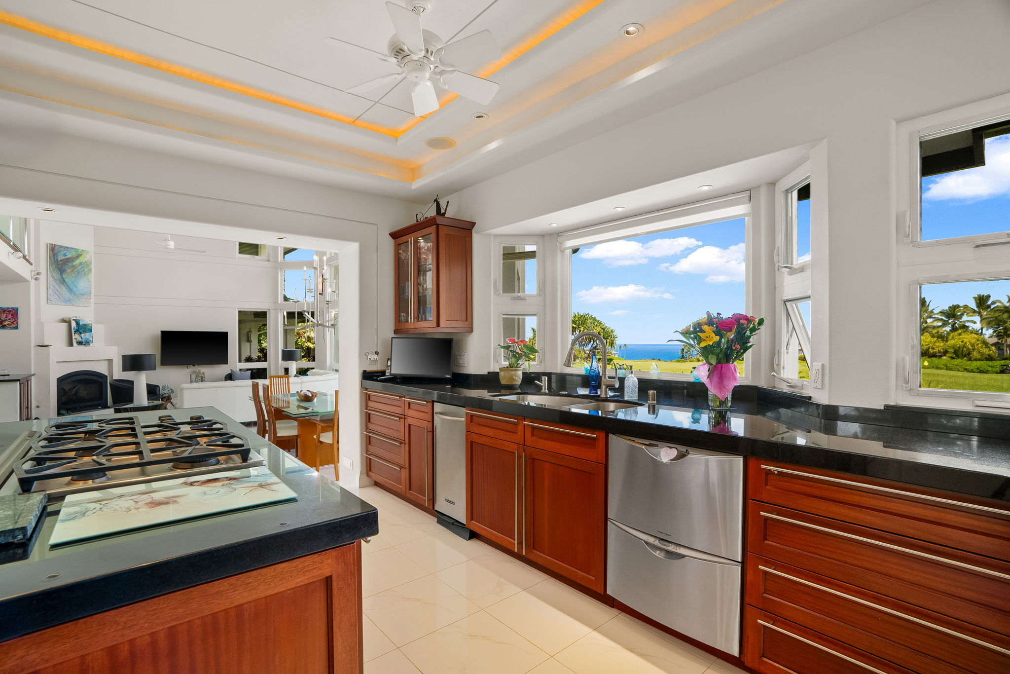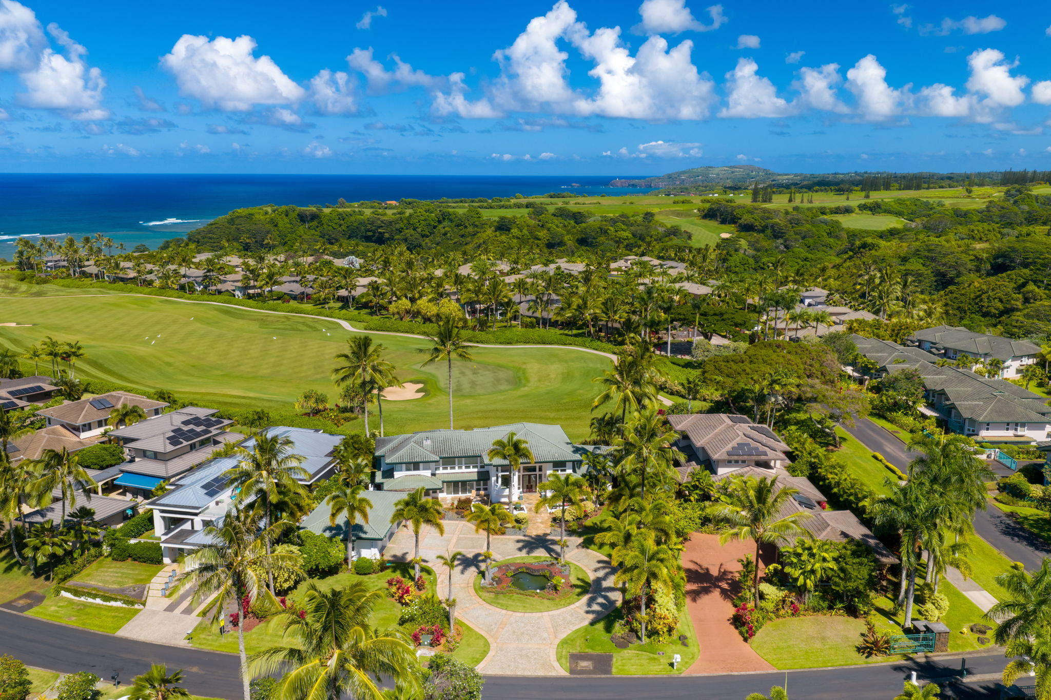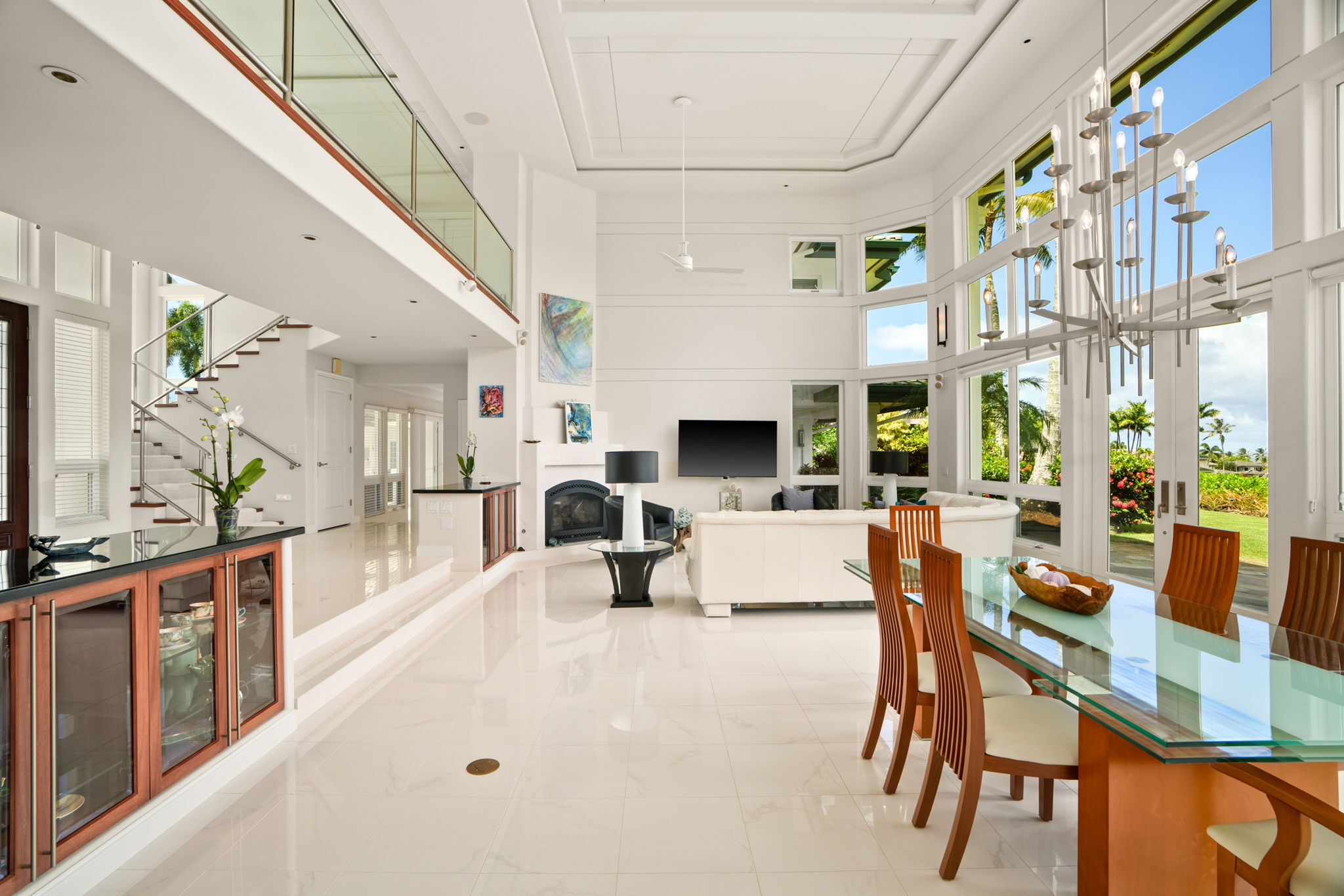 With over 4,100 square feet of interior living space, you step through a formal foyer into a dramatic Grand Room with soaring ceilings and a sweeping wall of windows. The view–stretching from the Prince Golf Course to the ocean–is uninterrupted and visible from the Grand room.kitchen, den, office, all three bedrooms, and the luxurious master bath.