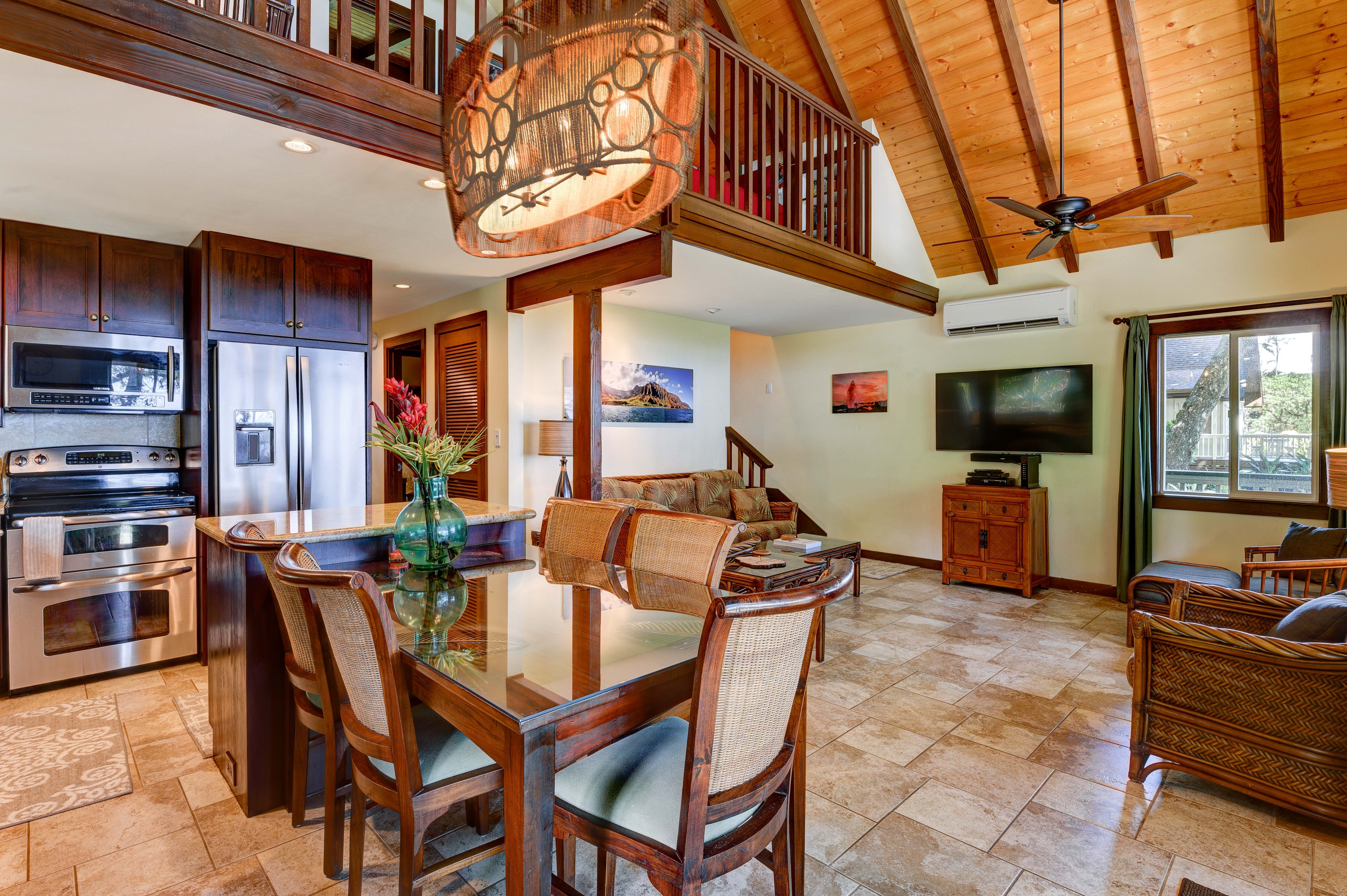 The open-concept living area features designer furnishings, a large flat-screen TV, and seamless indoor-outdoor flow to a spacious wraparound lanai–perfect for dining, lounging, and taking in the ocean breezes. The gourmet kitchen is equipped with granite countertops, state-of-the-art appliances, and ample prep space for entertaining or family meals.
