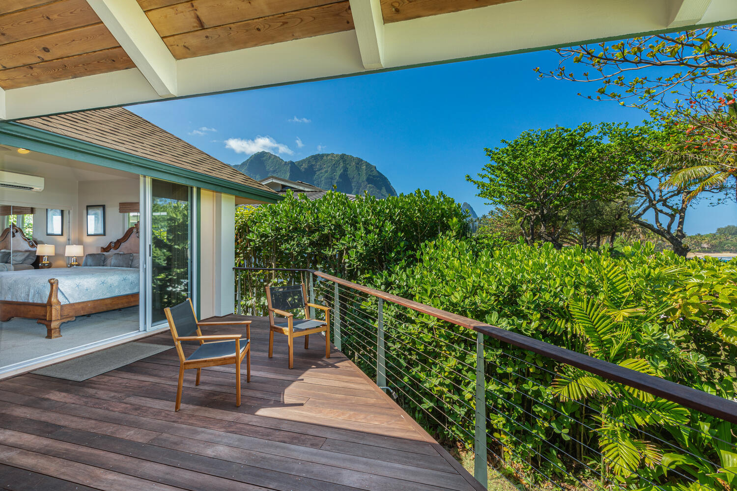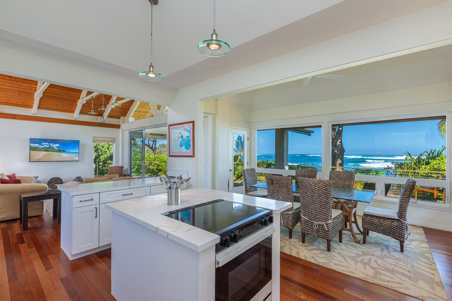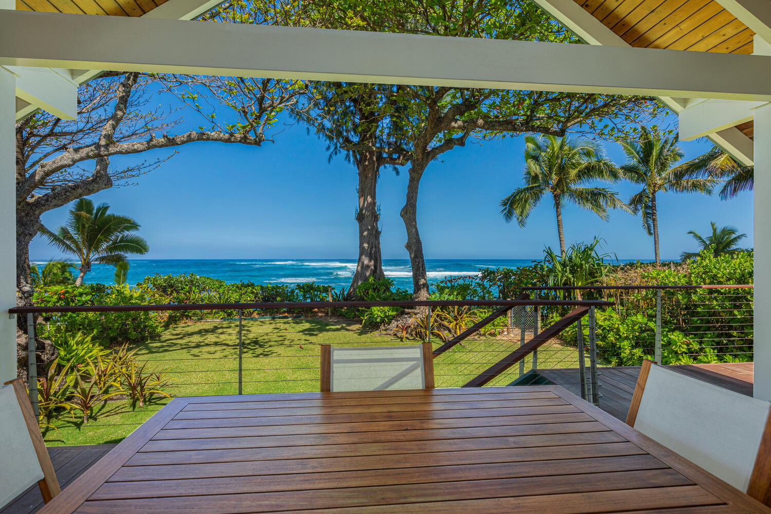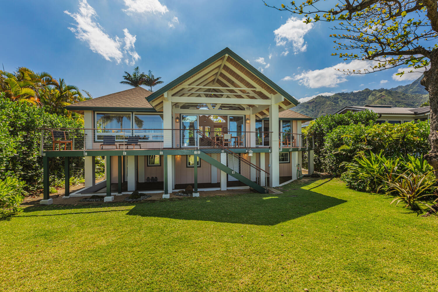 An exceptional beachfront setting for this North Shore Kauai licensed vacation rental. Positioned between a quiet rural road and a wide stretch of uninterrupted sand, the property offers direct beach access and immediate connection to the ocean. Kite surfing, diving, fishing, and windsurfing are just offshore from your lanai. The home features an open, light-filled modern floor plan designed to capture ocean views from nearly every room. A fully equipped kitchen with quartz countertops anchors the main living area. Air-conditioning provides comfort throughout. Approximately 1,000 square feet of lanai extends the living space outdoors, ideal for dining and relaxing along the shoreline. Minutes to Hanalei and Princeville, with easy access to dining, shopping, tennis, and golf.