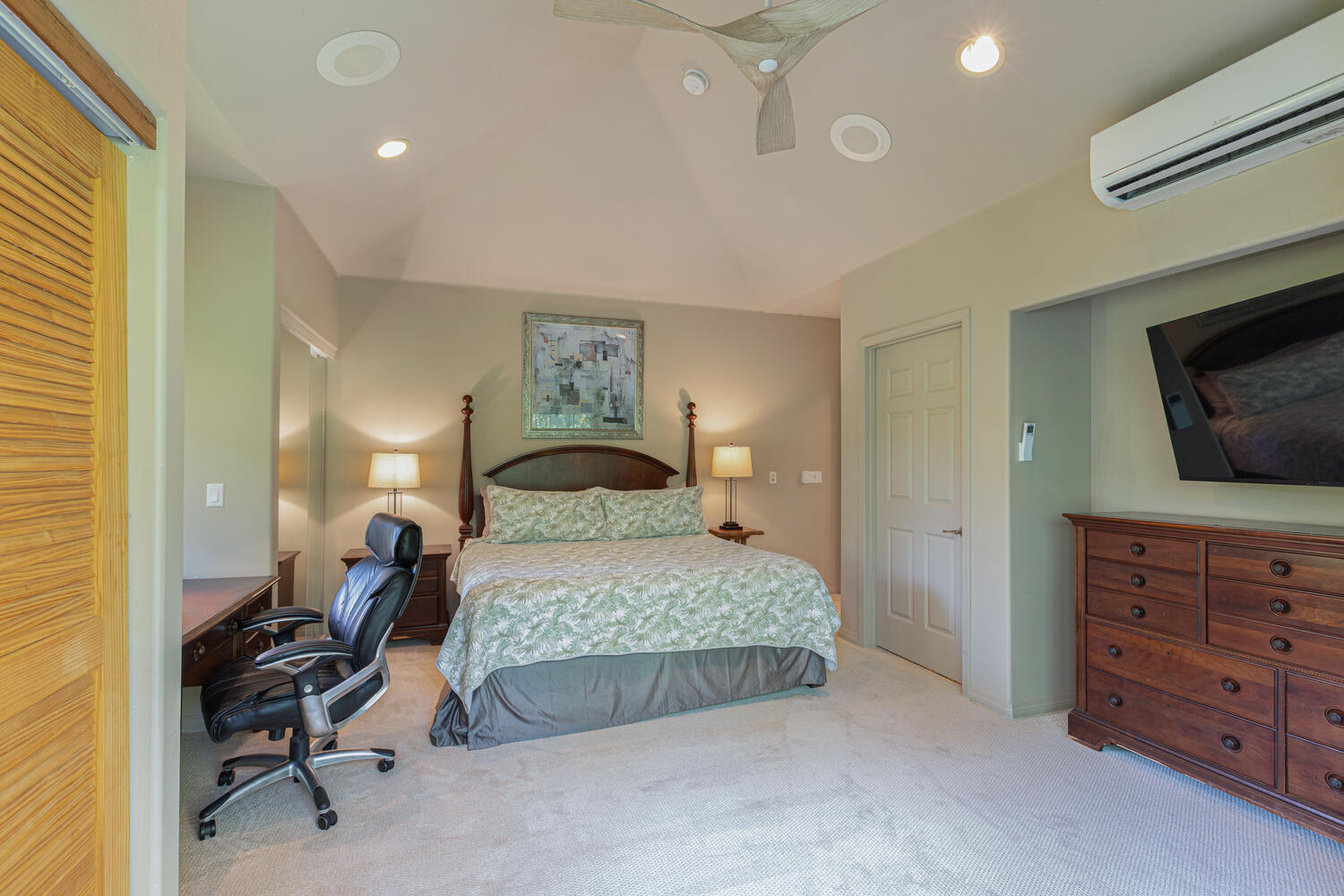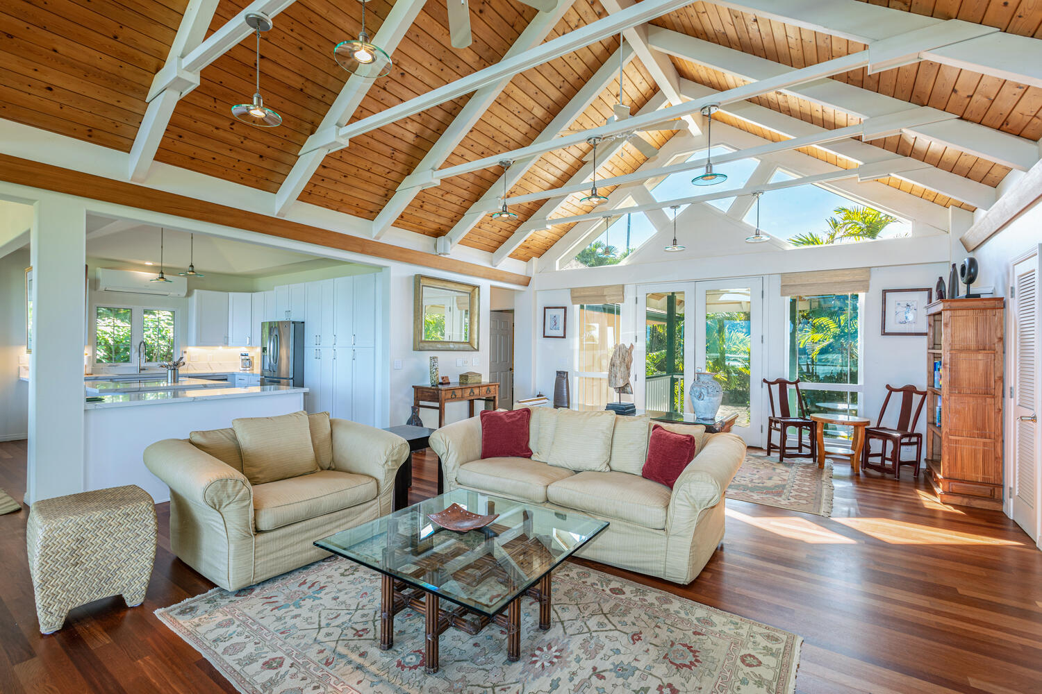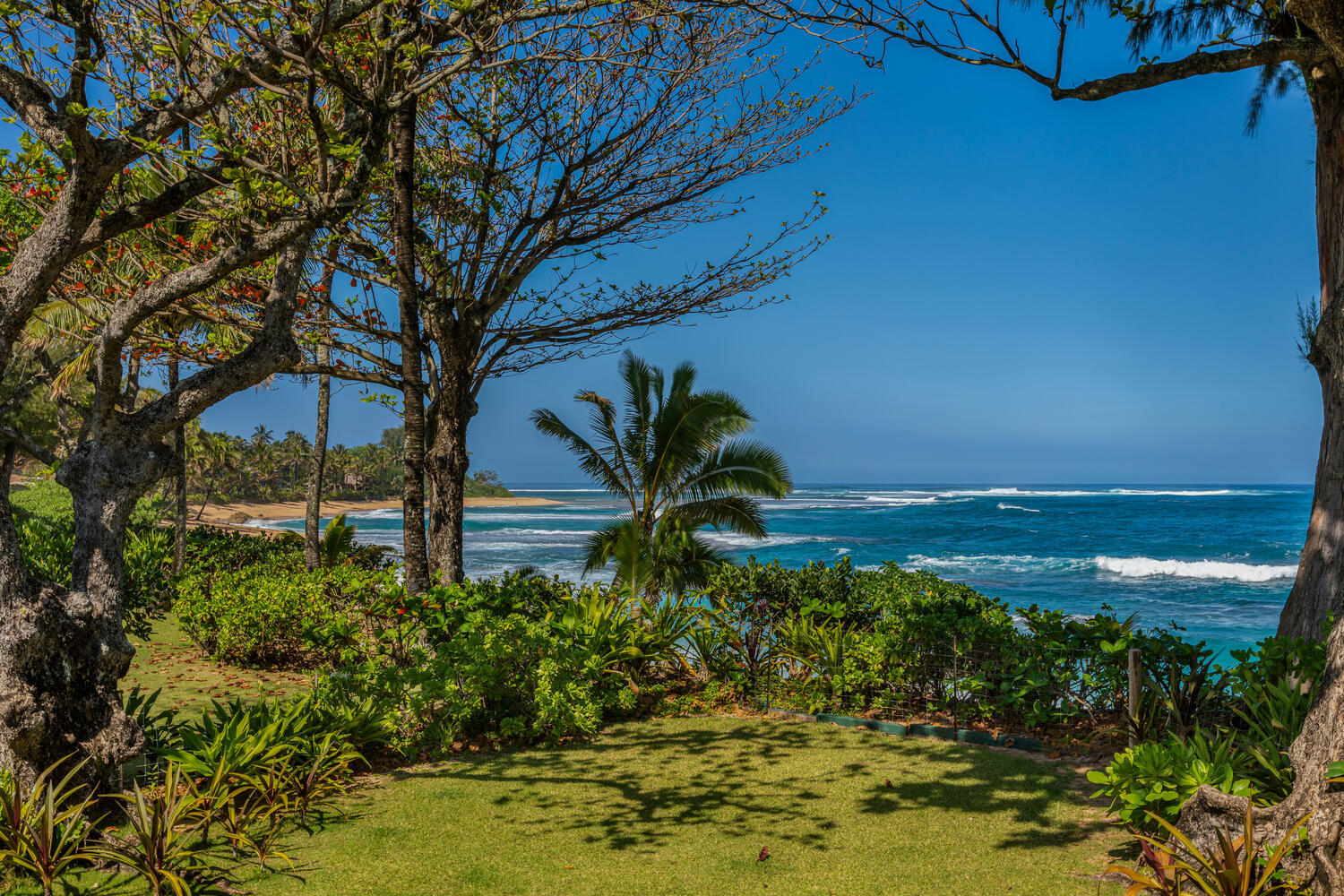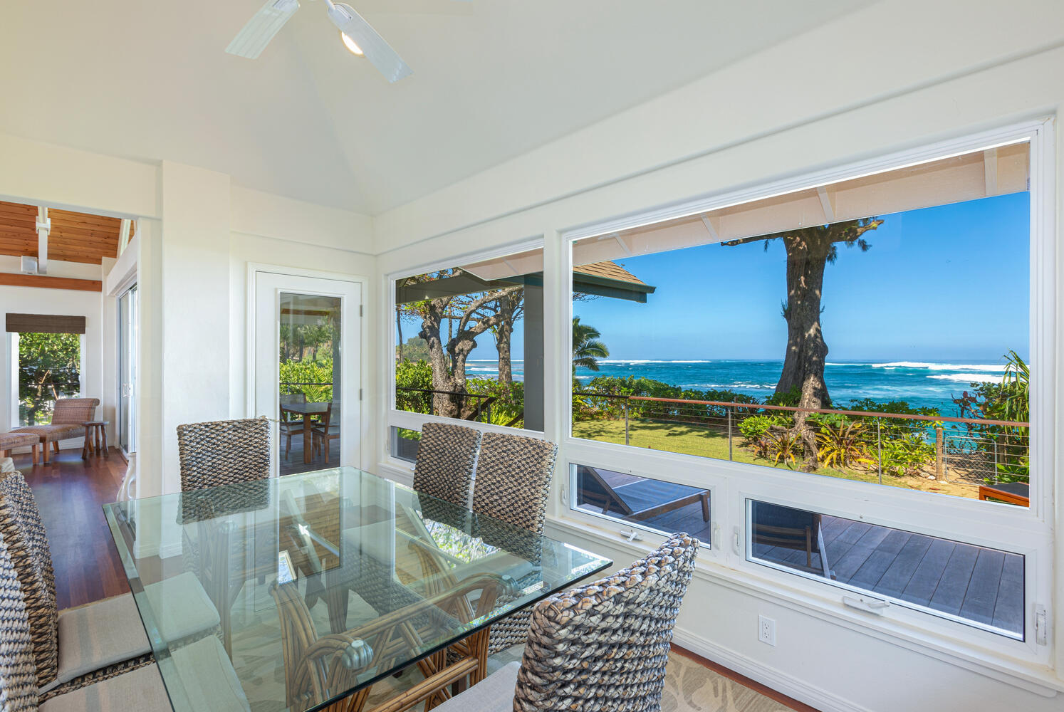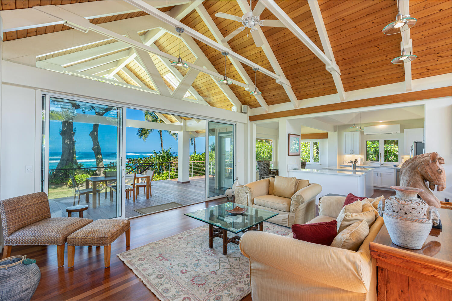 An exceptional beachfront setting for this North Shore Kauai licensed vacation rental. Positioned between a quiet rural road and a wide stretch of uninterrupted sand, the property offers direct beach access and immediate connection to the ocean. Kite surfing, diving, fishing, and windsurfing are just offshore from your lanai. The home features an open, light-filled modern floor plan designed to capture ocean views from nearly every room. A fully equipped kitchen with quartz countertops anchors the main living area. Air-conditioning provides comfort throughout. Approximately 1,000 square feet of lanai extends the living space outdoors, ideal for dining and relaxing along the shoreline. Minutes to Hanalei and Princeville, with easy access to dining, shopping, tennis, and golf.