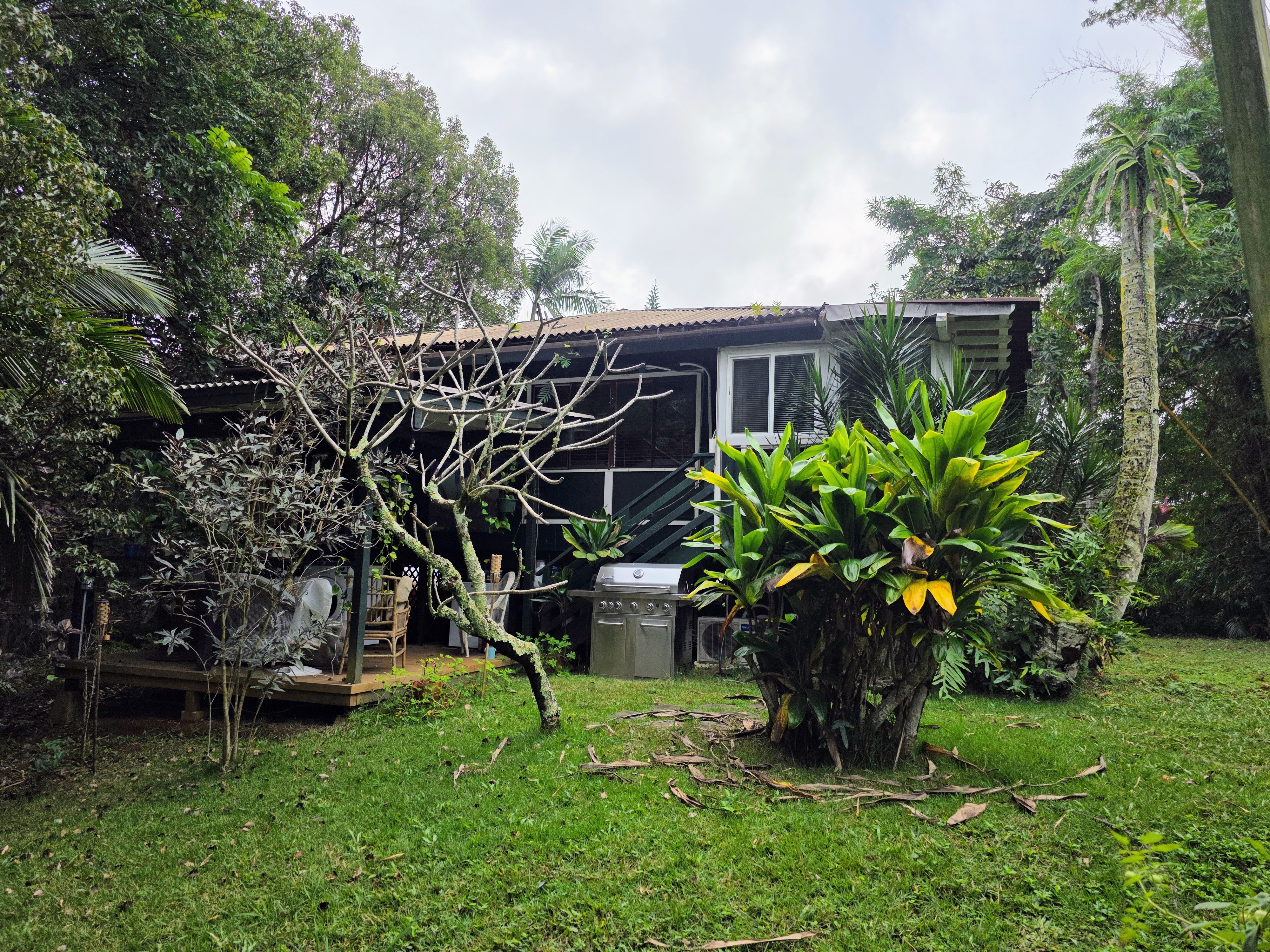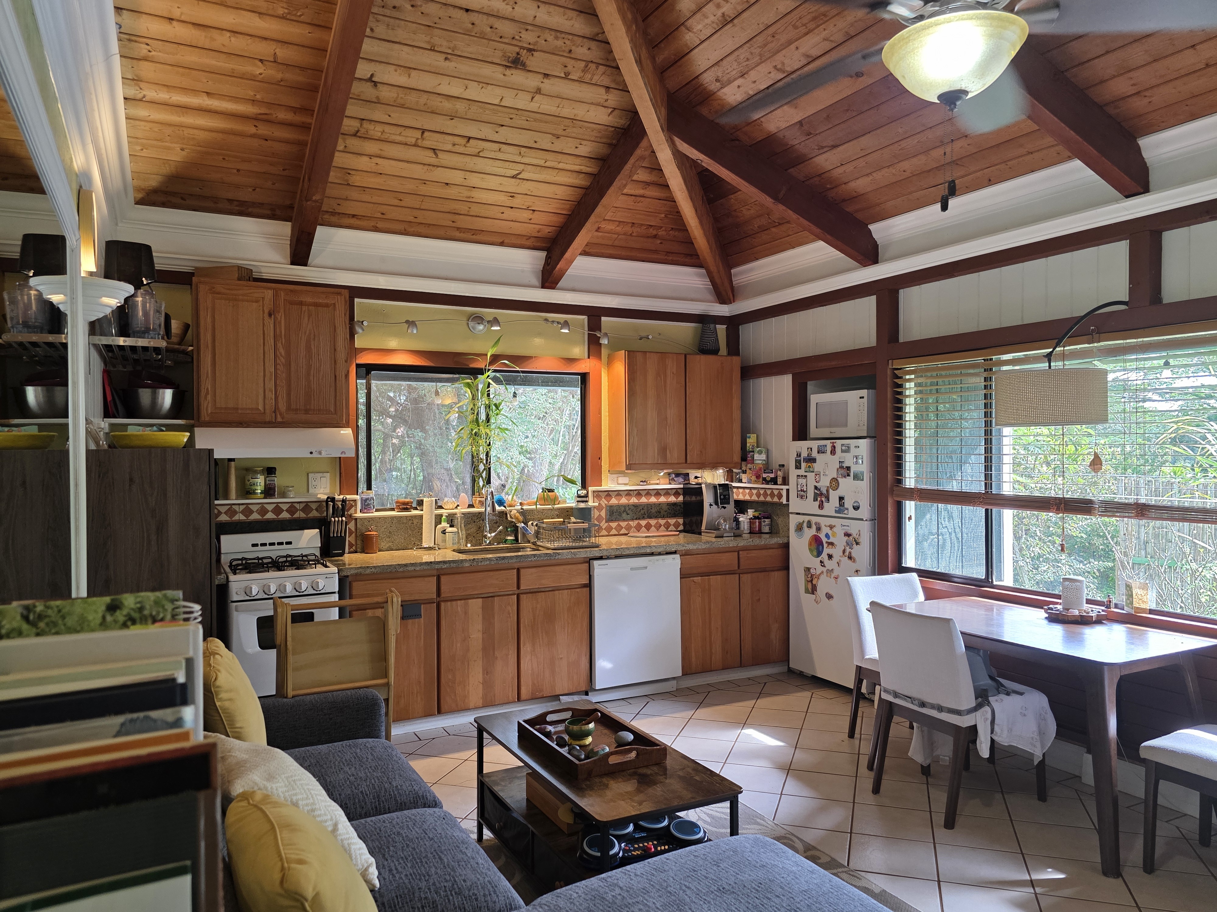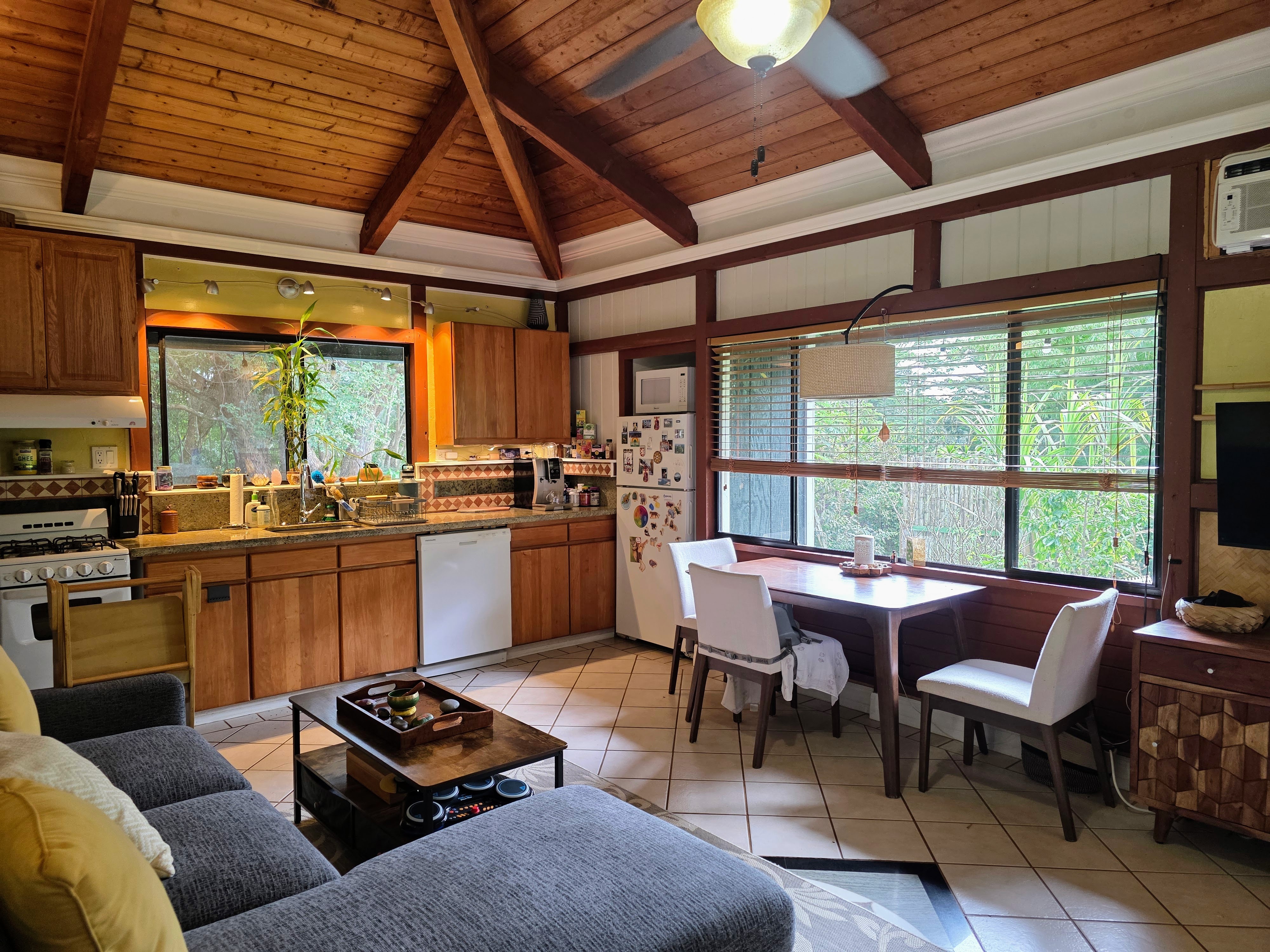 An adorable1 bedroom, 1 bath guest home with high open beam ceilings and mountain views. Extra living area created by enclosed porch. Tile flooring and artistic details (Etched glass, special tile mosaics) throughout. Granite counter tops. Gas stove and on-demand heater. 2 split system AC units as well as a wall unit. Enjoy your covered lanai and a nice grassy yard area. This is a CPR unit . The building is zoned as a guest house with its own water meter, electric meter and cesspool. Tenant occupied. 48 hour notice to show.