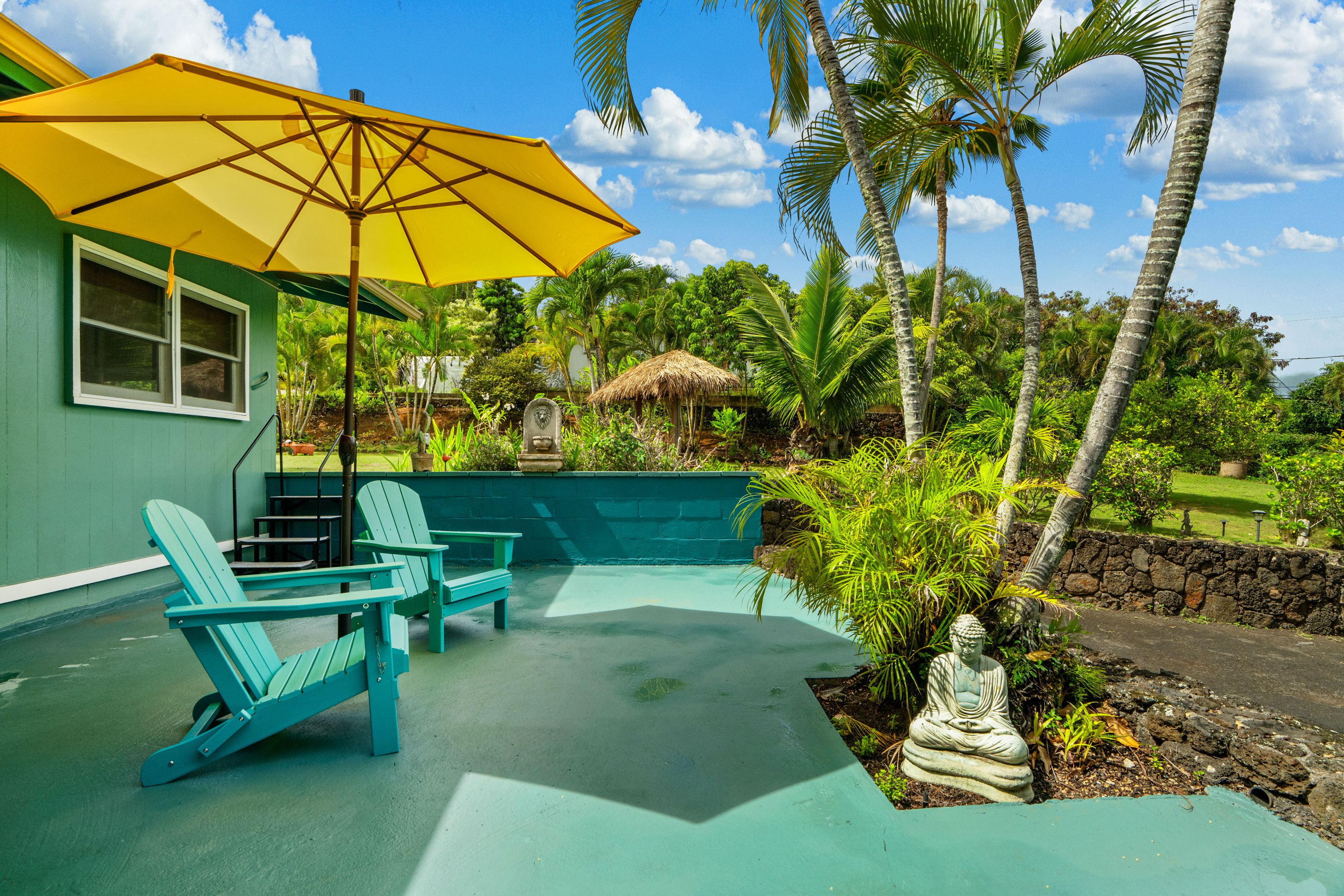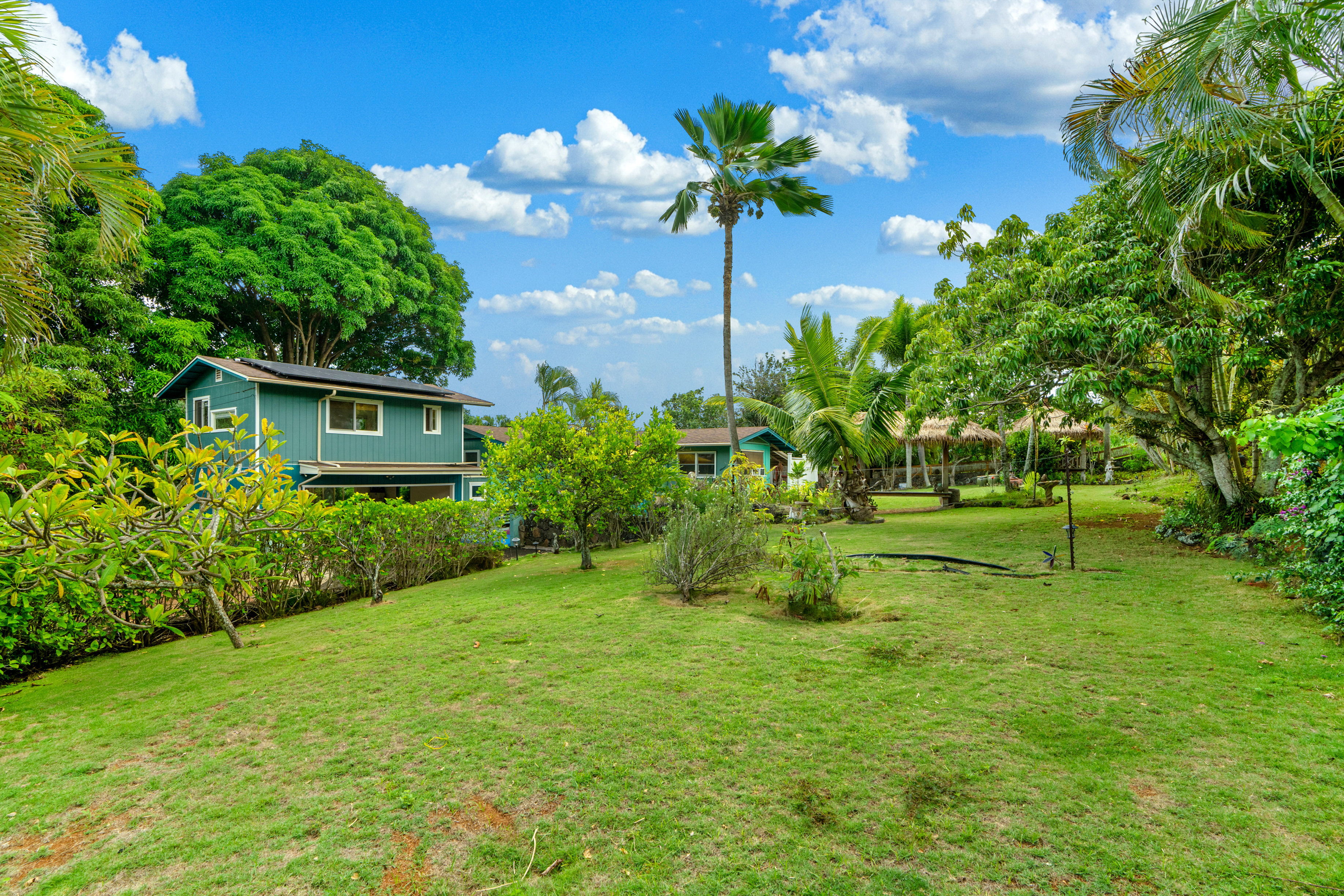 Located just minutes away from the popular Kealia beach, the frequented bike path and all the best of Kapaa town, this home is beautifully adorned with gardens, stone walls, and a relaxing gazebo. The expansive grounds offer opportunities for expansion, gardening, games, or simply enjoying the peaceful setting.
