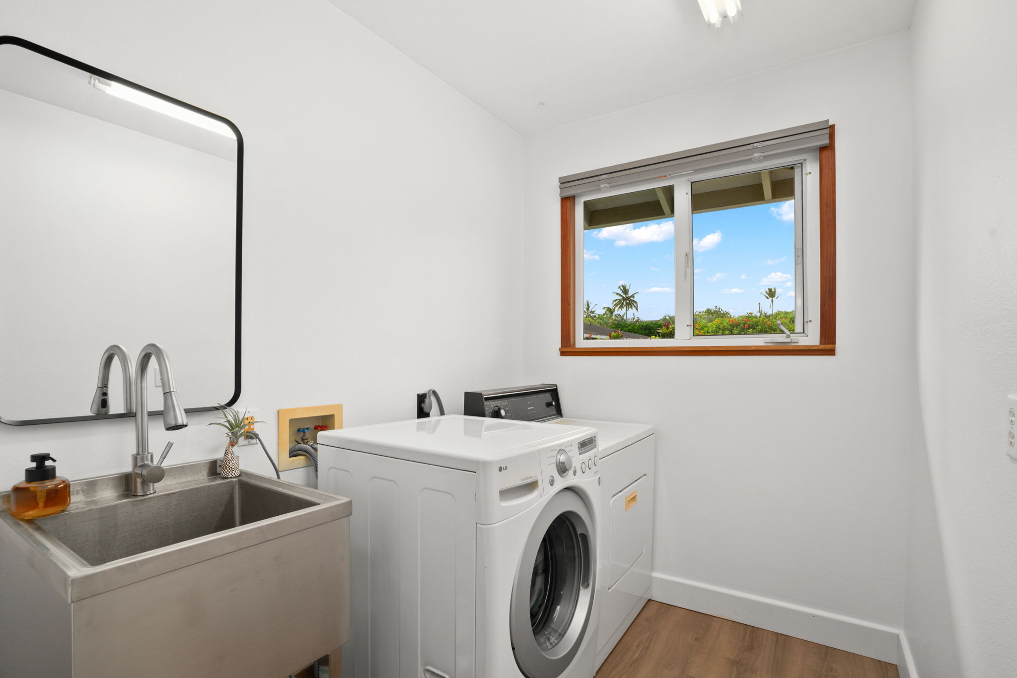 - A separate laundry room with a full-size washer and dryer, deep utility sink, and an additional half bath