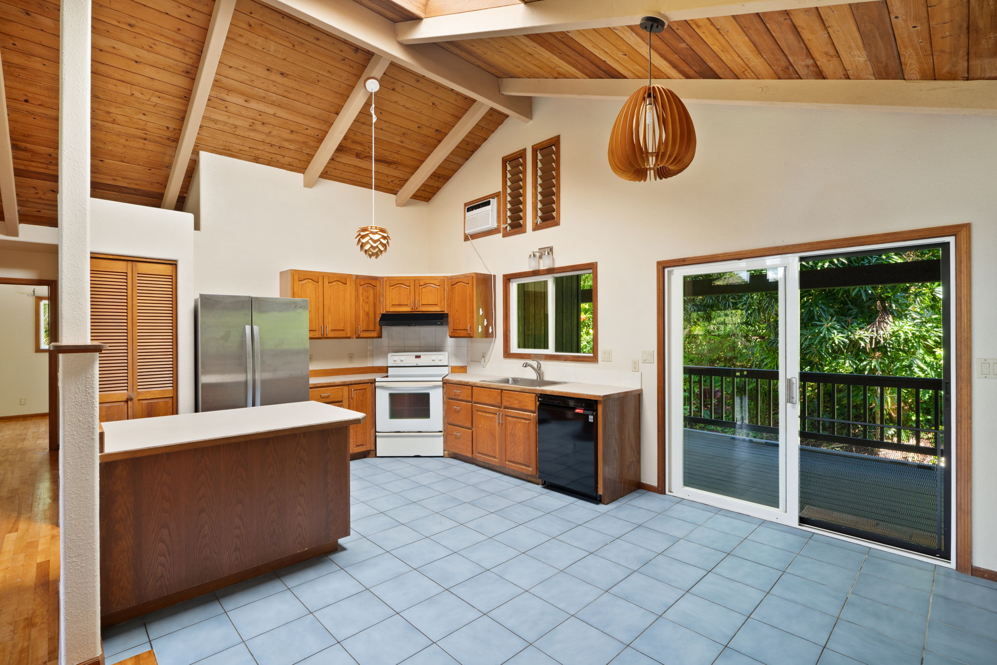 Upstairs is the main home with the functional layout of 3 bedrooms and 2 bathrooms featuring vaulted ceilings and Birch hardwood floors that have just been refinished. The "Jungle Room" is a covered and screened-in extension of the Primary Bedroom, a perfect place to chill, read, meditate without direct sun, and completely surrounded by trees. Other premium areas include 2 large covered lanais for that indoor / outdoor living off of the kitchen and as your welcoming entry thru French doors.