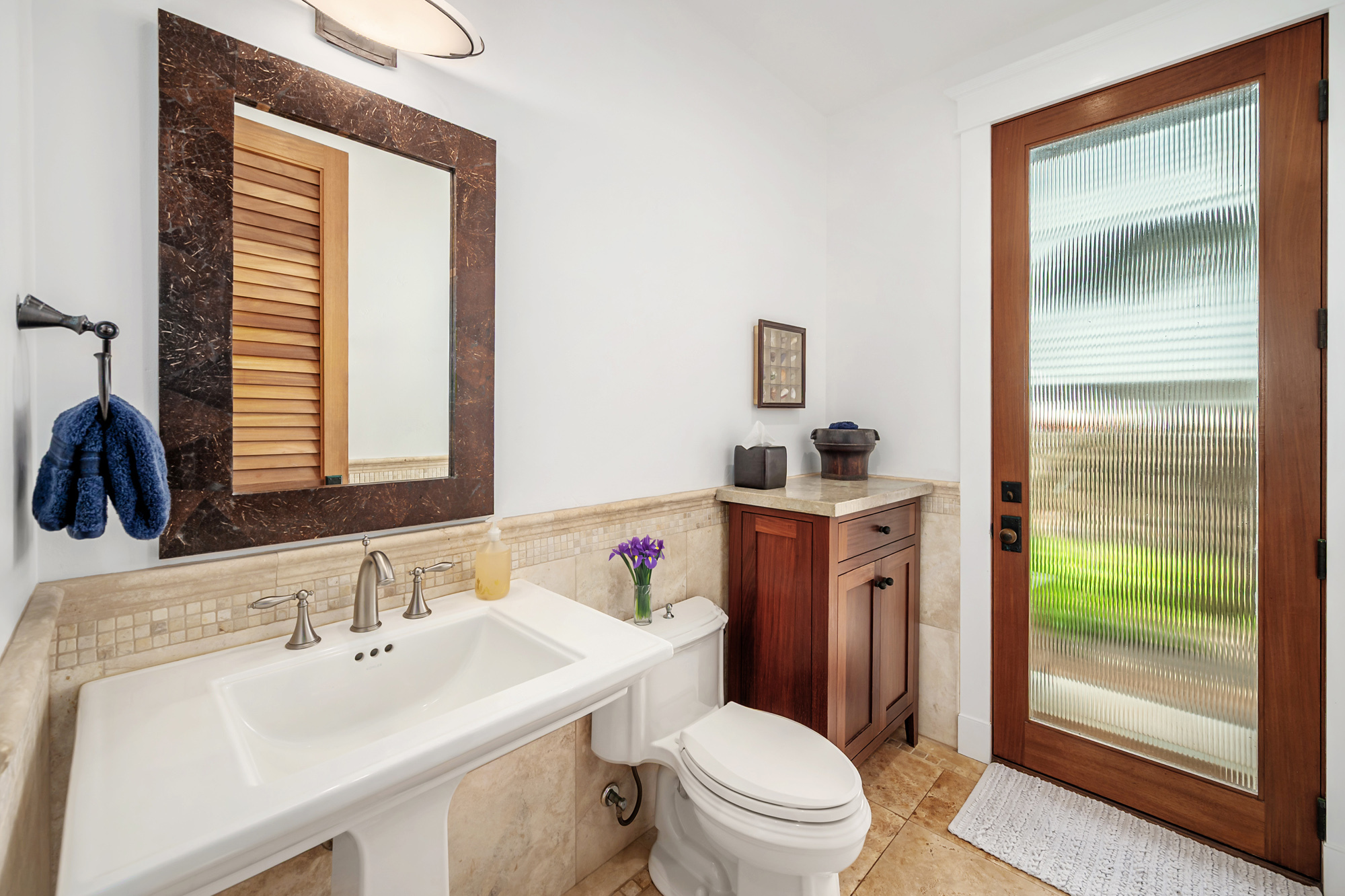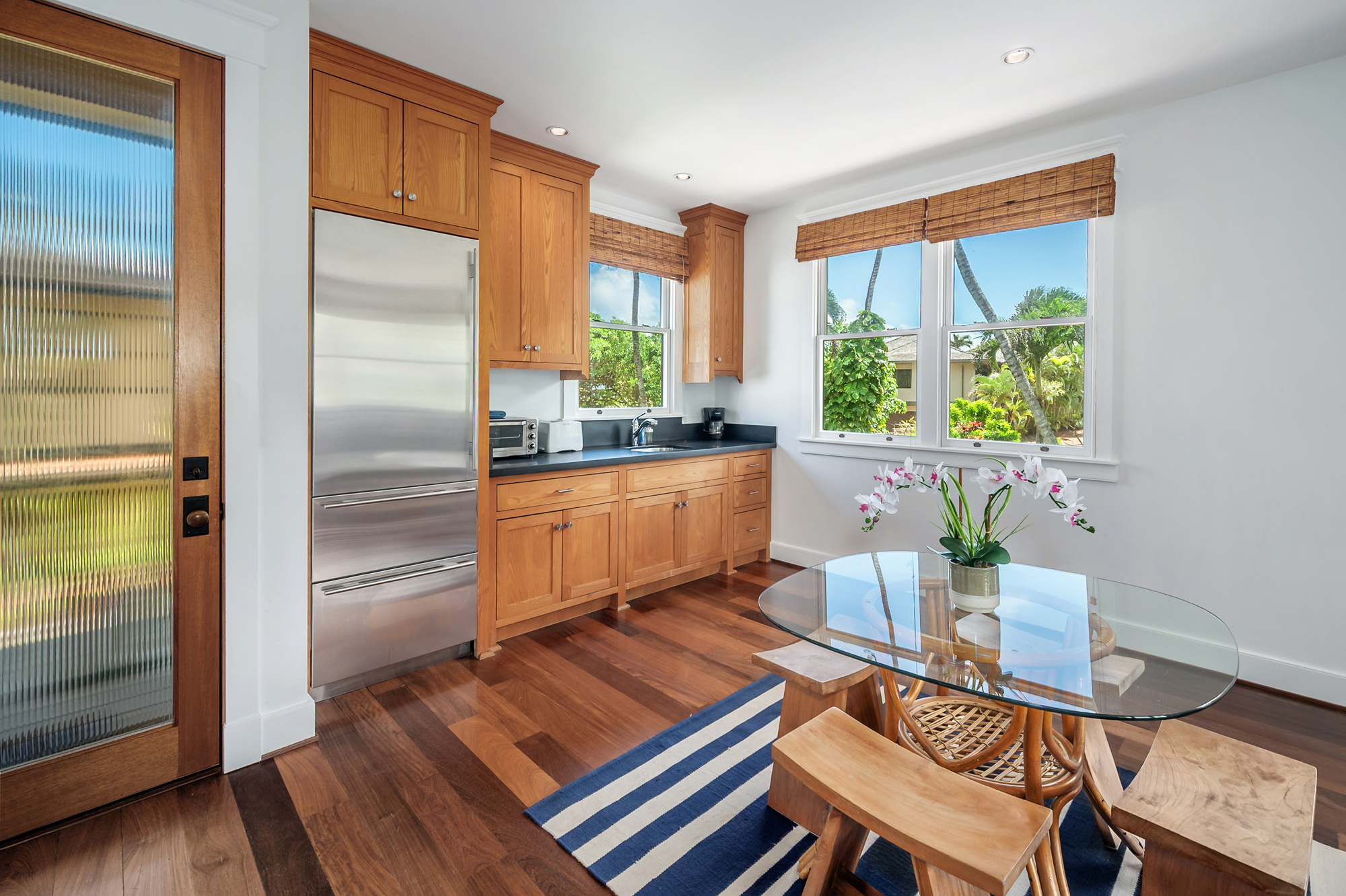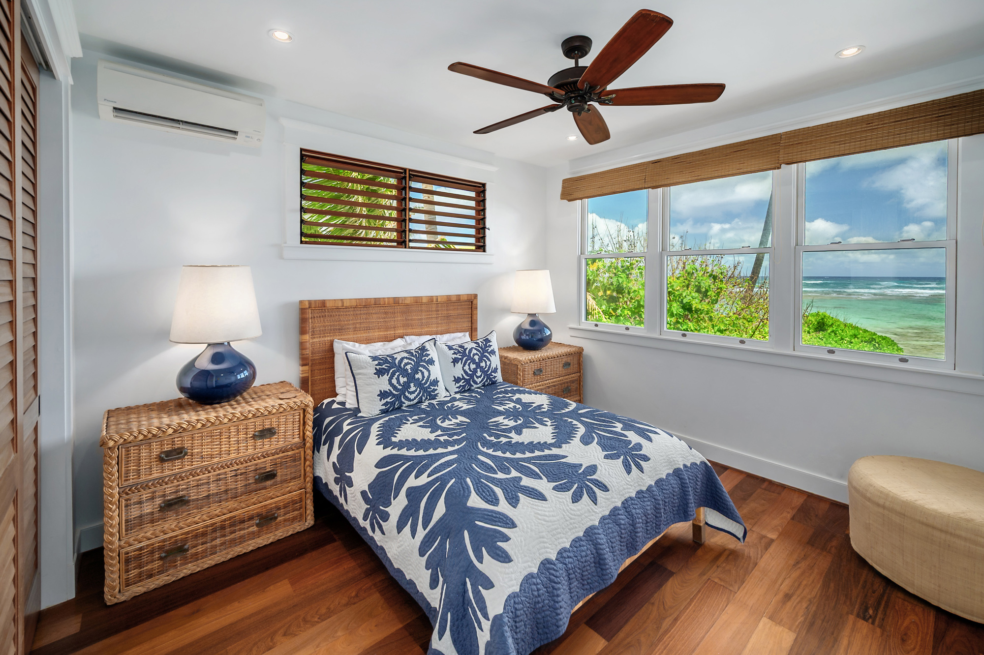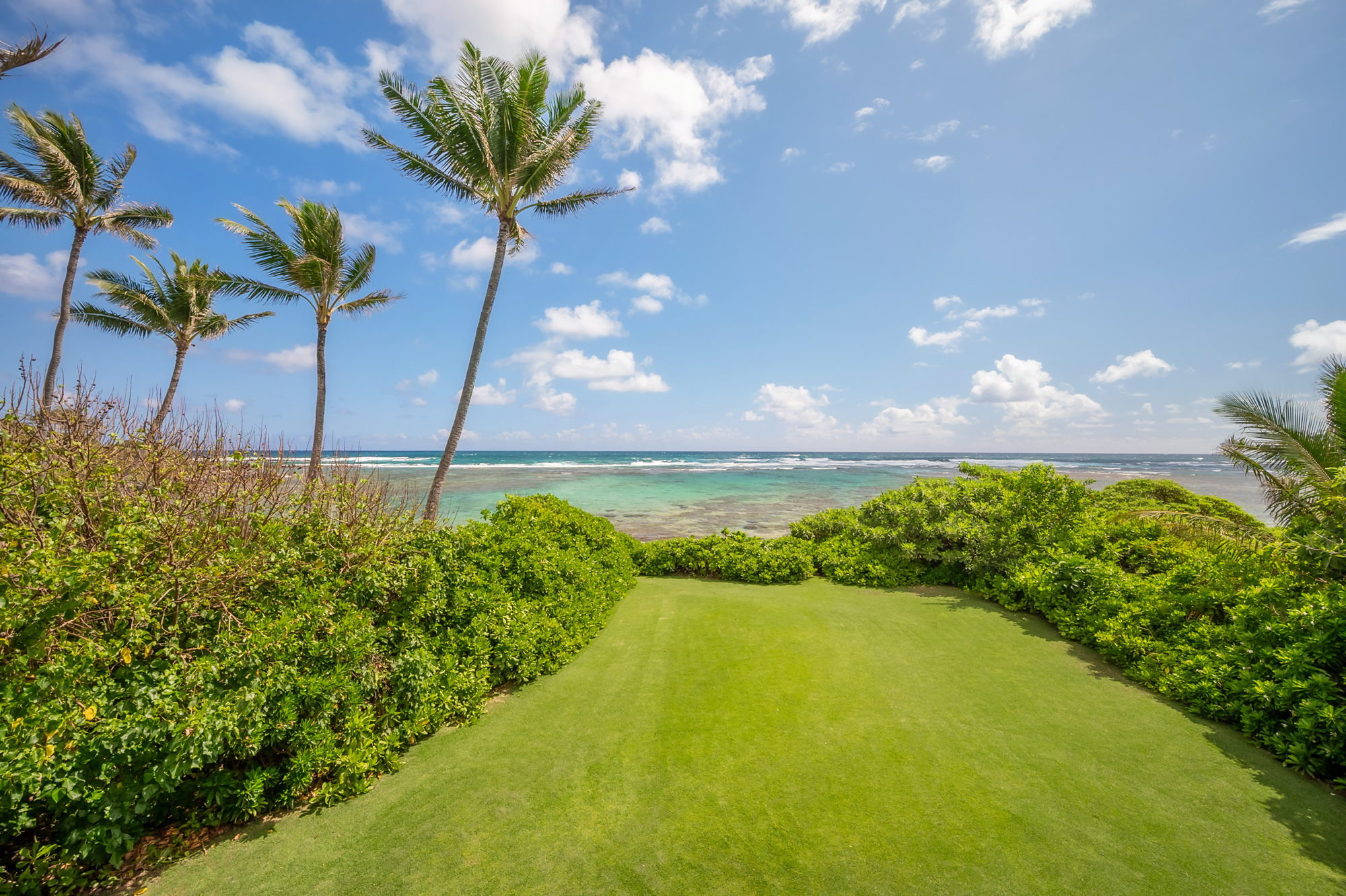 Hale Aliomanu is a private oceanfront estate located on Aliomanu Bay on the Northeast side of Kauai. As you drive in the gate, you enter your own personal retreat of swaying palm trees, the soothing sound of the ocean, lush tropical landscaping and the tranquility of Aliomanu. Enjoy unobstructed ocean views from most all of the rooms. Watch the sun come up from the comfort of your bed or stargaze from your lanai. Walk out your front door and stroll across the lush lawn to one of the most private and year round swimmer-friendly beaches on the island. This spacious estate features a primary oceanfront residence of well over 3,200 sqft of interior living spaces, five bedrooms and five and half bathrooms. A detached garage/workshop also has a second story suite quarters featuring a 500 sqft studio bedroom and bathroom. The elegance of this estate home is evident everywhere, with Ipe wood floors throughout, split A/C system, top of the line kitchen appliances and attention to every detail. This property also has a transient vacation rental license giving the property flexibility in use and income potential. Located on the northeast corridor of the island, you are just a short trip away from the beaches, world class surfing, tennis and golf of Kilauea and Princeville to the North and the shopping and restaurants of Kapaa to the south.