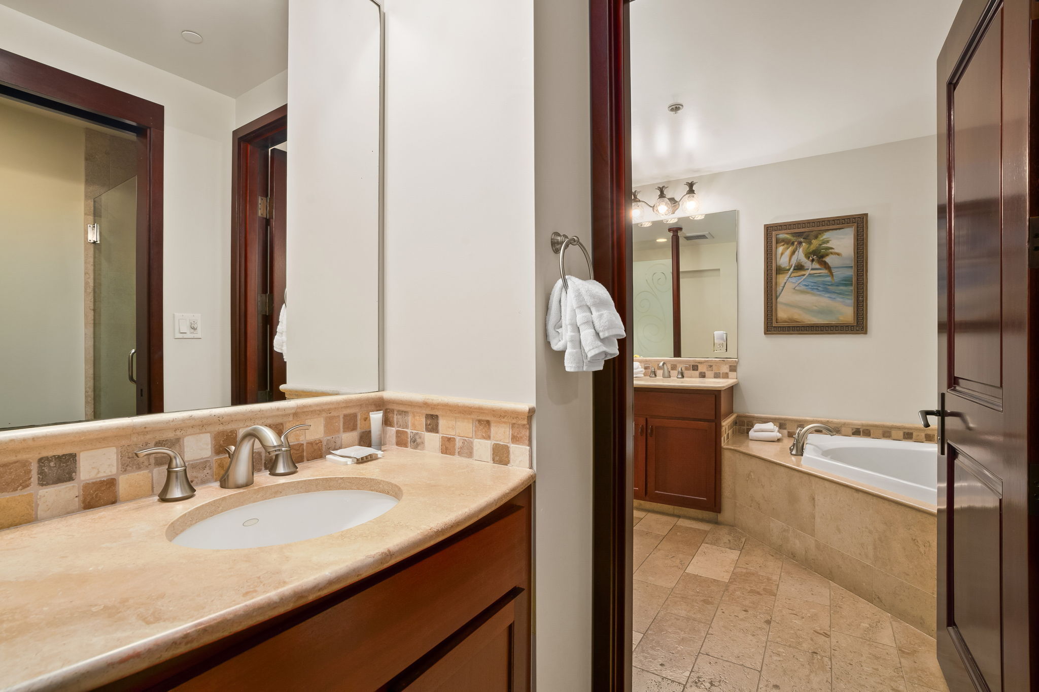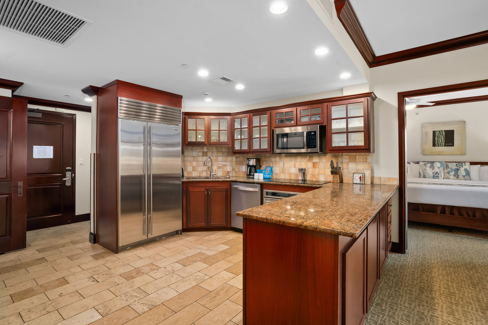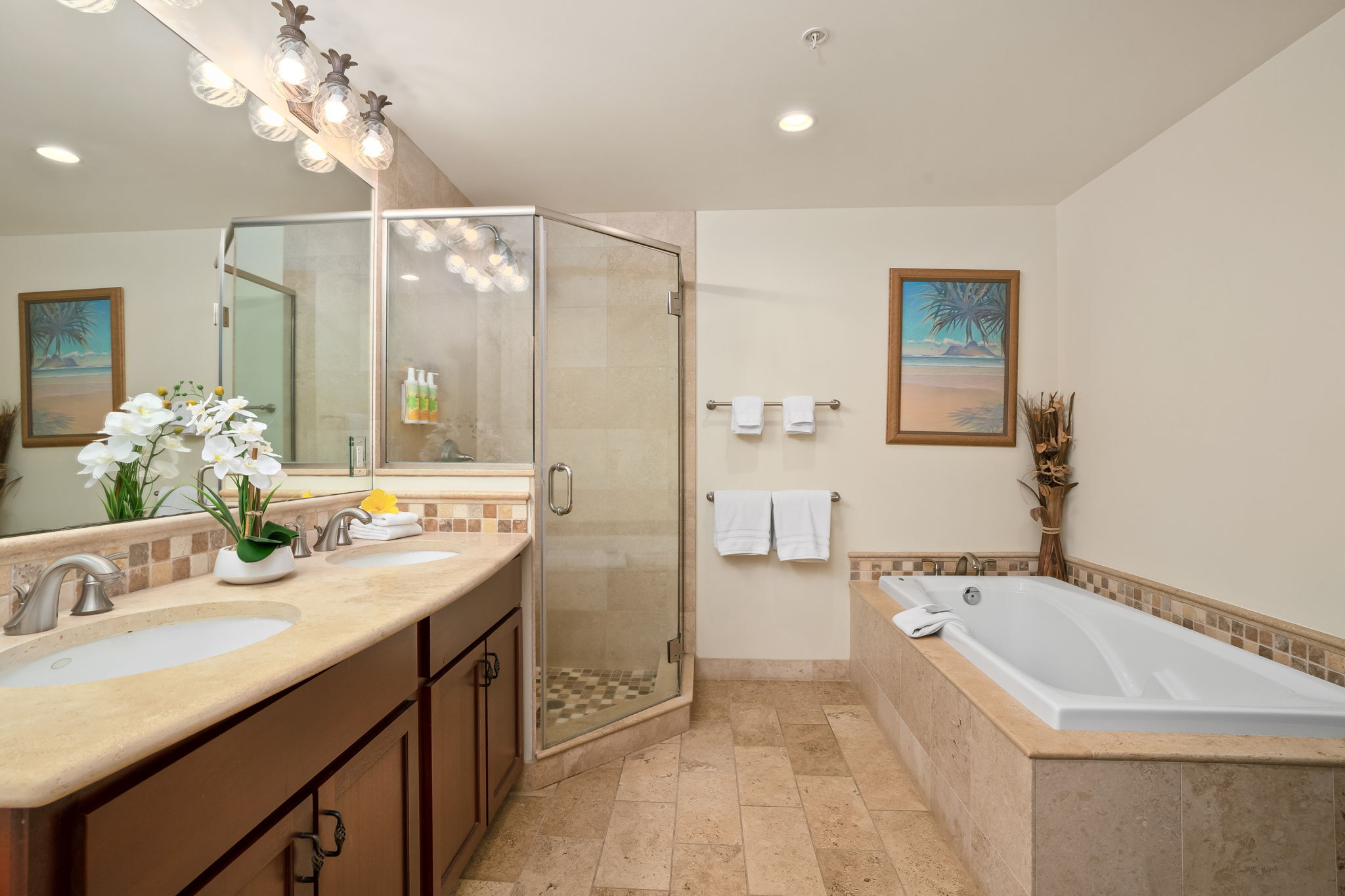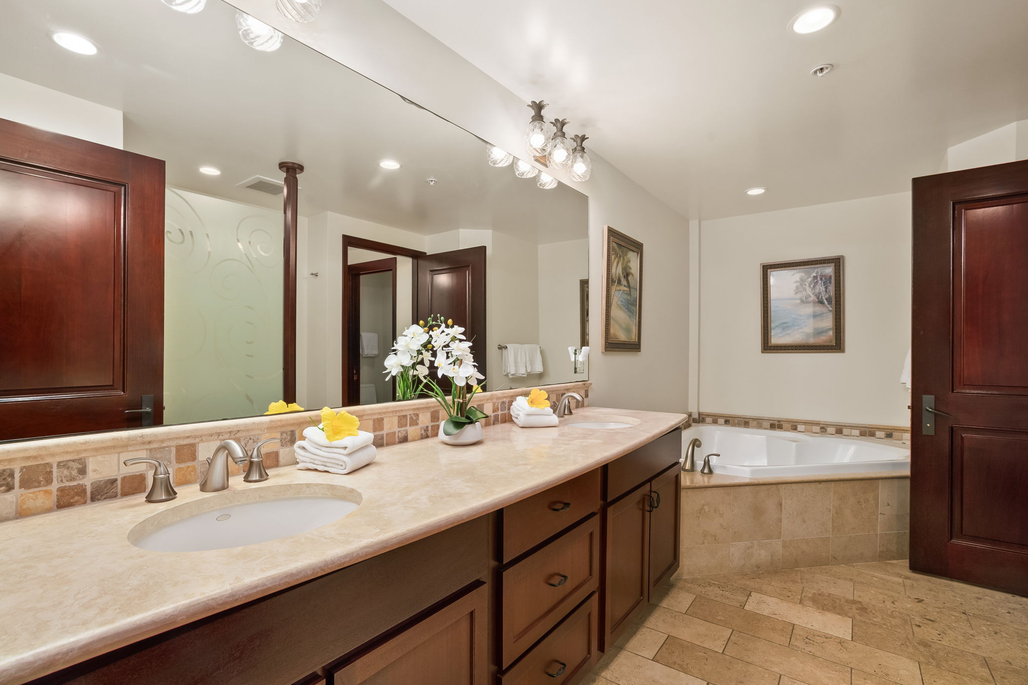 Turn-key luxury vacation rental in the highly sought-after Waipouli Beach Resort! This beautifully upgraded mountain-view 2-bedroom, 3-bath residence offers the perfect blend of upscale island living and strong income potential. Inside, you’ll find a gourmet kitchen with premium stainless steel appliances, including a Sub-Zero refrigerator, top-of-the-line cooktop and oven, along with granite countertops and rich mahogany cabinetry. Each bathroom is finished in elegant travertine with soaking tubs and separate showers, creating a true resort-style retreat. The spacious layout comfortably sleeps up to six guests with a king bed, two full beds, and a sleeper sofa. Guests love the resort’s standout amenities, including a tropical pool with lazy river, water slides, and sand-bottom spas, plus a koi pond, oceanview restaurant with live music, fitness center, and full-service spa–all just steps from the beach. Centrally located in the heart of Kapa'a, you’re within walking distance to shopping, dining, and groceries, with the coastal bike path and rentals right outside your door. Elevator access, central AC, high-speed internet, in-unit washer/dryer, and multiple flat-screen TVs add to the comfort and convenience. Located within the VDA and fully furnished, this is a proven, high-performing Airbnb with strong nightly rates and consistent occupancy–ideal for investors seeking immediate cash flow or buyers looking for a luxury island getaway that pays for itself.