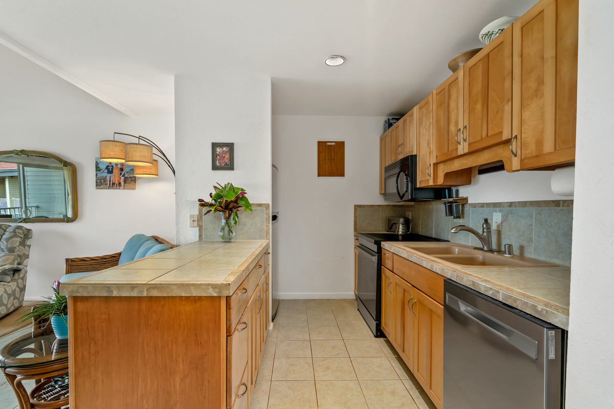 The 909 square foot interior is arranged across two levels, allowing separation between the bedrooms for added privacy. The living area opens directly to the lanai, creating a comfortable indoor to outdoor connection for dining and relaxation. The unit overlooks the resort pool, lawn, landscaped grounds, and shoreline. Enjoy the fully equipped kitchen features new induction range/oven, dishwasher and beautiful Birch wood cabinets and hardware. Offered fully furnished and turnkey. Owner's lockable closet upstairs and an additional storage loft closet in downstairs bedroom. Kapaa Shores Resort features a heated freshwater swimming pool, large hot tub, shuffleboard courts, barbecue area,