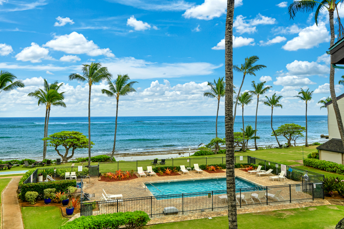 Oceanfront living is offered at this two bedroom, two bath condominium at Kapaa Shores Resort, located on the Coconut Coast on Kauai. This fee simple unit captures direct ocean and horizon views from a private covered lanai, where sunrise views over the Pacific and seasonal whale activity can be enjoyed.