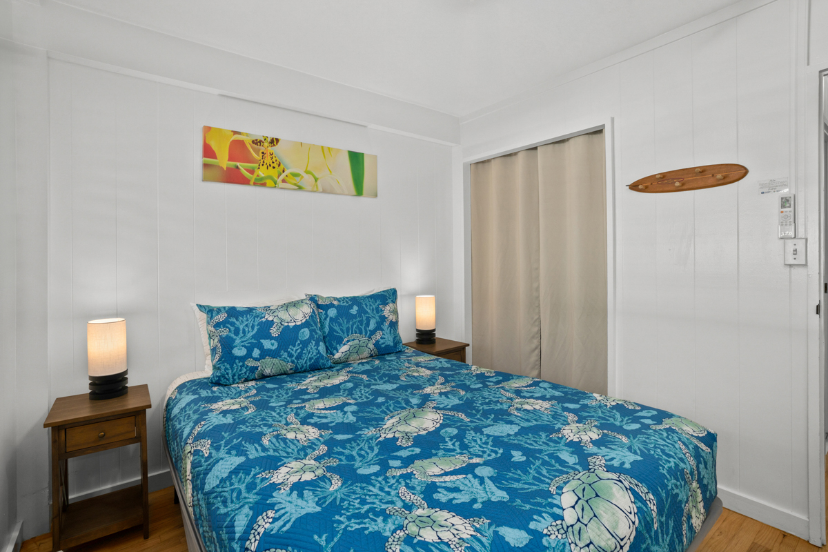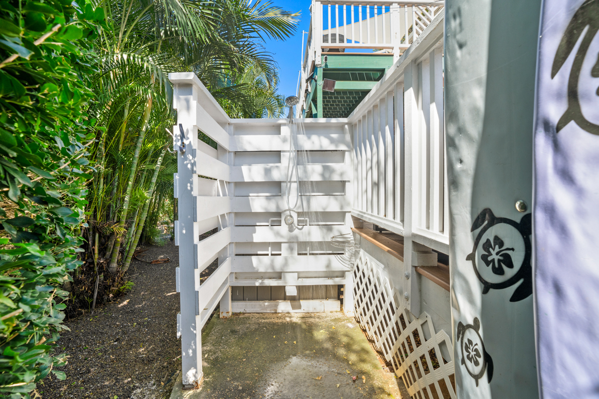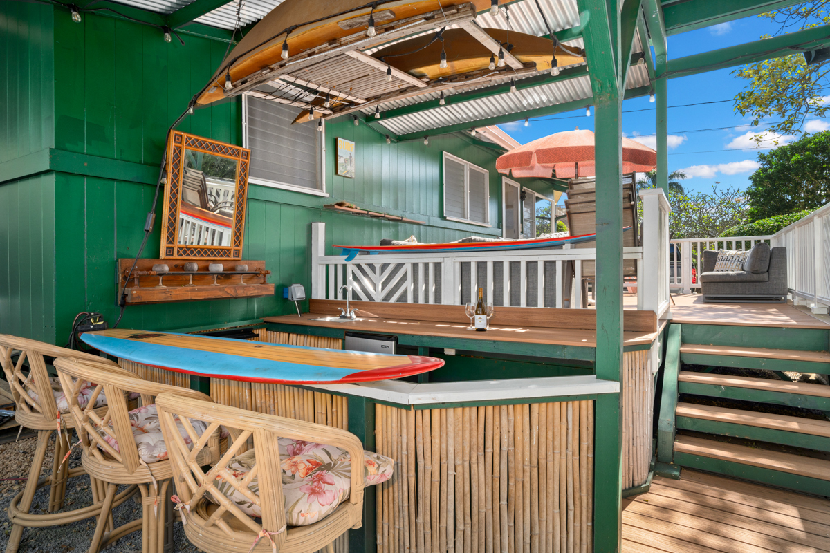 Outdoor living is a highlight with two lanais, Trex decking, a custom surf bar, and sunblock shades. Inside are Lifeproof LVP floors, a well-equipped kitchen, and new living-room furniture with a large TV. The home includes five mini-split A/C units with two condensers, providing cooling in every bedroom, the living room, and the dining area. The upper suite features a wet bar, private entrance, and ocean view (a recorded view-plane easement protects your view).