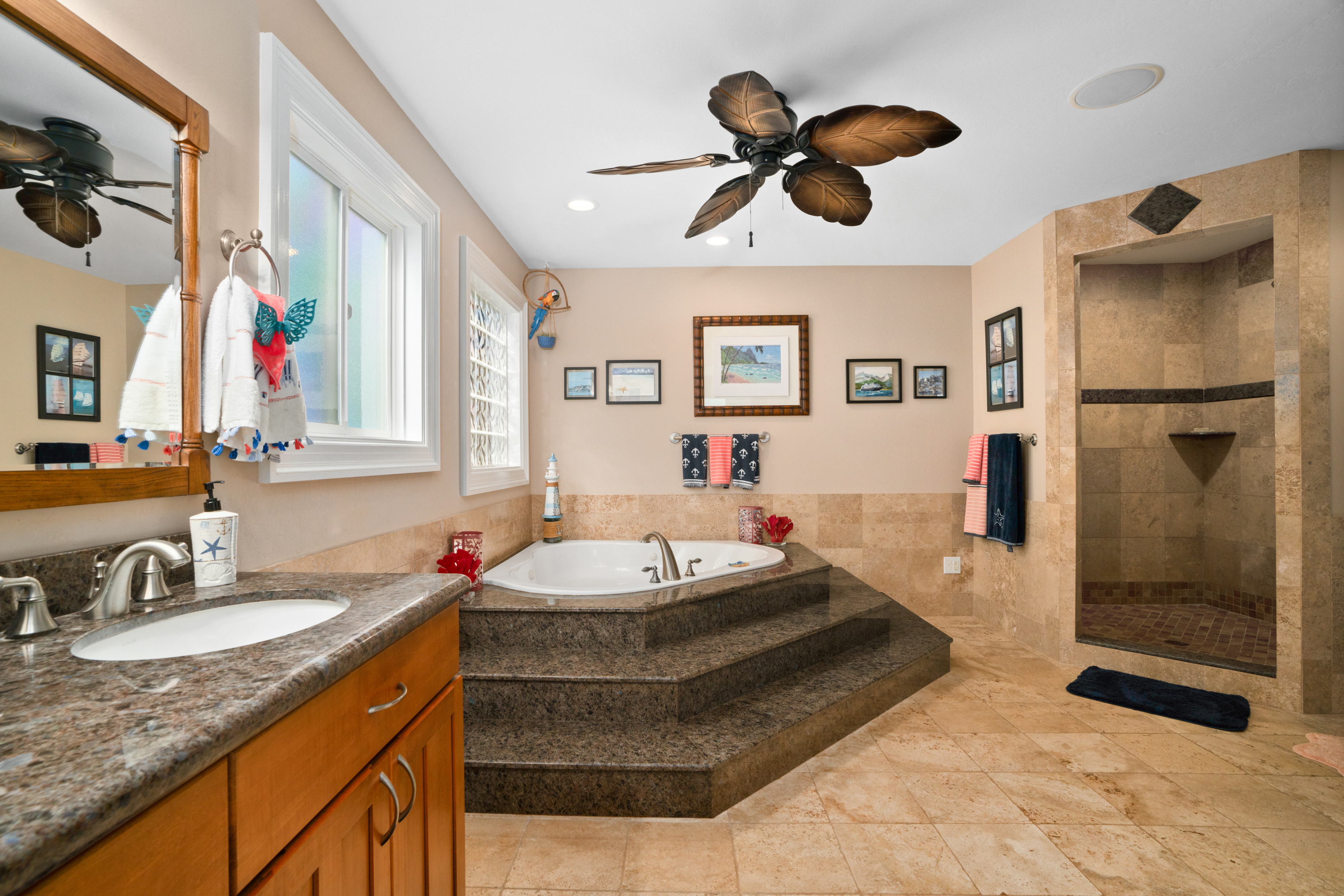 The lower-level ADU provides an open floor plan with kitchen, living & dining areas, bedroom, full bath, laundry/utility room, craft room and a 430 sq. ft. private lanai for outdoor living. A perfect space for guest to visit or a long term rental. A finished bonus room on the opposite side of the home is currently used as exercise space, with access to a large crawl area for additional storage. Residents enjoy access to the newly renovated community pool, spa, and clubhouse.