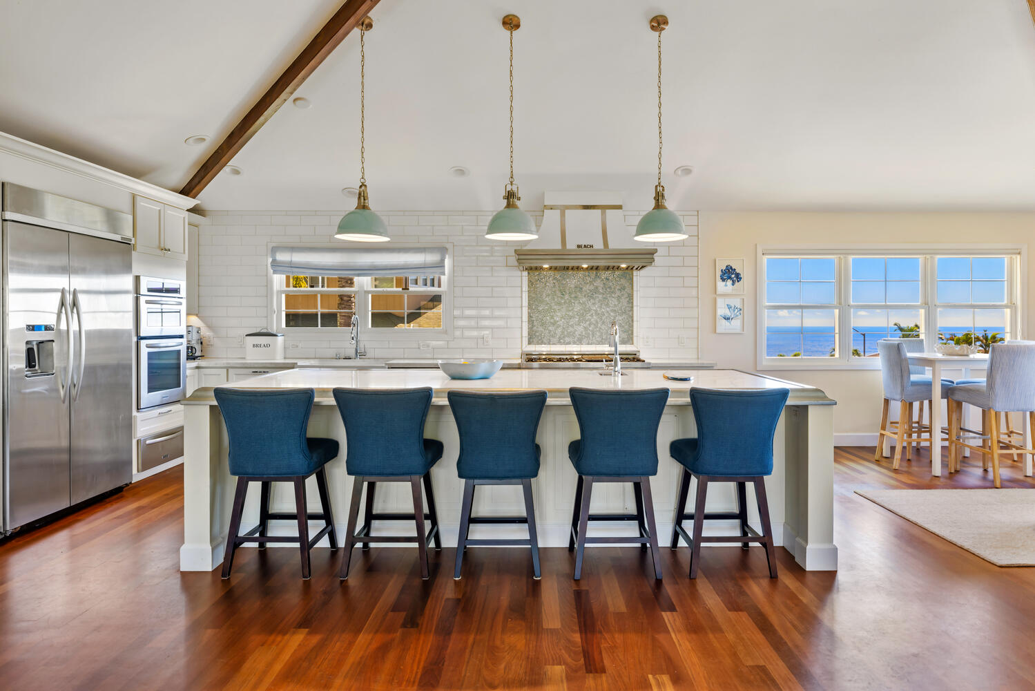 The chef’s kitchen is a masterpiece–featuring quartz surface countertops, painted Baltic Birch wood cabinetry, newer stainless steel appliances, and an oversized island with prep sink–ideal for entertaining against the backdrop of Kauai’s spectacular sunsets.
