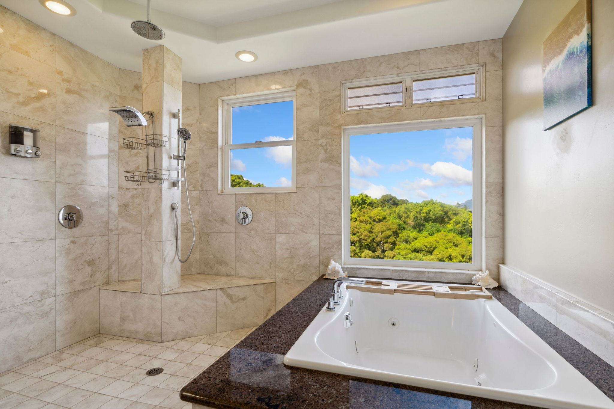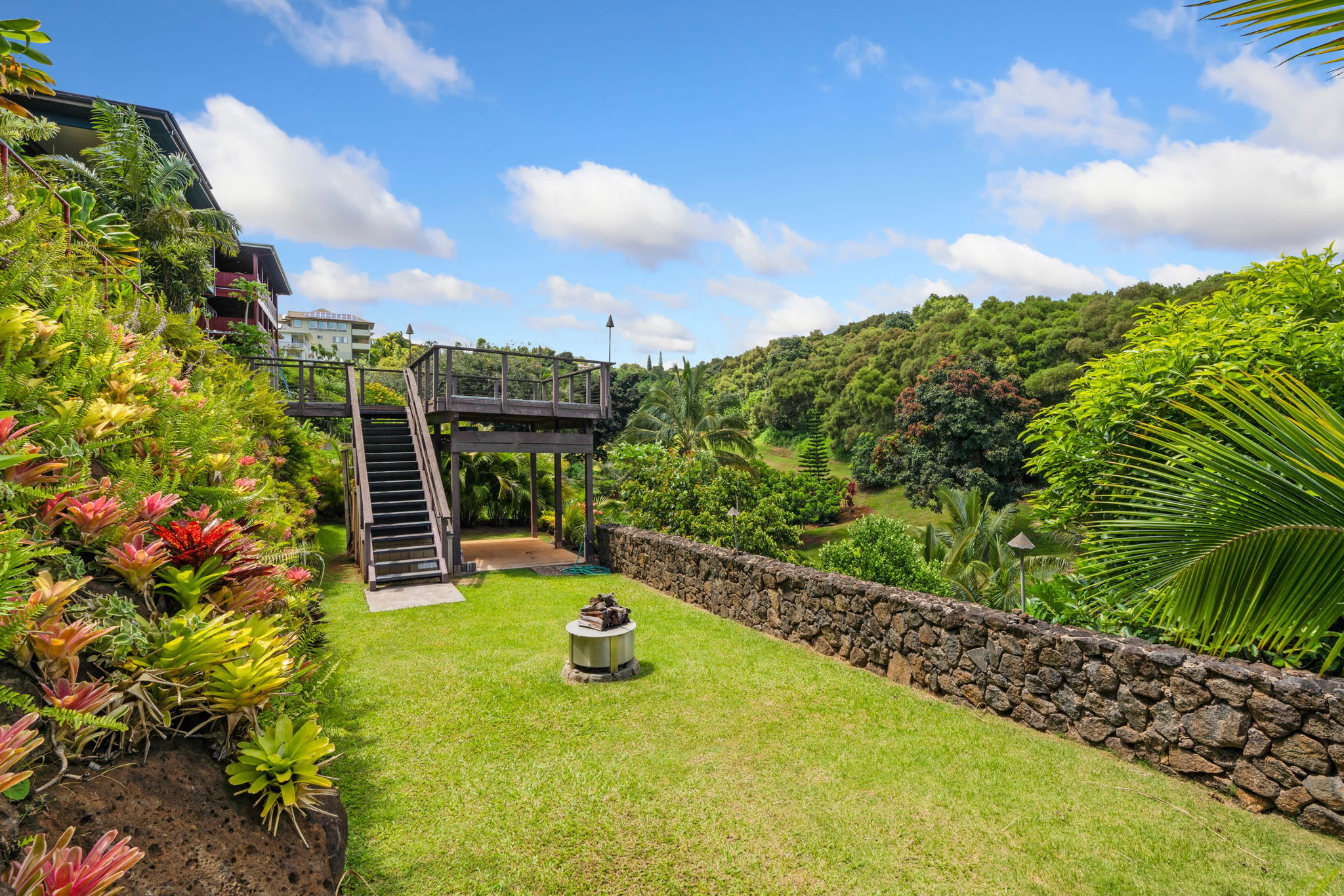 The terraced backyard boasts a Hawaiian-style oasis: lava rock walls, lush ornamentals, & fruit trees such as avocado, mango, sour soup, coconut, & dragon fruit. A grassy path leads to a detached two-story viewing deck/workshop, offering panoramic landscape & ocean views, as well as a new Breeo fire pit for smokeless grilling.