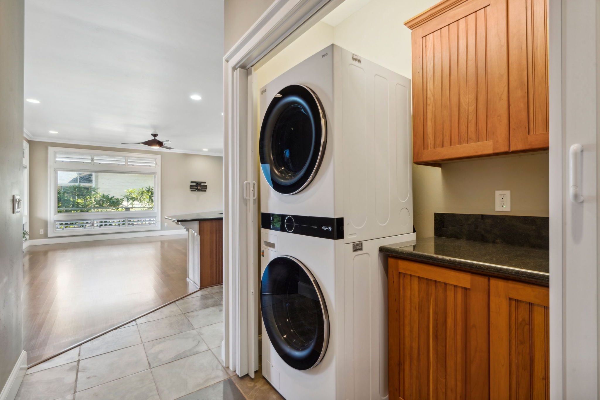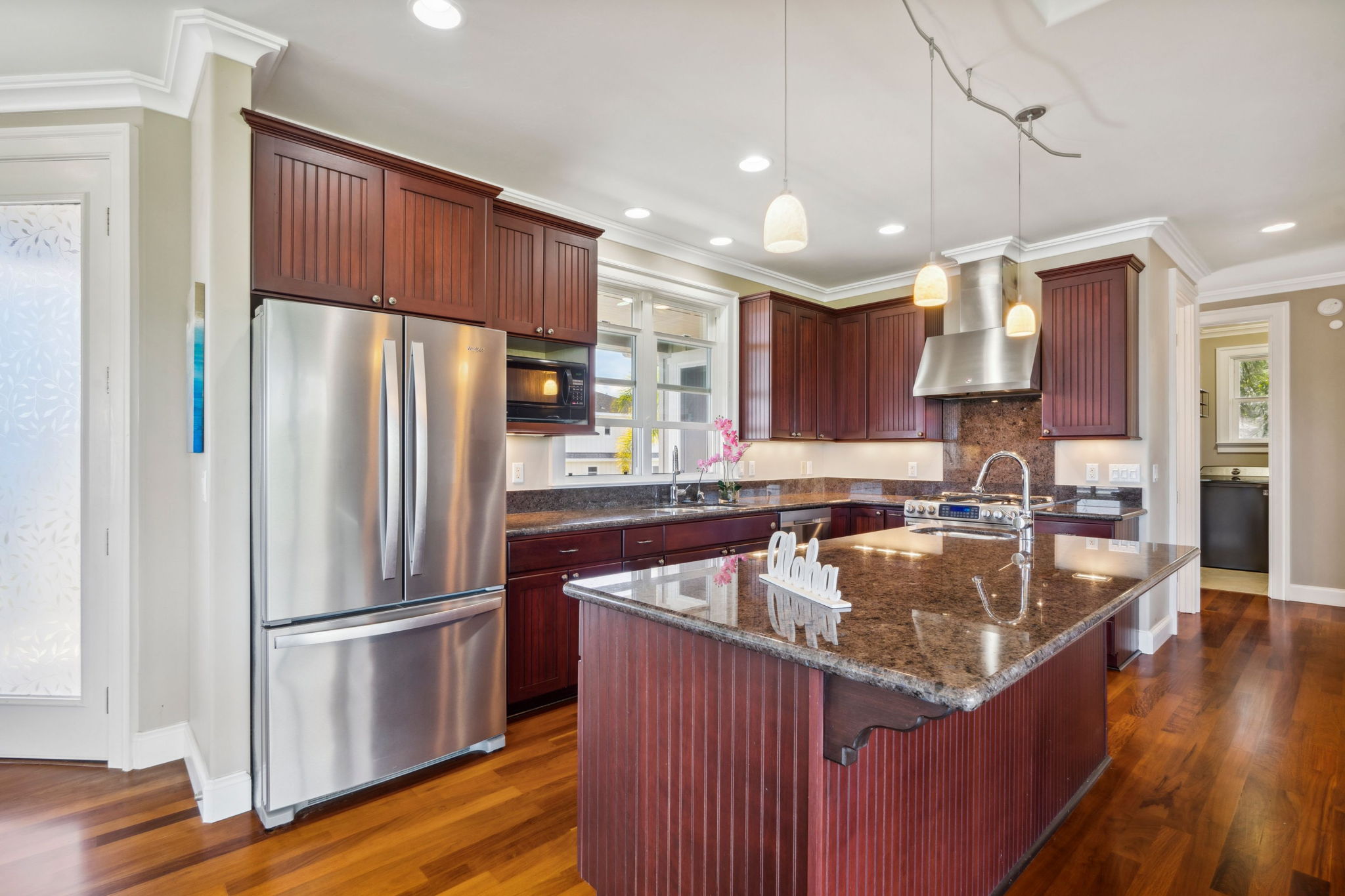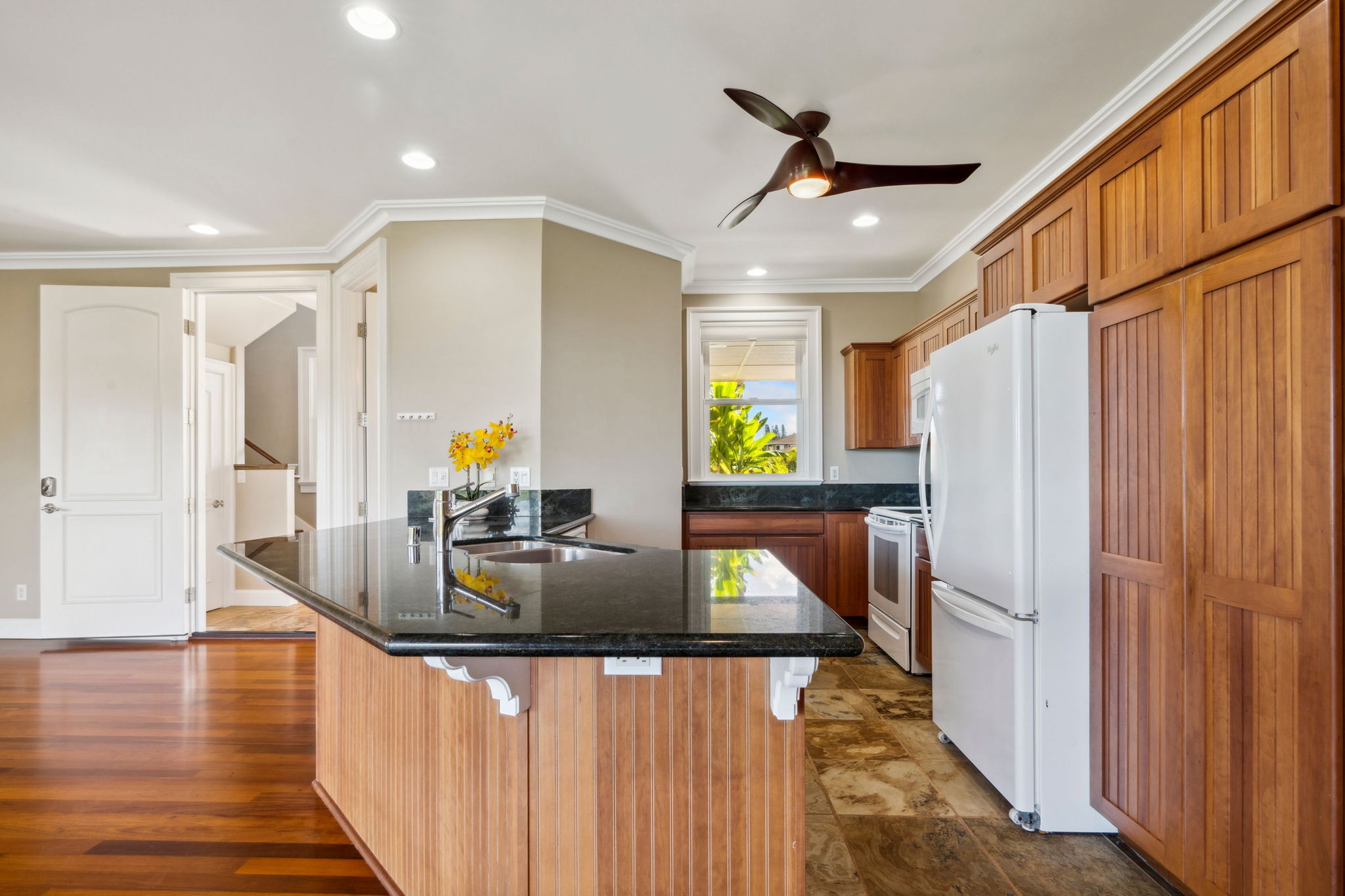 Home interior features Brazilian cherry wood, slate, & travertine floors, custom hardwood railings, & coffered ceilings with crown molding. Upstairs is 2 bedrooms, 2 bathrooms, a spacious main living area, 3 new split AC units & laundry. Downstairs is 1 bedroom, 1.5 bathrooms, private entry, full kitchen, and laundry. Lanai access from every room enhances indoor-outdoor living.