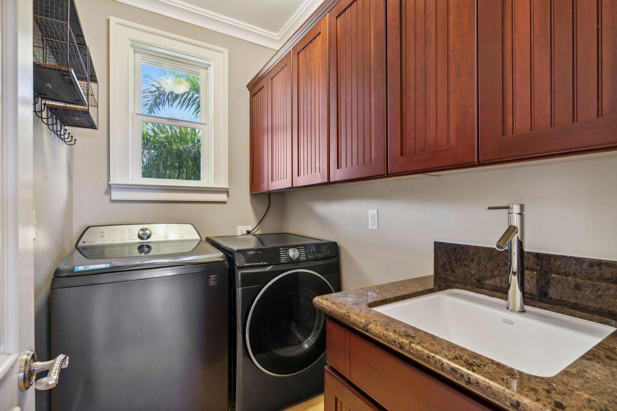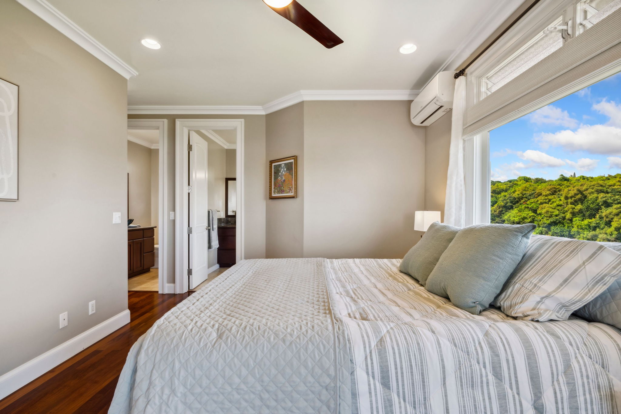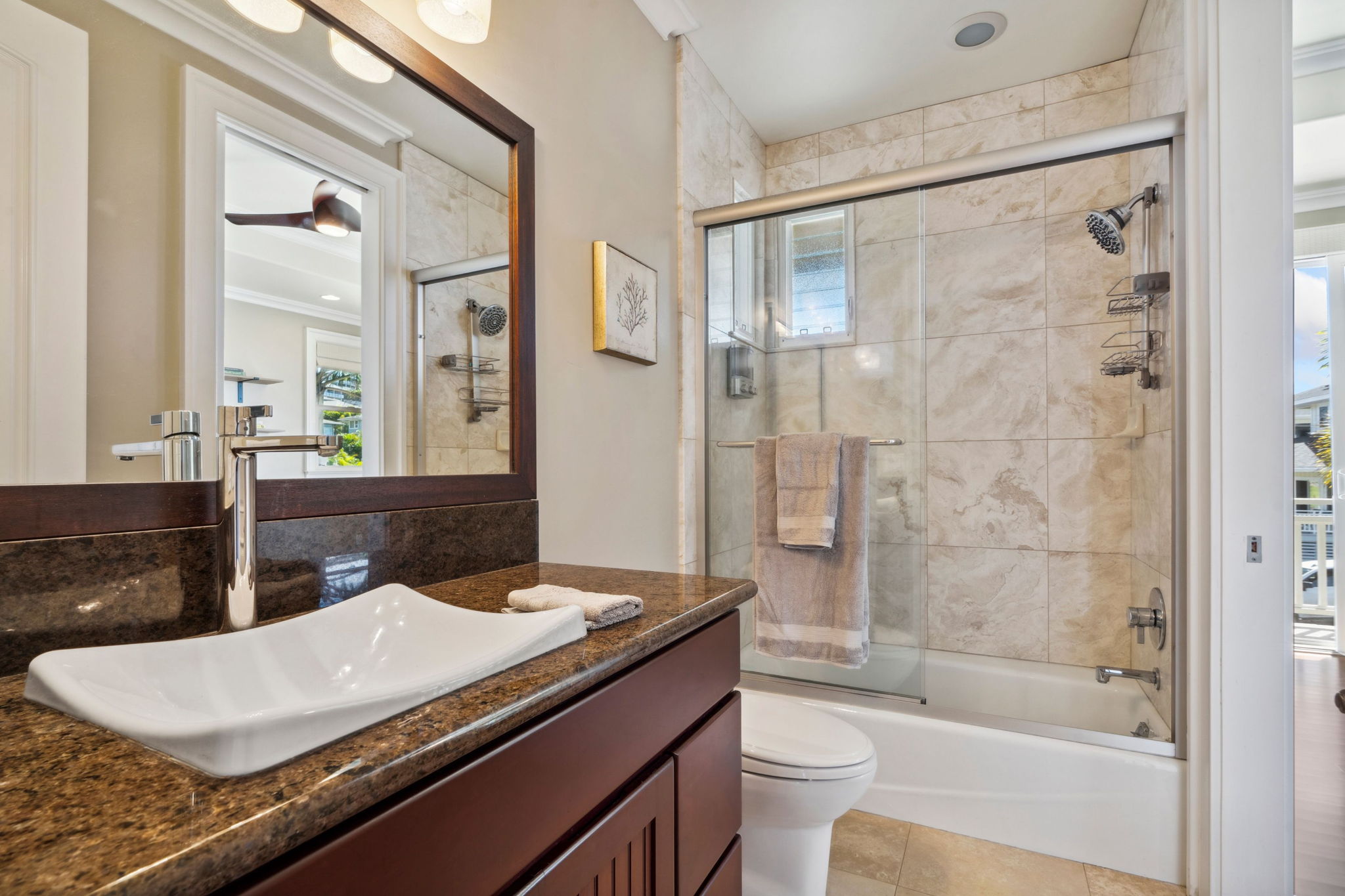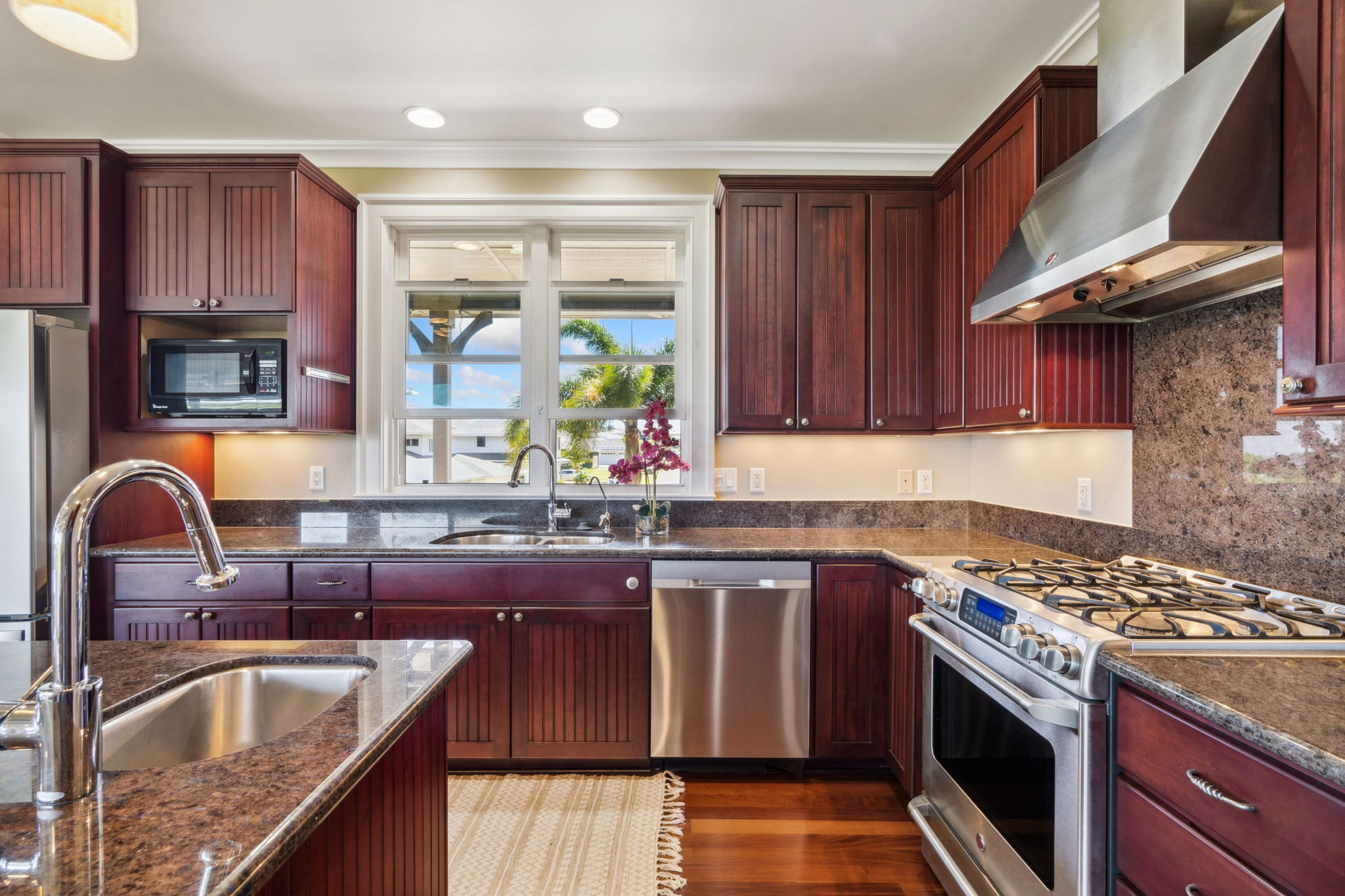 Home interior features Brazilian cherry wood, slate, & travertine floors, custom hardwood railings, & coffered ceilings with crown molding. Upstairs is 2 bedrooms, 2 bathrooms, a spacious main living area, 3 new split AC units & laundry. Downstairs is 1 bedroom, 1.5 bathrooms, private entry, full kitchen, and laundry. Lanai access from every room enhances indoor-outdoor living.