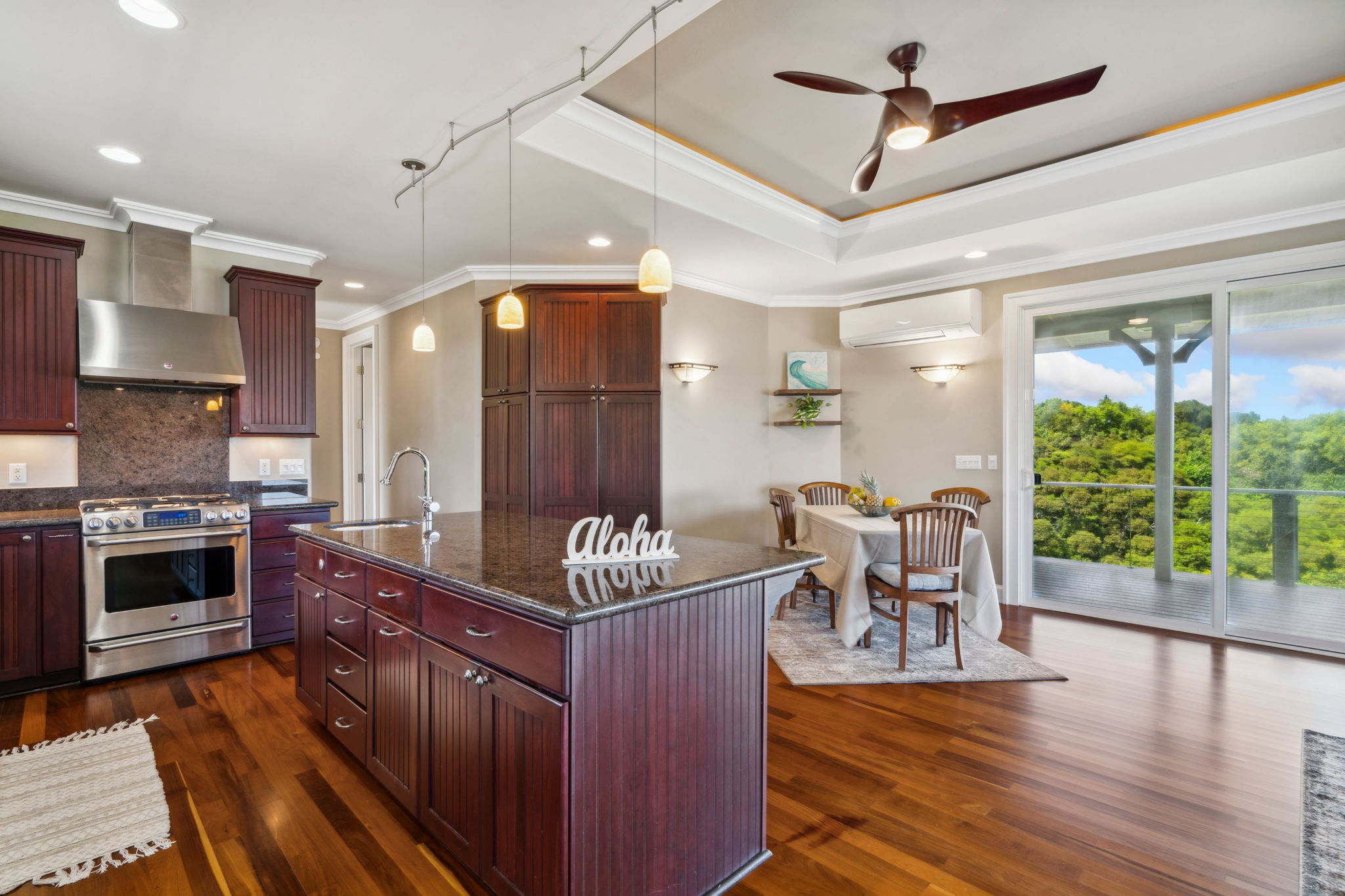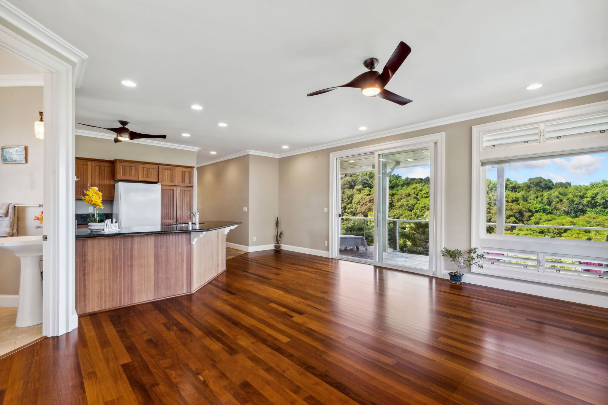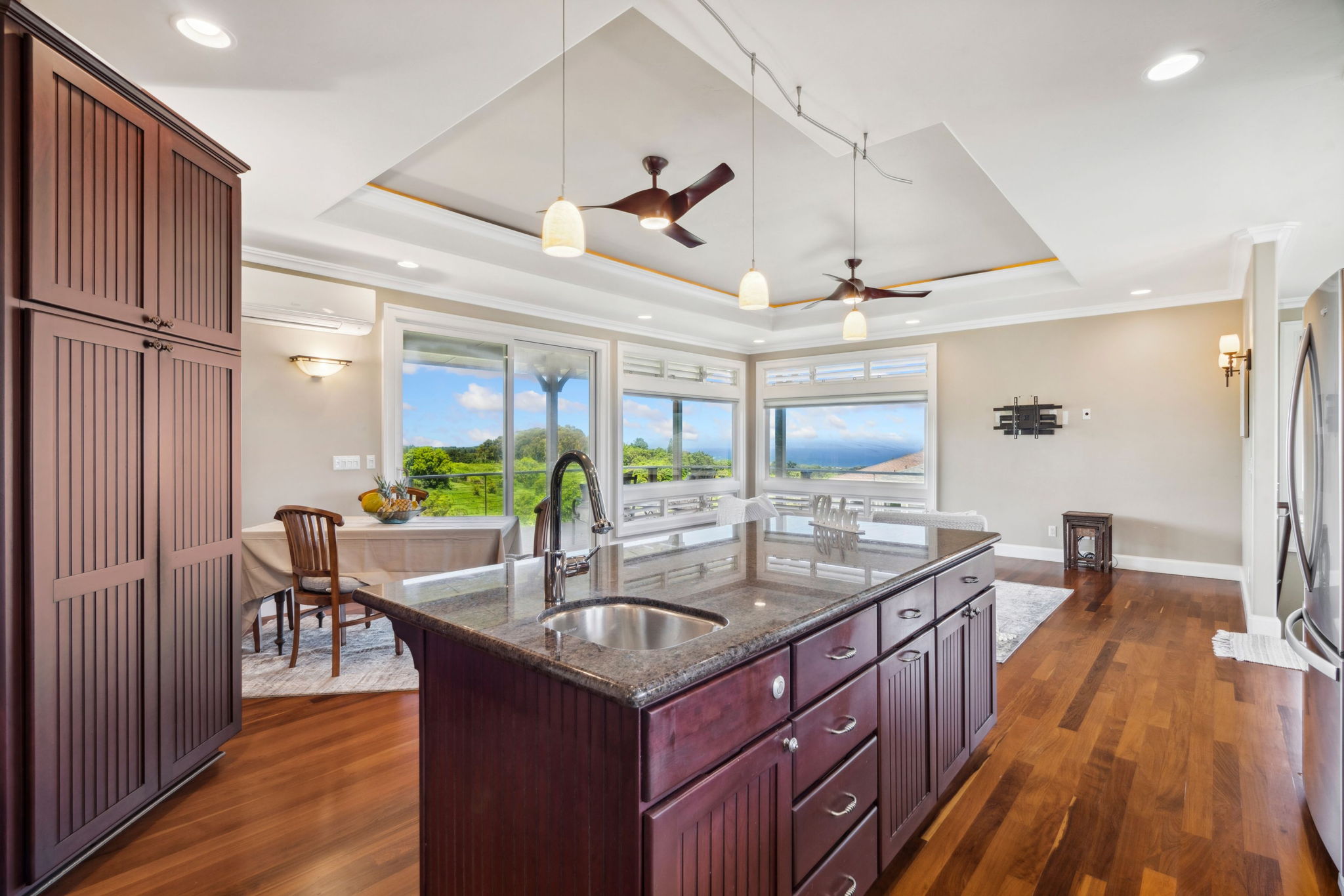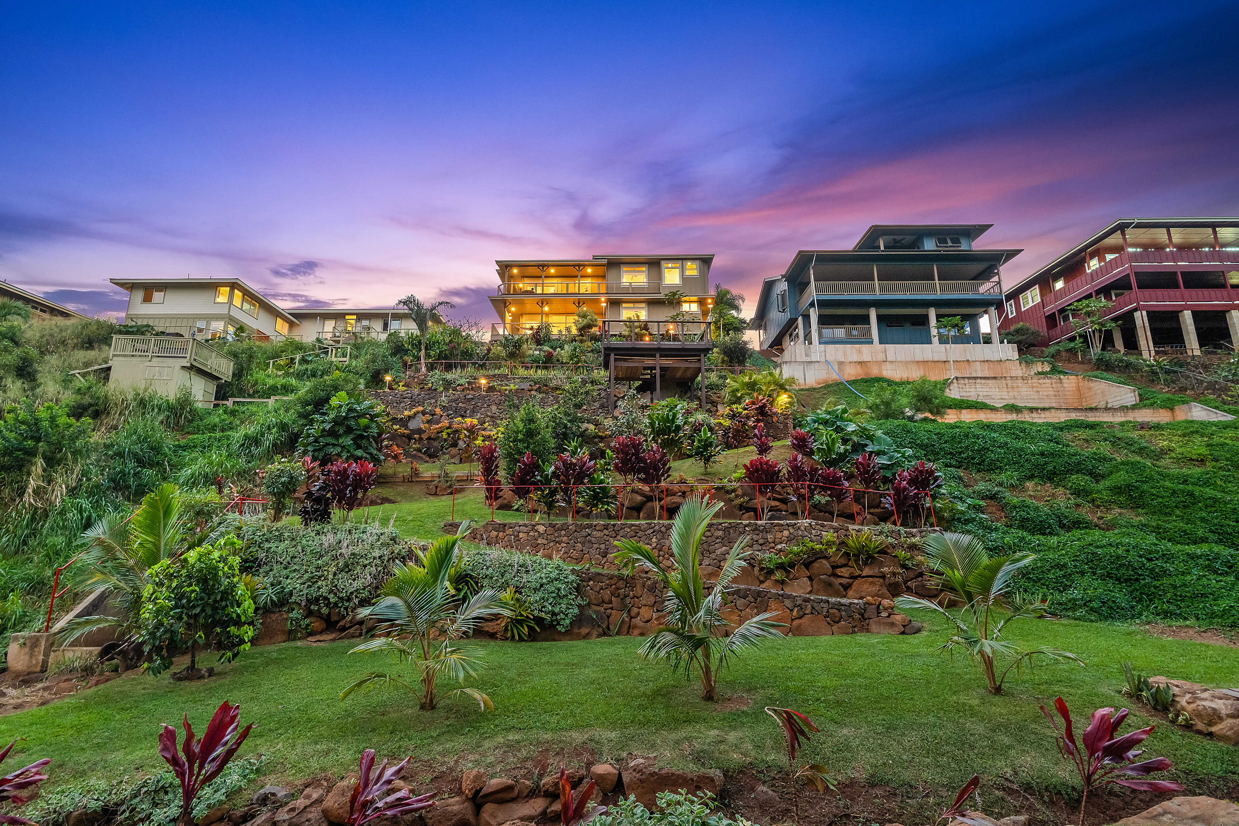 Located on Kauai’s tropical south shore, this ultra energy-efficient home offers versatile living options for multi-generational families or rental income. The residence includes 3 bedrooms, 3.5 bathrooms, & spans 2400 square feet indoors, with an additional 1500 square feet of outdoor lanai space. With the option of separating into two units, the home features two full kitchens & two laundry areas, making it adaptable for various lifestyles.
