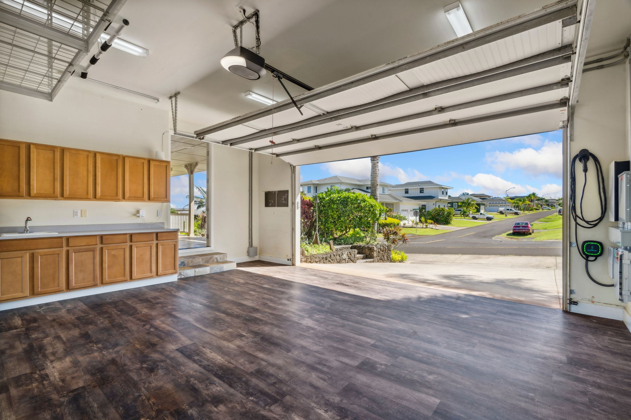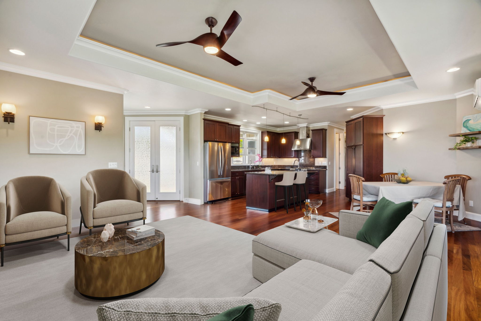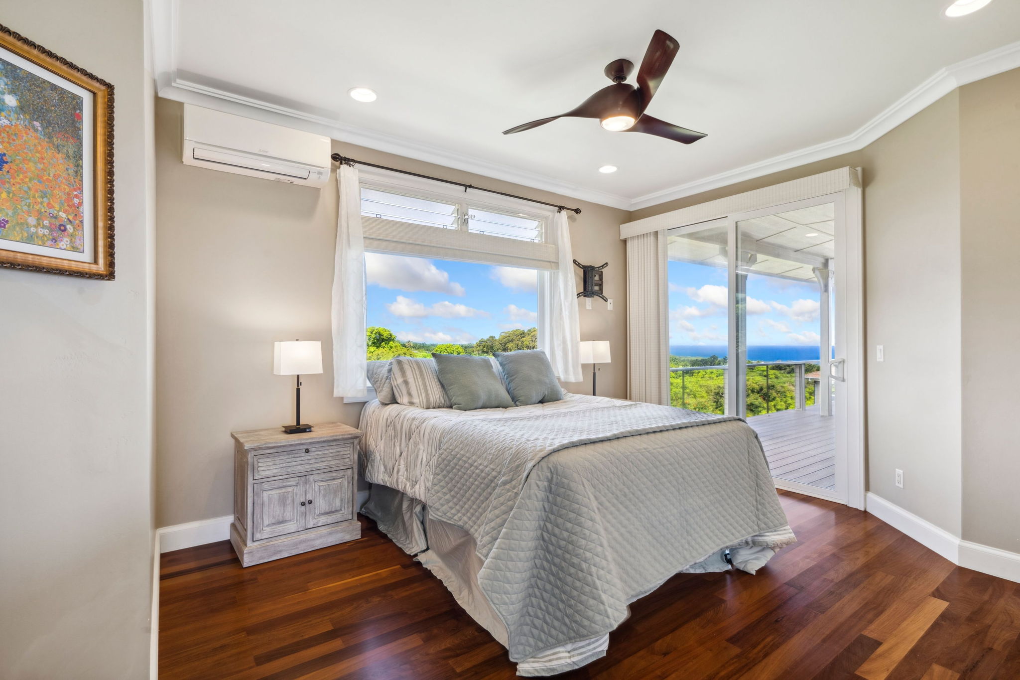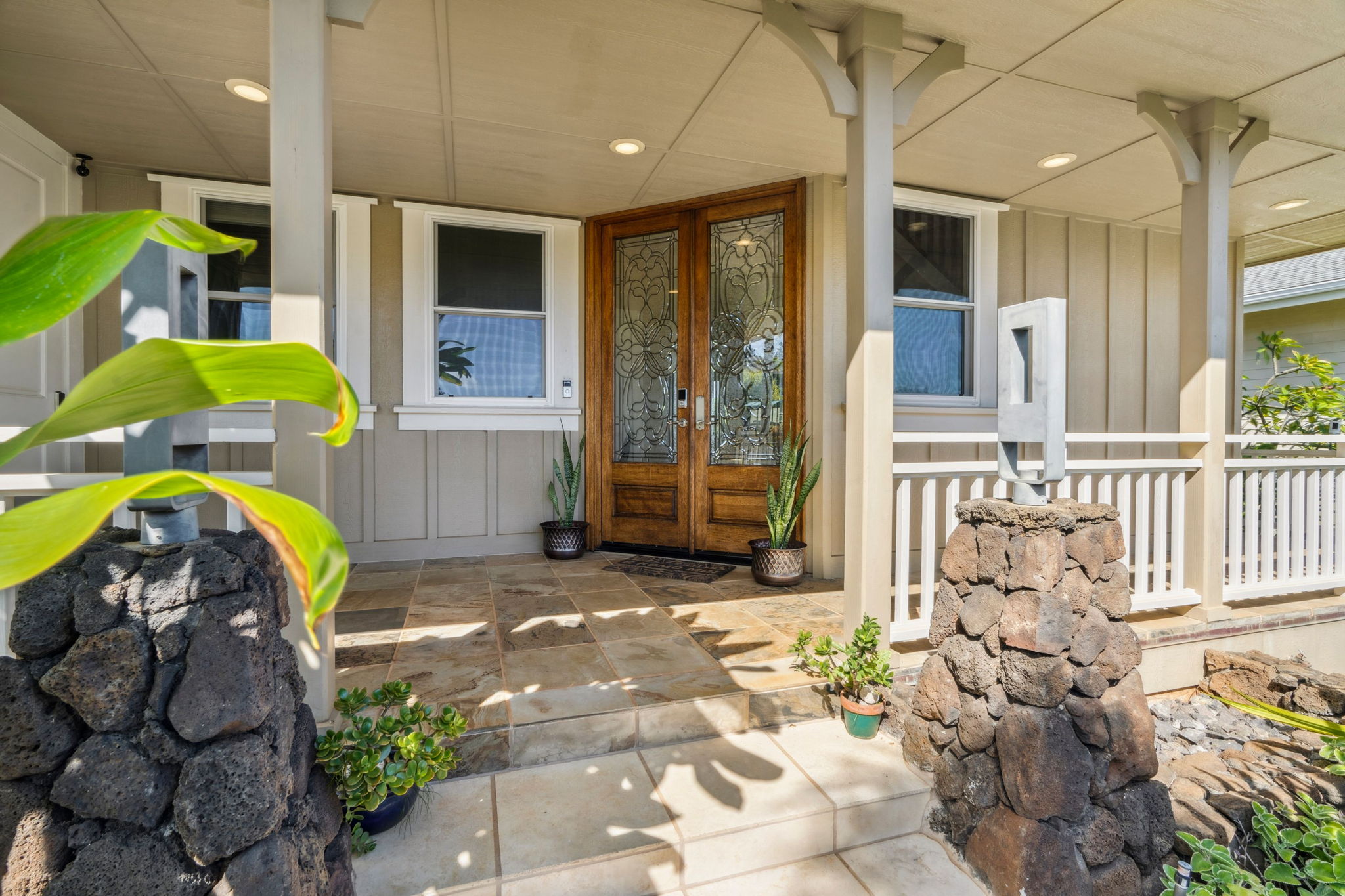 Located on Kauai’s tropical south shore, this ultra energy-efficient home offers versatile living options for multi-generational families or rental income. The residence includes 3 bedrooms, 3.5 bathrooms, & spans 2400 square feet indoors, with an additional 1500 square feet of outdoor lanai space. With the option of separating into two units, the home features two full kitchens & two laundry areas, making it adaptable for various lifestyles.