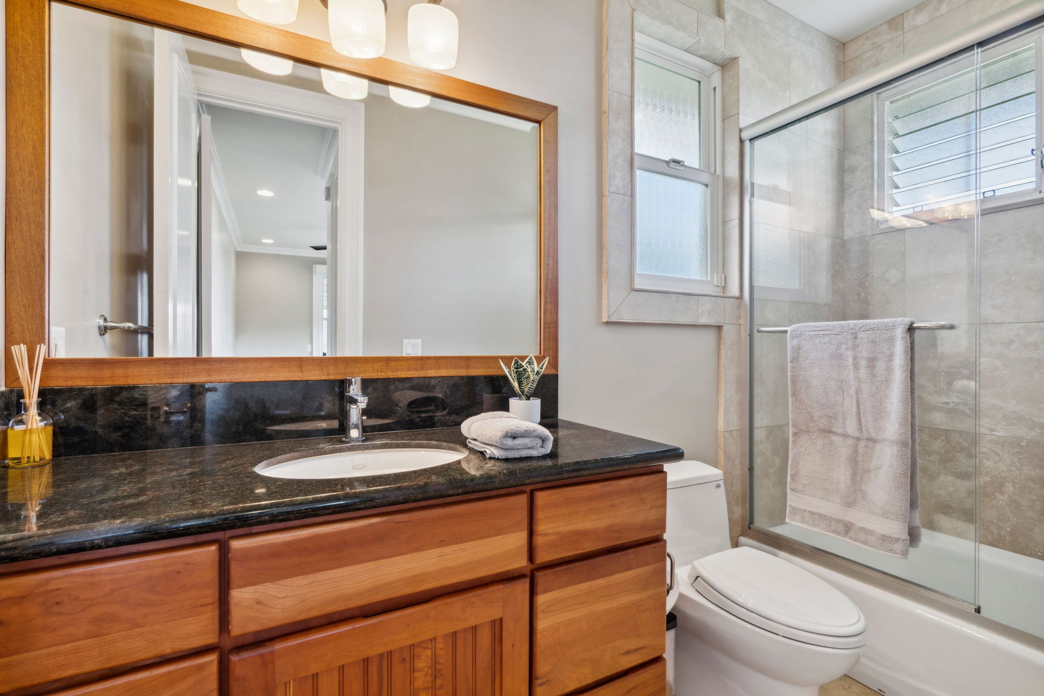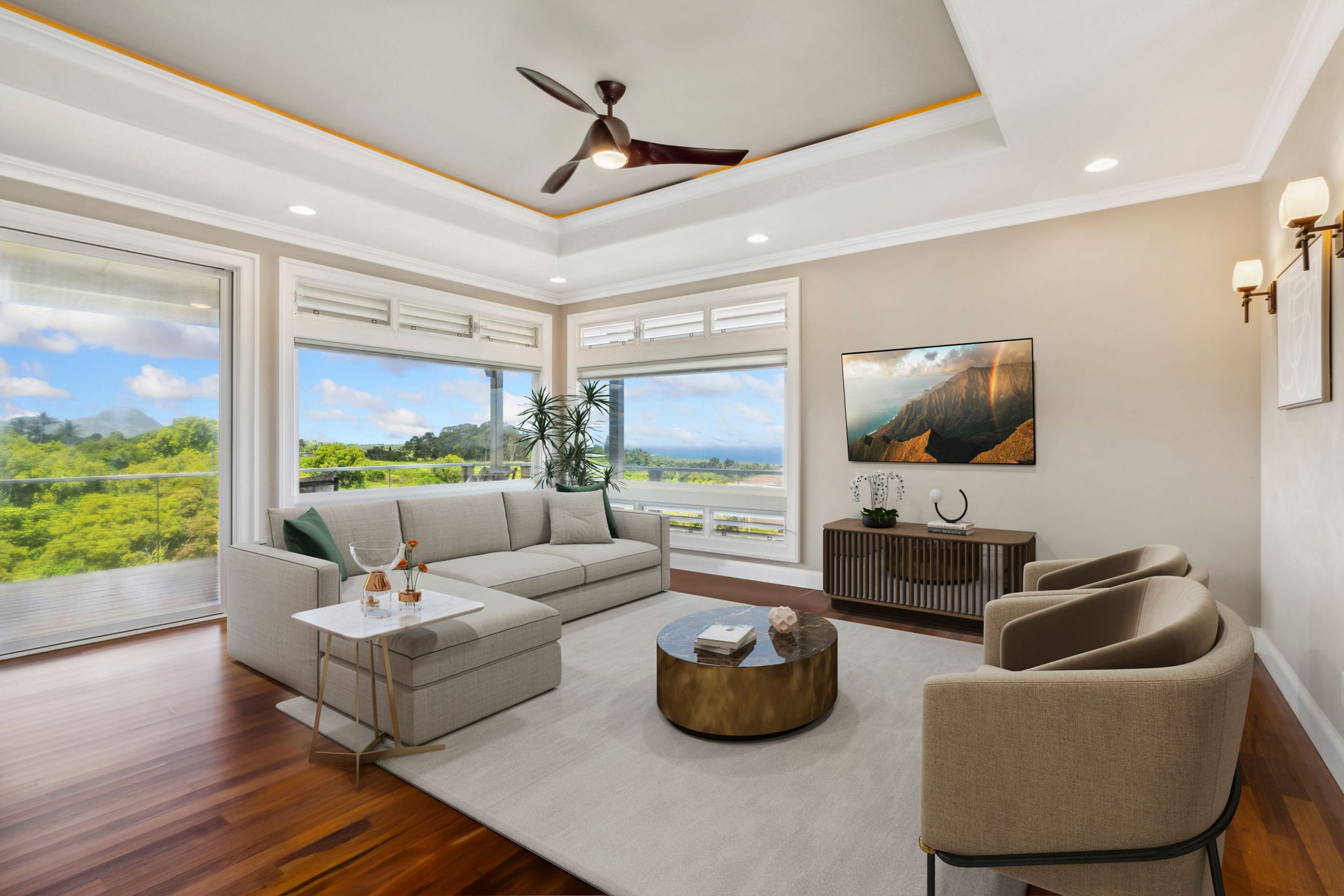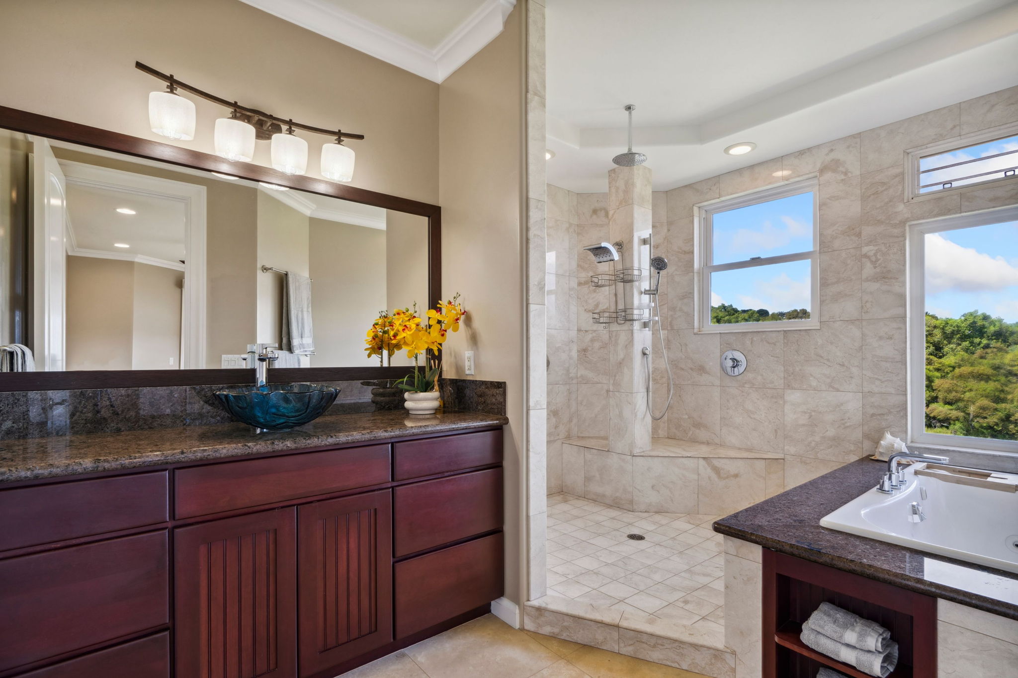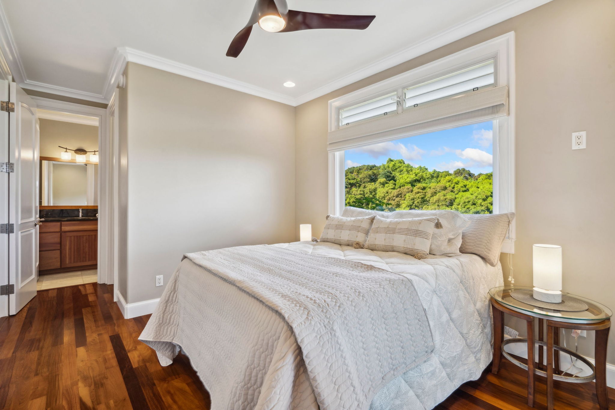 Located on Kauai’s tropical south shore, this ultra energy-efficient home offers versatile living options for multi-generational families or rental income. The residence includes 3 bedrooms, 3.5 bathrooms, & spans 2400 square feet indoors, with an additional 1500 square feet of outdoor lanai space. With the option of separating into two units, the home features two full kitchens & two laundry areas, making it adaptable for various lifestyles.