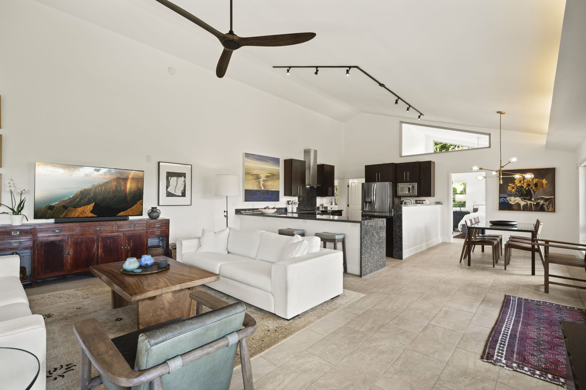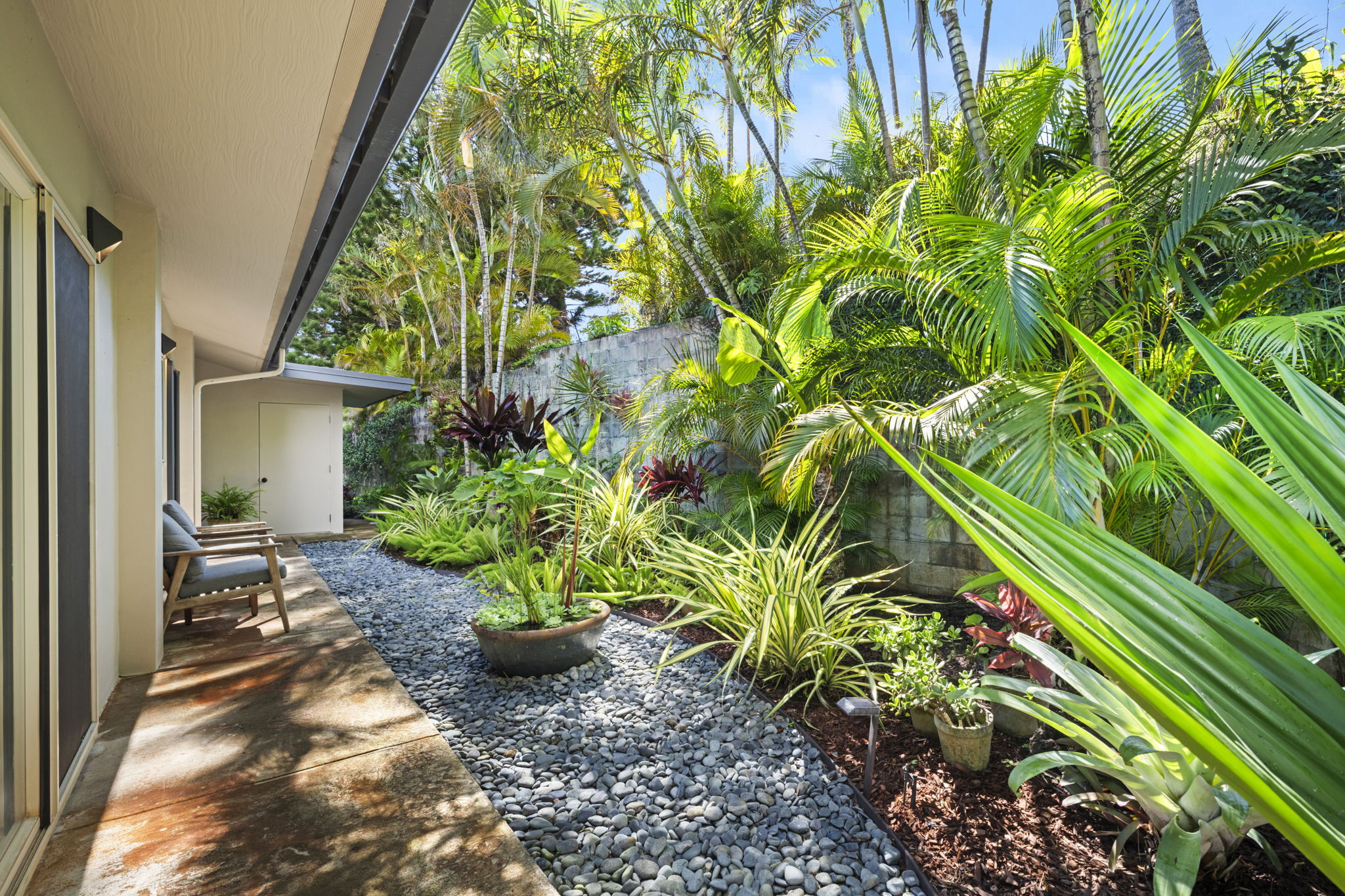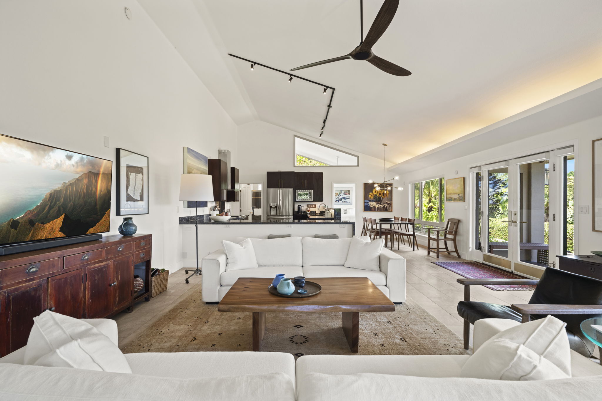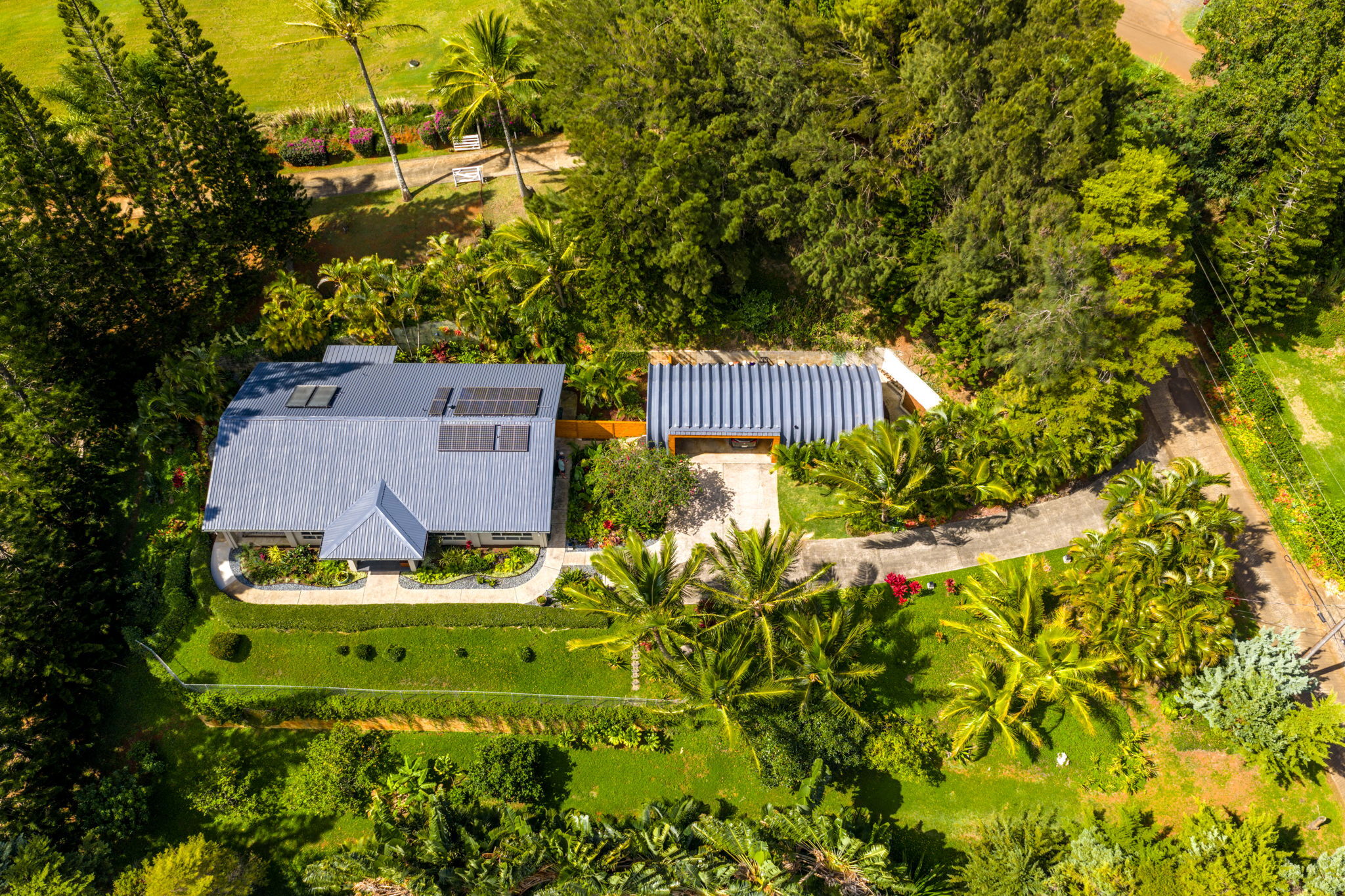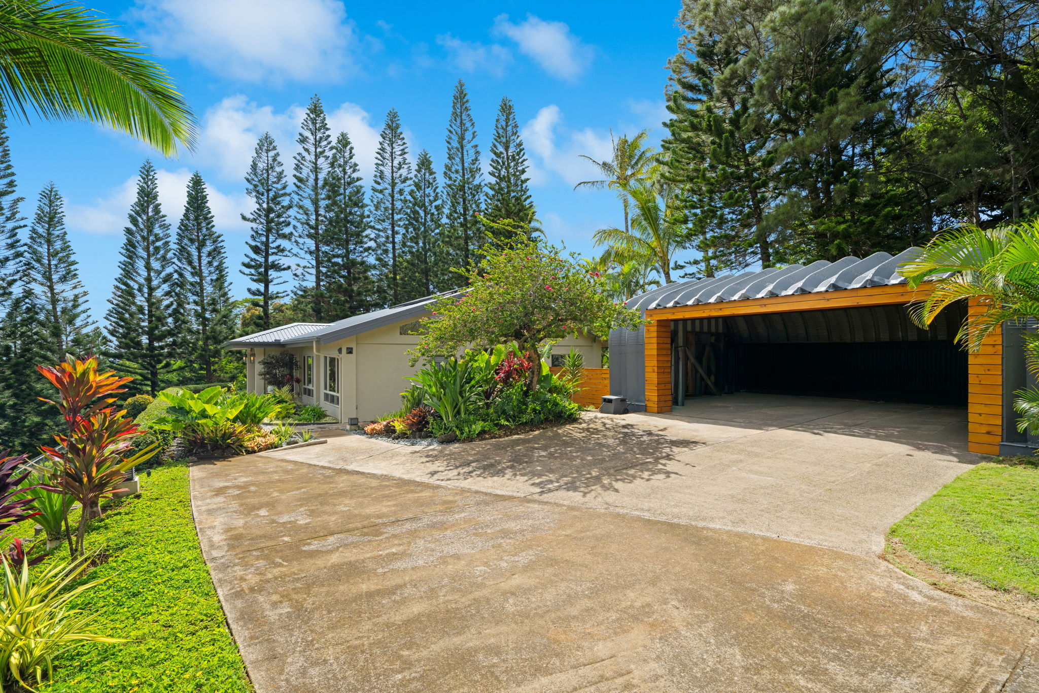 A contemporary and sohsiticated home privately nestled in the serene foothills of Kalaheo. This well-designed, single-level residence spans approximately 2,000 square feet and offers modern luxury and island living.? A long driveway guides you to this private sanctuary, which includes an 800 square-foot refurbished steel garage with two parking spaces and a generous workshop/storage room. This bright and airy home of concrete and steel construction is distinguished by its clean lines, vaulted ceilings, and numerous windows that frame mountain, valley, and peekaboo ocean views on approximately 2/3 acre.