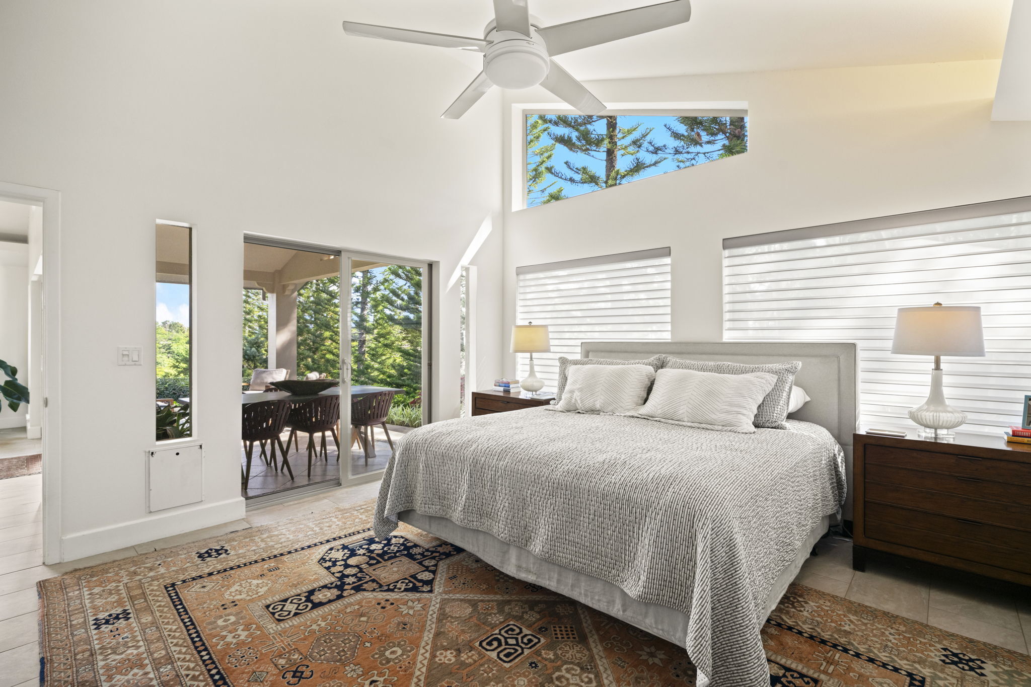 Step inside to discover a thoughtfully renovated interior that emphasizes functionality and style. The great room, featuring soaring 14-foot vaulted ceilings, opens to a covered lanai, creating an inviting space for entertaining. The large, modern kitchen boasts abundant cabinetry, counter space, and stainless appliances.? The home has four bedrooms including one with a separate entrance, ideal for use as a study. The well-separated and light-filled, private master suite features a walk-in closet and a spa-like ensuite bathroom with a barrier-free walk-in shower.