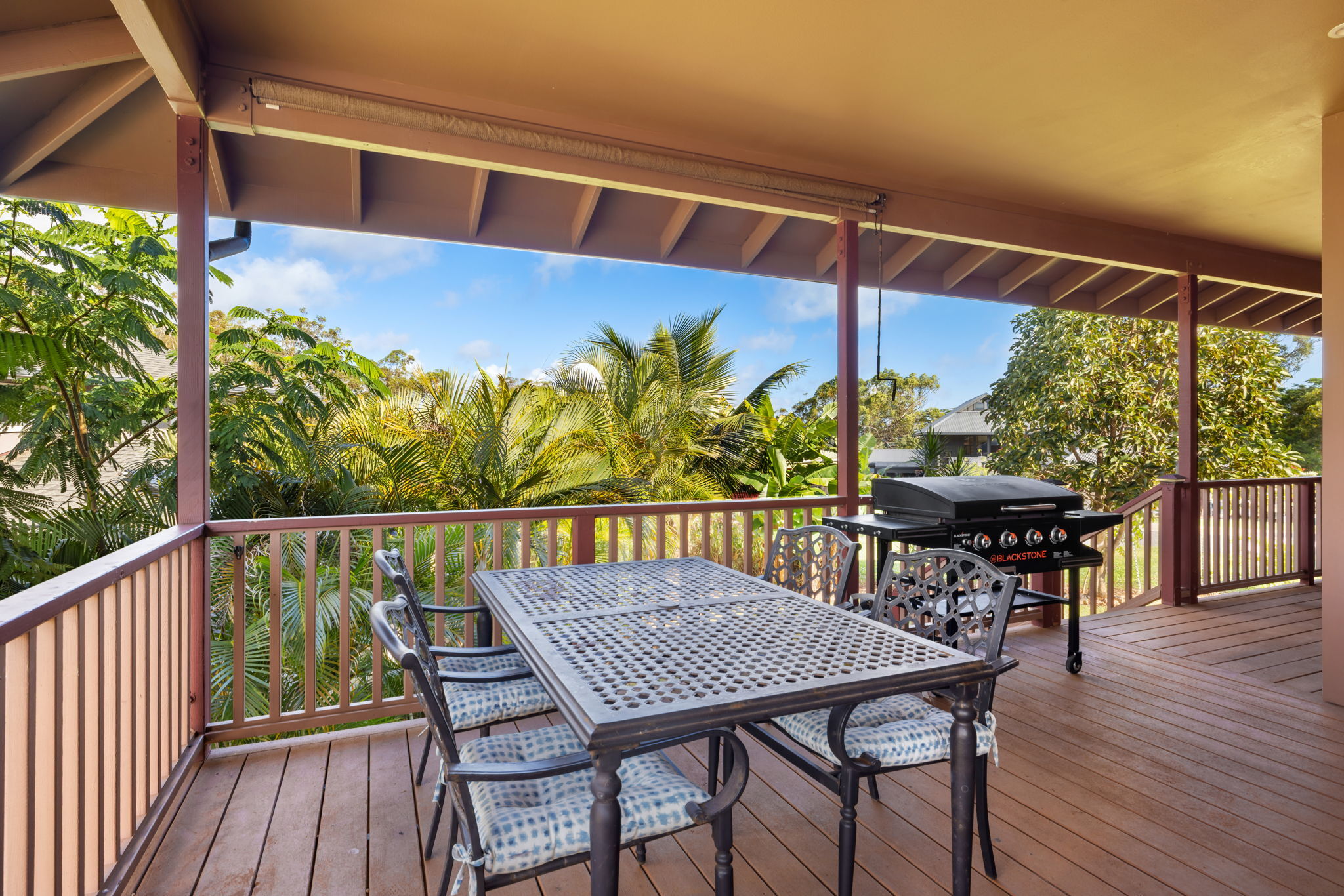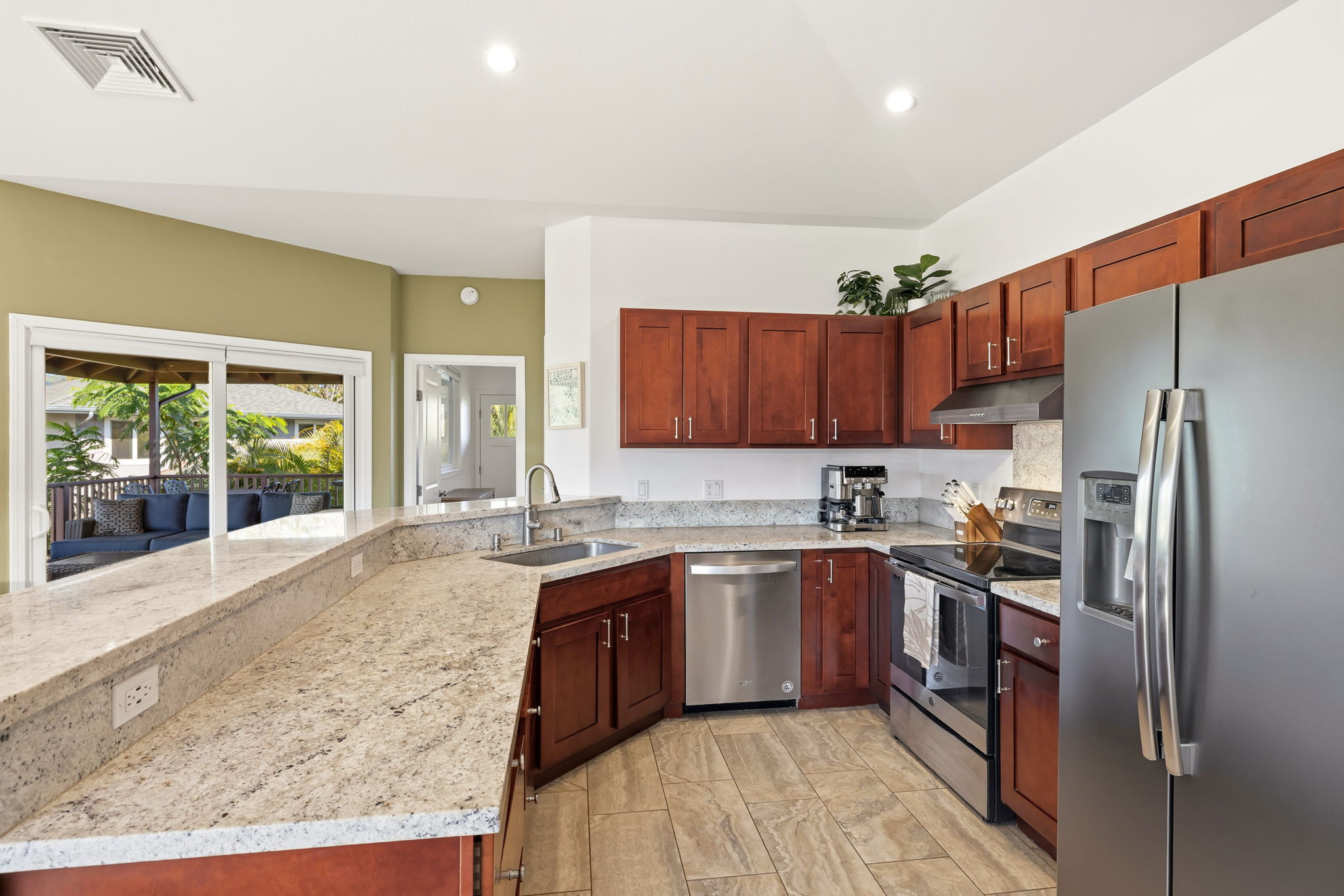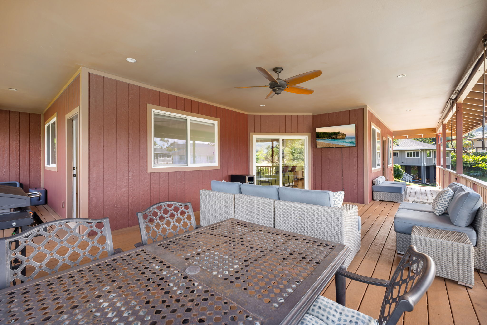 Meticulously maintained and built in 2018, this 3-bedroom, 2-bath residence is located in the highly sought-after Kai Ikena Subdivision–an ideal setting for a primary home. Offered turnkey and fully furnished, the home reflects pride of ownership throughout and is truly move-in ready. The thoughtfully designed floor plan features high ceilings, central air conditioning, and durable laminate flooring throughout the living areas and bedrooms, creating a comfortable and easy-to-maintain living environment. The spacious primary suite includes a walk-in closet, en-suite bath, and direct access to the covered lanai. Enjoy peaceful mountain views from the expansive lanai, perfect for everyday living, outdoor dining, or entertaining. The fully fenced backyard offers privacy and functionality, complete with an outdoor shower and firepit–ideal for pets, gatherings, or relaxing at home. Additional features include granite countertops, travertine tile in the bathrooms, a 2-car carport, and generous storage space beneath the home. Conveniently located near schools and just minutes from sunny Poipu, restaurants, County parks, and Kukuiolono Golf Course, this well-cared-for home delivers comfort, convenience, and quality island living in one of the area’s most desirable neighborhoods.