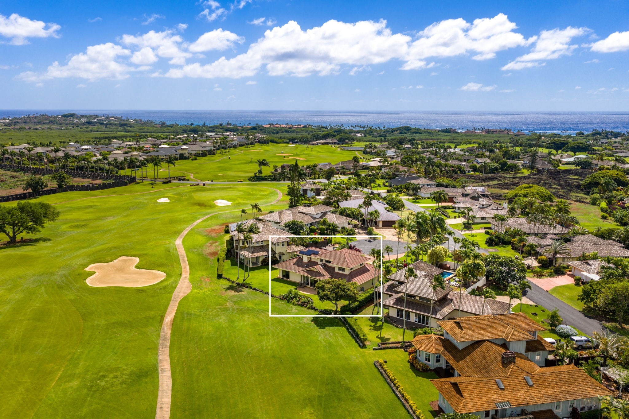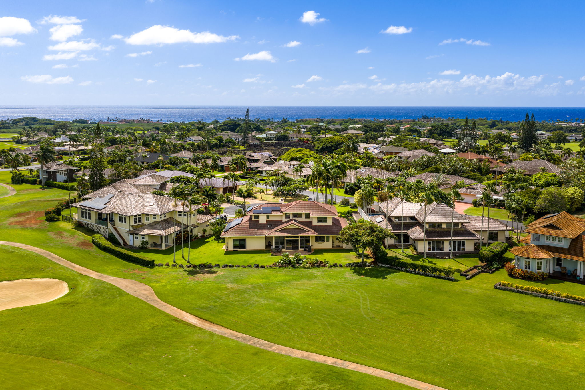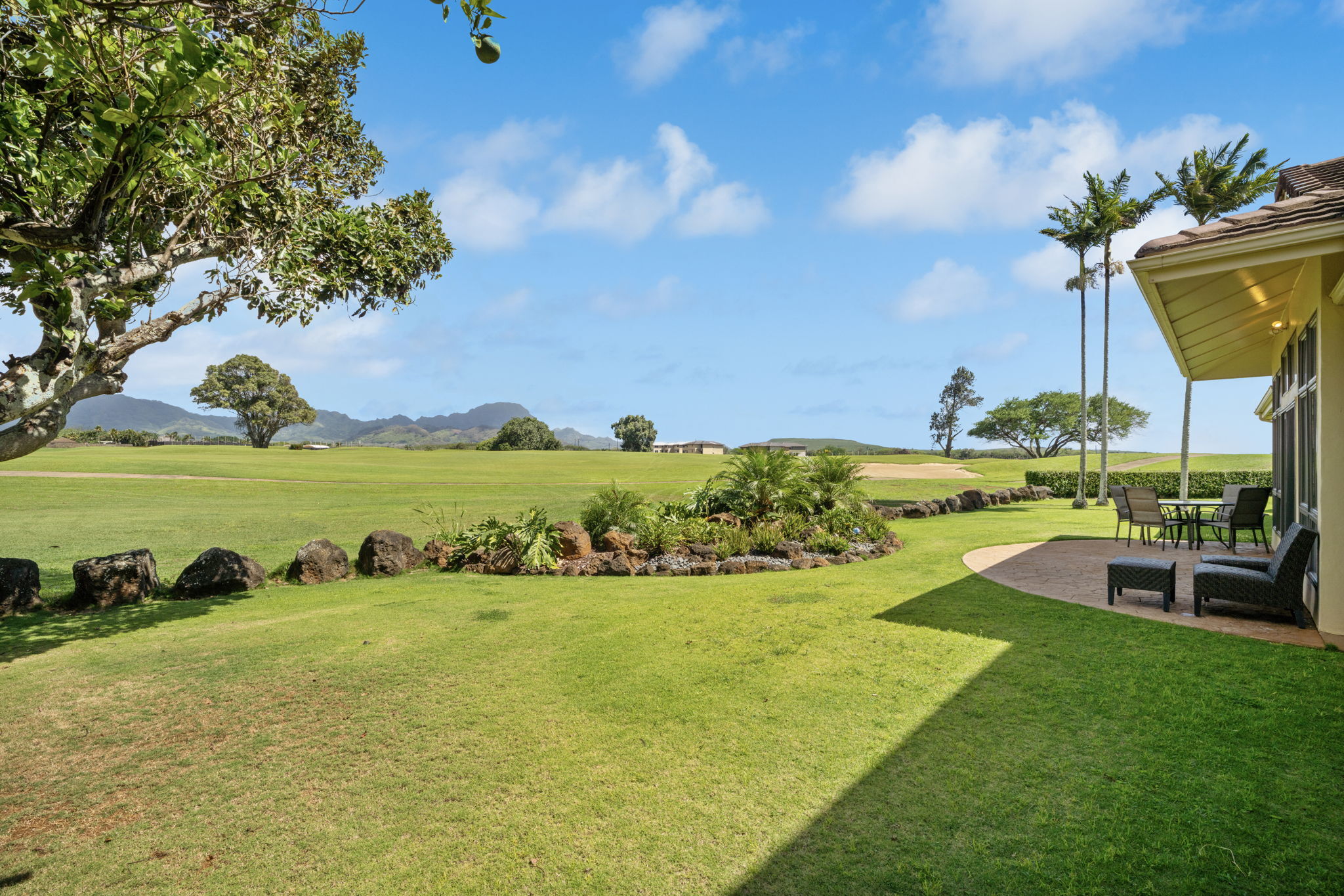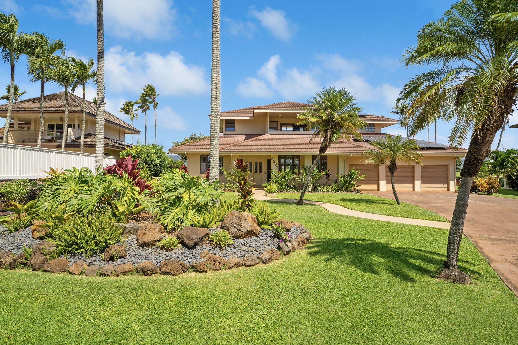 Experience refined island living in Po'ipu’s coveted Kiahuna Golf Village. This beautifully updated 3-bedroom, 3-bath single-family home spans 2,763 sq ft on a 15,610 sq ft lot fronting the golf course with dramatic mountain views and sunrise-to-sunset vistas. Designed for effortless tropical living, the open-concept layout connects indoor and outdoor spaces, welcoming trade winds and golden Kaua'i light throughout. A remodeled kitchen anchors the home, perfect for entertaining family and friends. The entire upper level is a private primary suite with a spacious bedroom, separate study, and outdoor lanai surrounded by lush greenery–an idyllic retreat for morning coffee or sunset relaxation. Split A/C provides year-round comfort, while new tropical landscaping enhances privacy and serenity. A large enclosed garage accommodates two cars plus a golf cart, ideal for island living. Located on a quiet cul-de-sac just minutes from Po'ipu Beach, golf, fine dining, and boutique shopping, this elegant home captures the essence of Kauai’s relaxed luxury lifestyle.