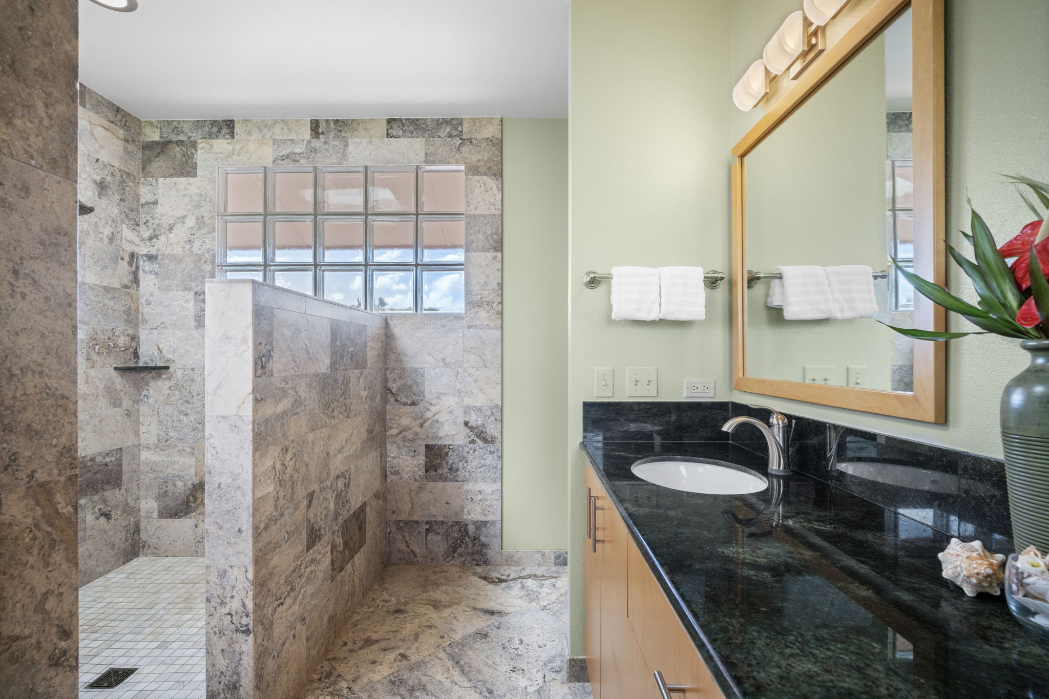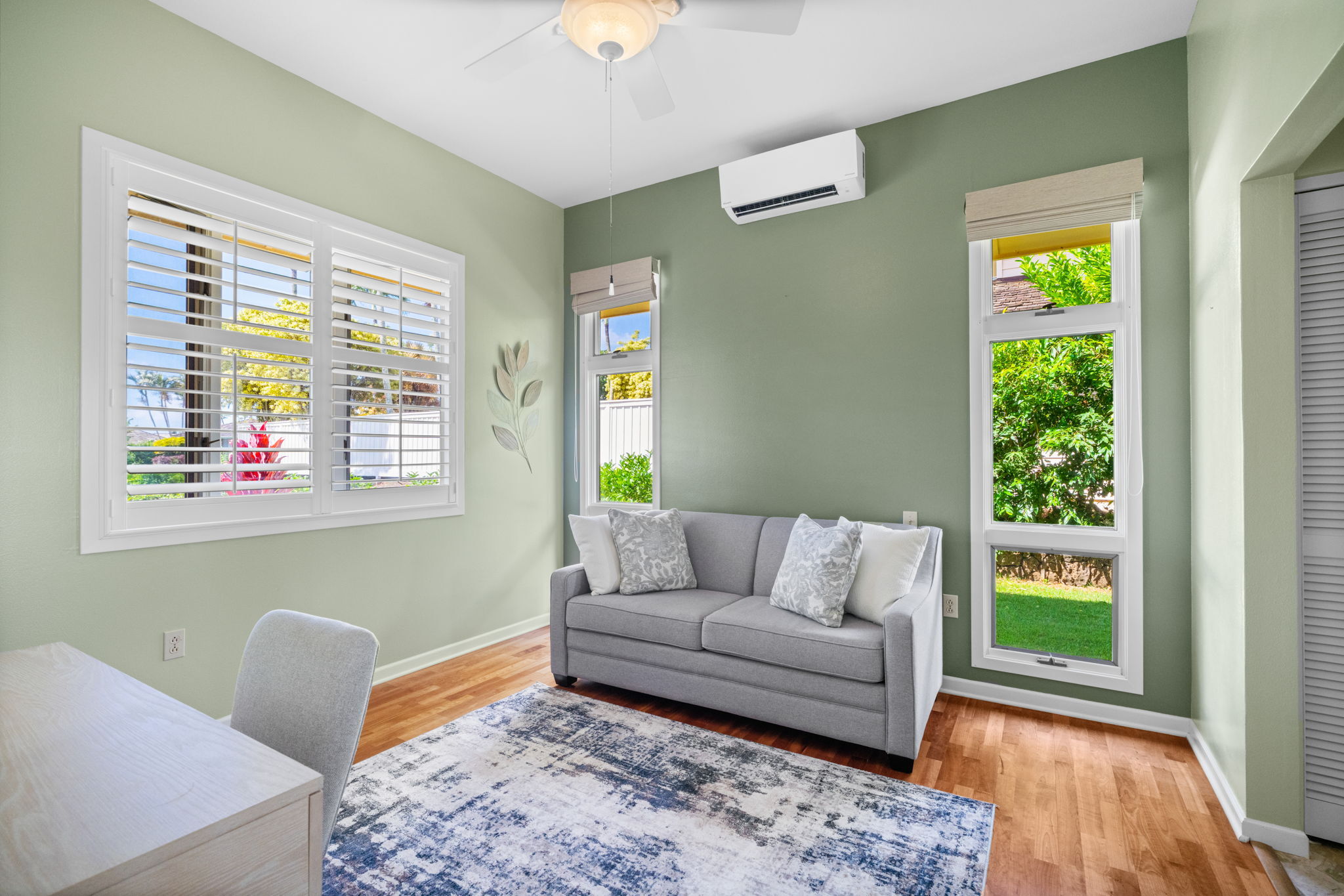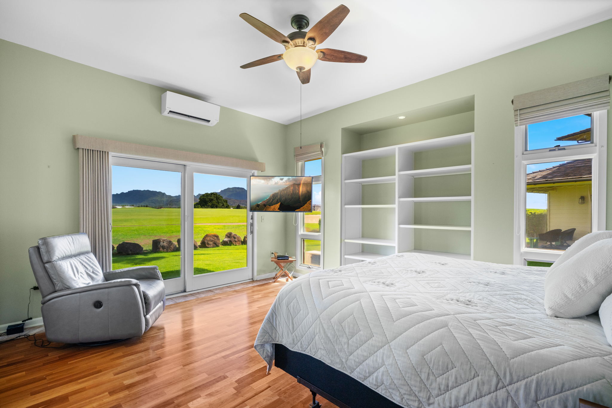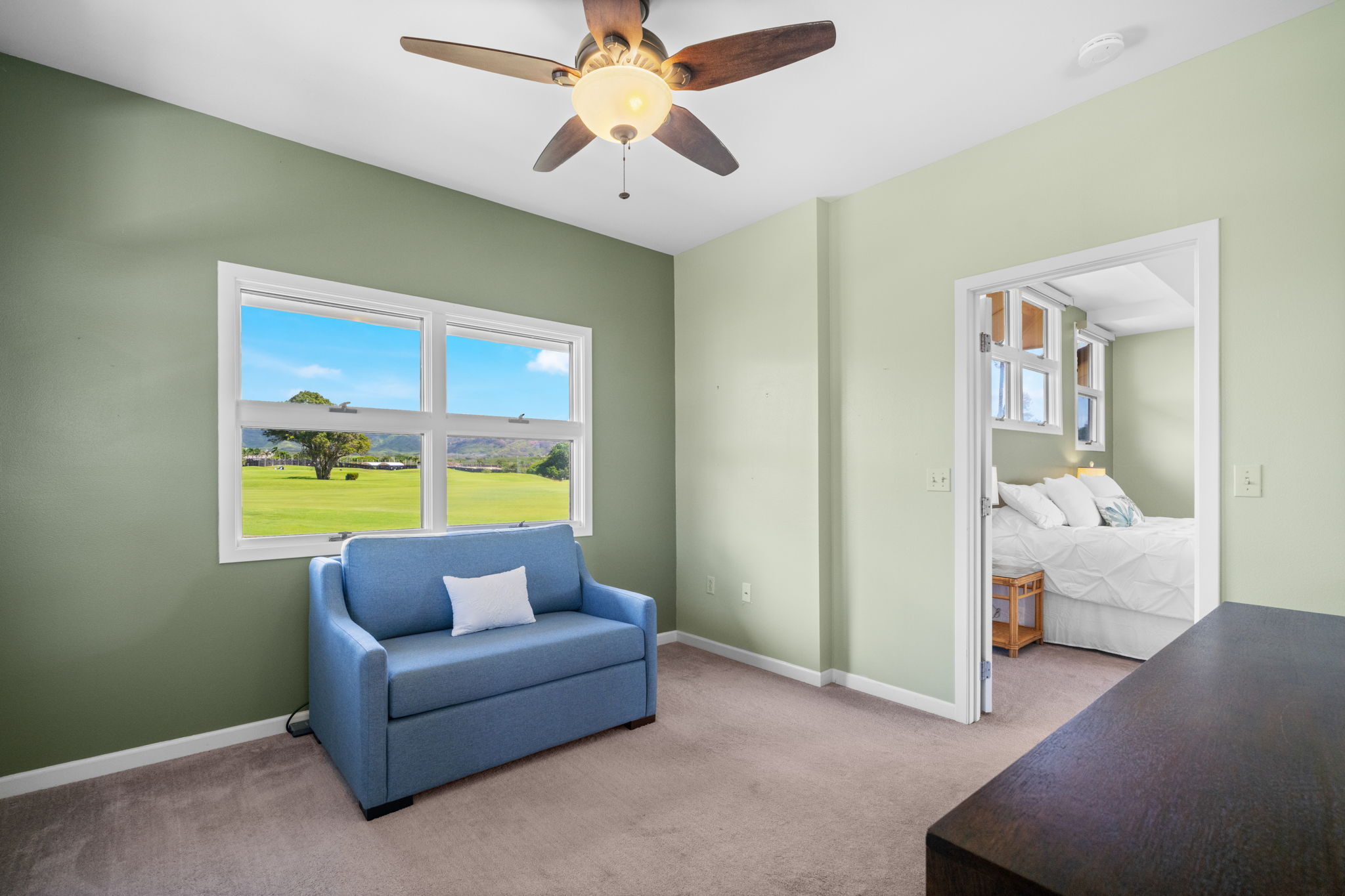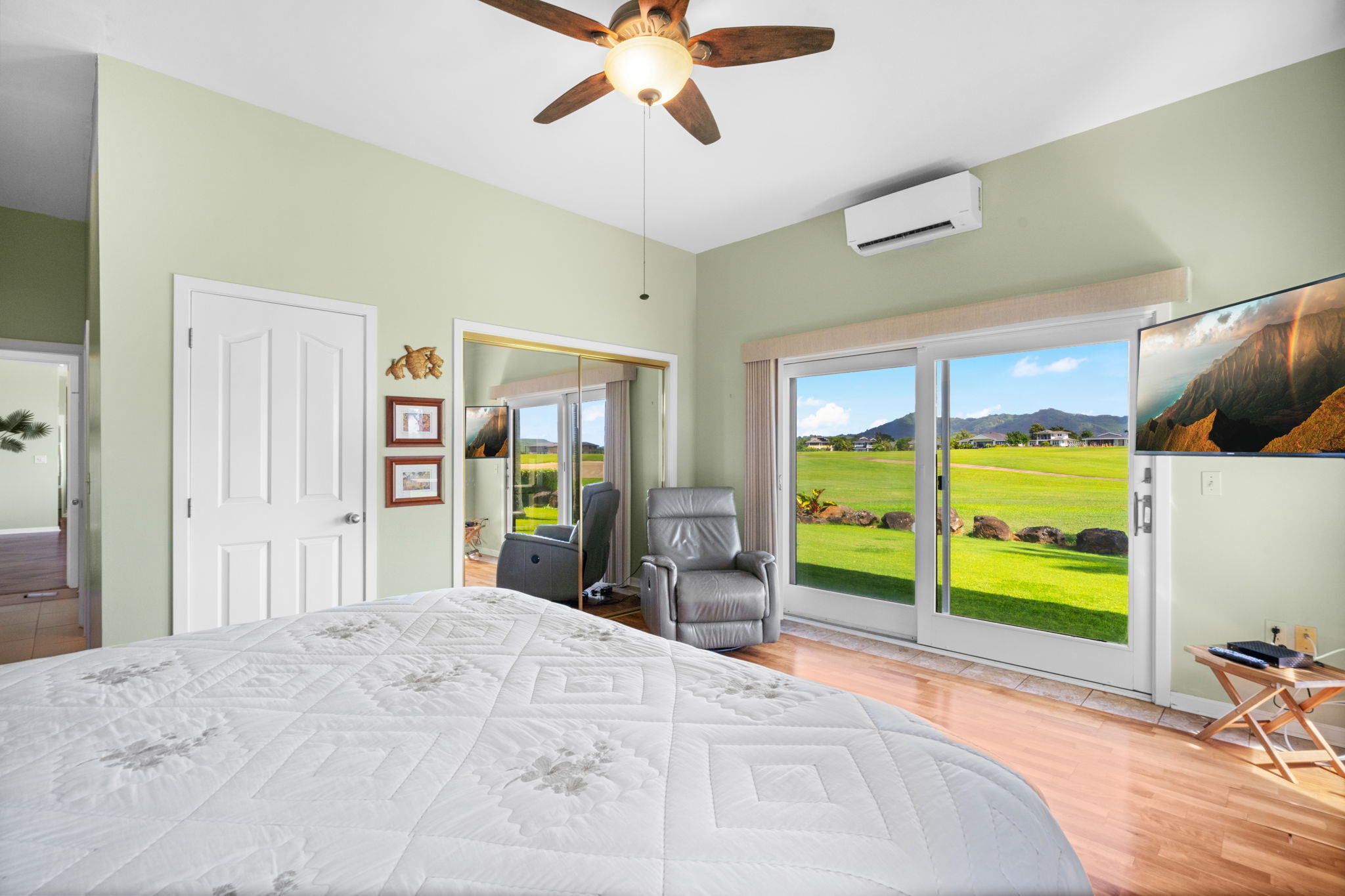 Experience refined island living in Po'ipu’s coveted Kiahuna Golf Village. This beautifully updated 3-bedroom, 3-bath single-family home spans 2,763 sq ft on a 15,610 sq ft lot fronting the golf course with dramatic mountain views and sunrise-to-sunset vistas. Designed for effortless tropical living, the open-concept layout connects indoor and outdoor spaces, welcoming trade winds and golden Kaua'i light throughout. A remodeled kitchen anchors the home, perfect for entertaining family and friends. The entire upper level is a private primary suite with a spacious bedroom, separate study, and outdoor lanai surrounded by lush greenery–an idyllic retreat for morning coffee or sunset relaxation. Split A/C provides year-round comfort, while new tropical landscaping enhances privacy and serenity. A large enclosed garage accommodates two cars plus a golf cart, ideal for island living. Located on a quiet cul-de-sac just minutes from Po'ipu Beach, golf, fine dining, and boutique shopping, this elegant home captures the essence of Kauai’s relaxed luxury lifestyle.