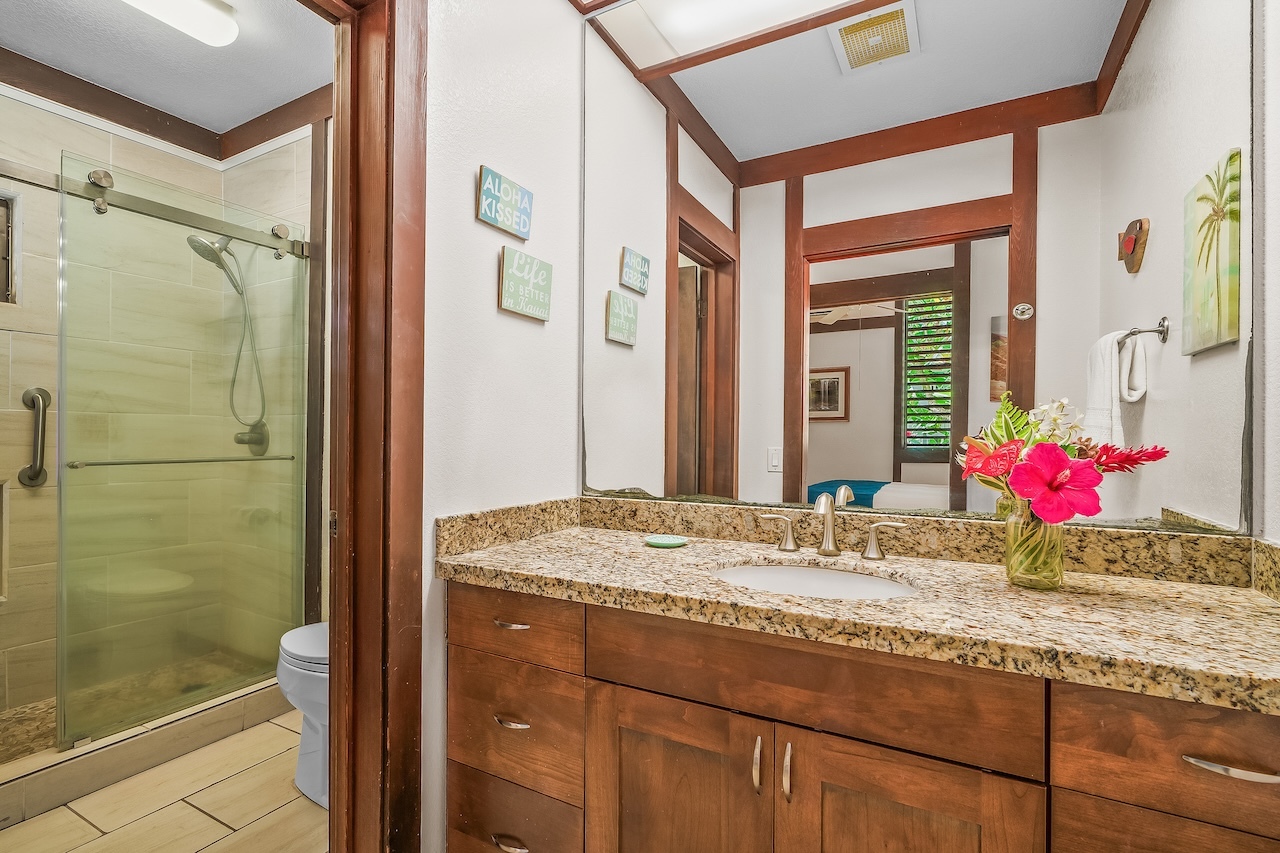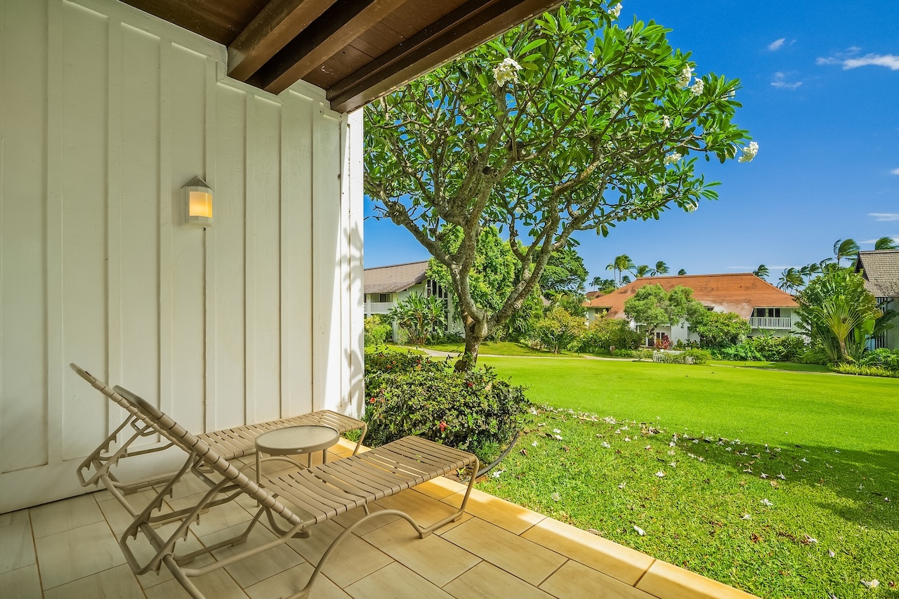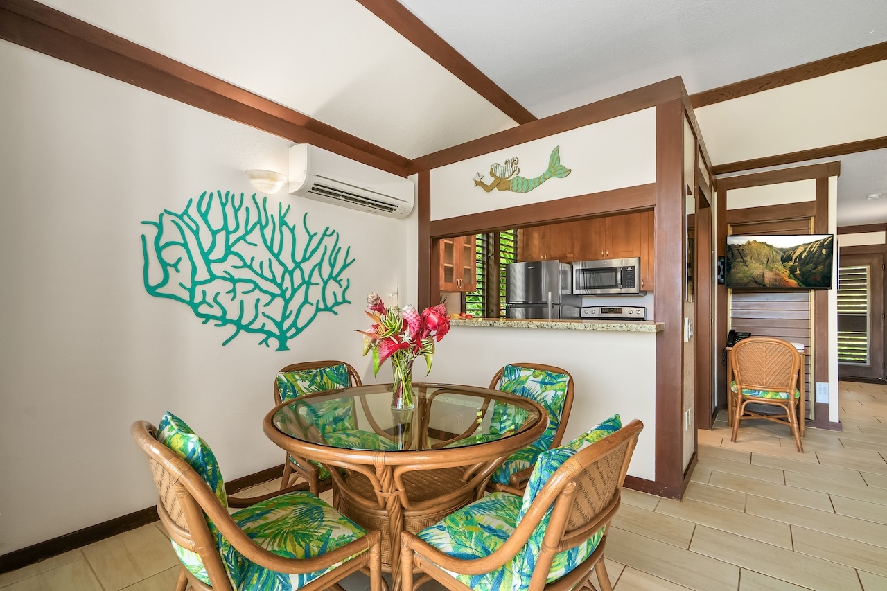 This is a leasehold property. This bright and inviting one-bedroom, one-bath condominium at Kiahuna Plantation has been thoughtfully renovated and is currently an active vacation rental. The unit features tiled flooring throughout and two split AC systems–one in the living room and one in the bedroom–for year-round comfort. As a corner unit, it includes two sets of louvered sidewall windows in both the kitchen and bedroom to maximize the trade winds. A gently sloping entry sidewalk provides stair-free access, and the lanai opens to a spacious lawn that sweeps outward–ideal for dining or relaxing outdoors. The beach that fronts Kiahuna Plantation is just a short, barefoot walk away.