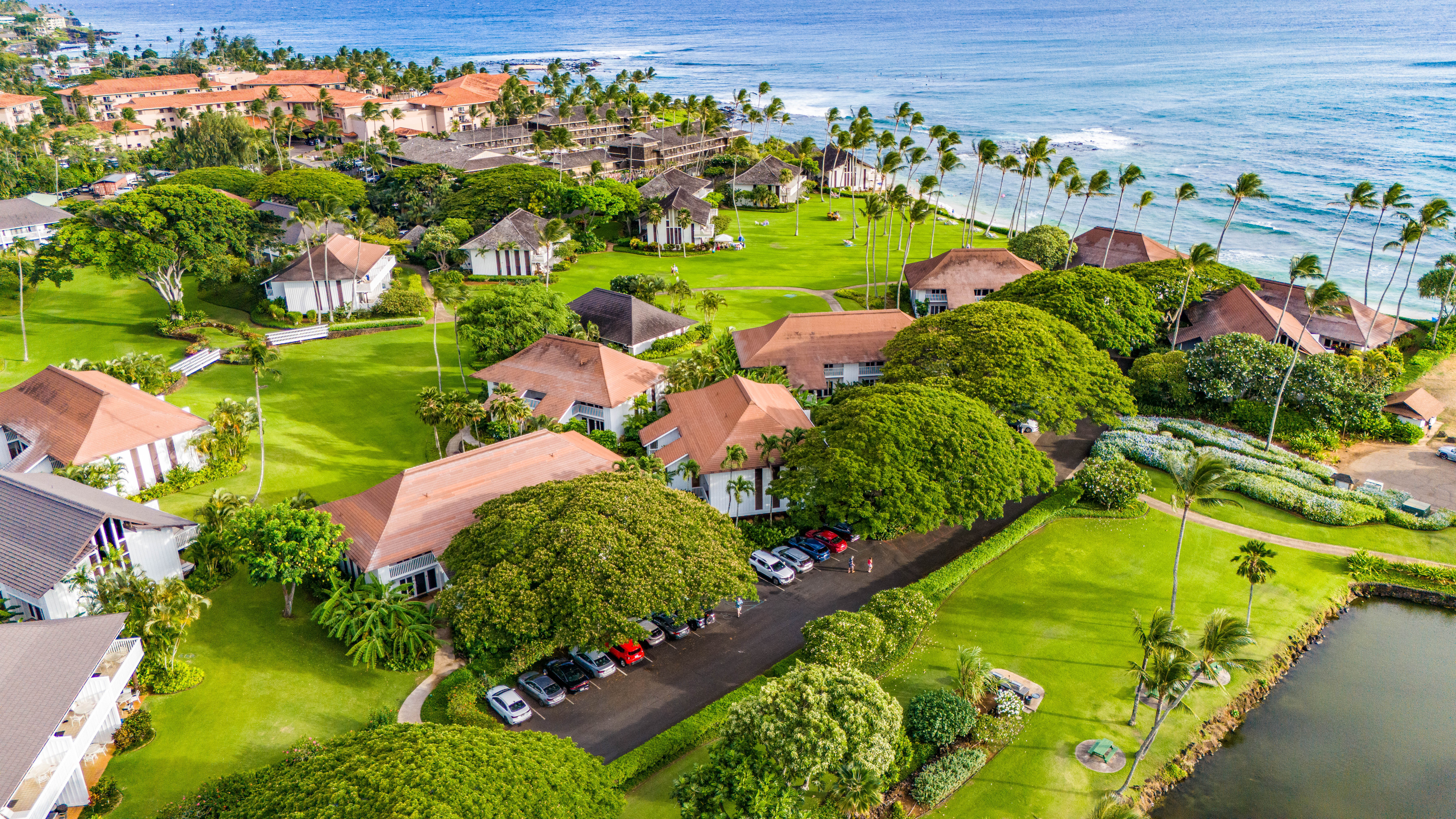 Just a short stroll across beautifully landscaped grounds leads guests to Po?ipu Beach, a premier snorkeling and swimming destination with a protected shallow area for children, plus BBQ areas, gardens, koi ponds, and direct access to resort amenities.