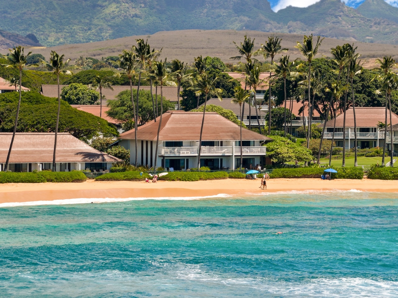 Kiahuna Plantation is the only condominium property in Poipu located directly on a swimming beach. Resort amenities include a pool, athletic club, and expansive grounds, with restaurants and shops within walking distance.