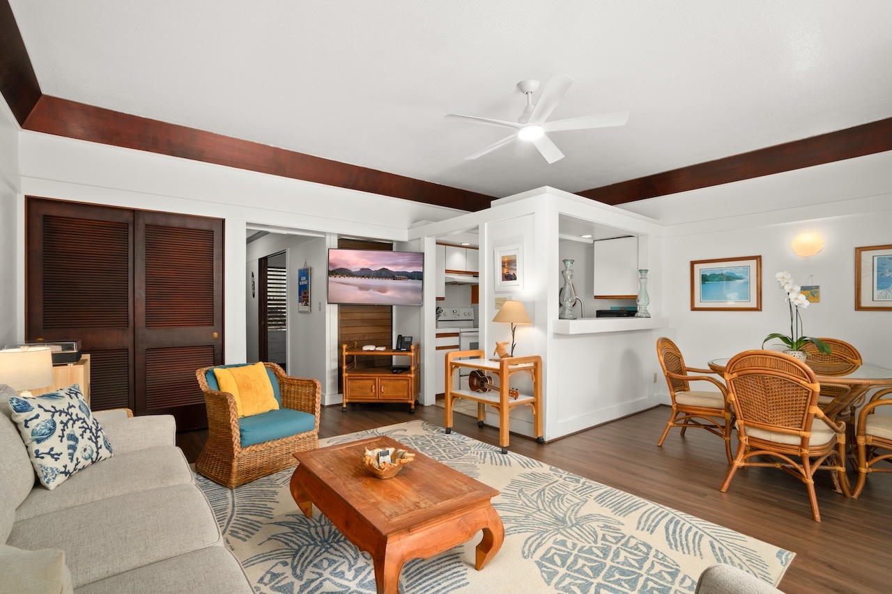 This is a leasehold property. Kiahuna Plantation — Ground Floor, Air-Conditioned, Level Entry This ground floor unit at the Kiahuna Plantation offers easy, level access with no stairs to navigate. The lanai sits flush with the lawn, creating a seamless indoor-outdoor feel with an open lawn area right outside the lanai. Inside, the unit is bright and airy, with air conditioning for added comfort. Laminate and tile flooring provide a clean, low-maintenance finish throughout. The design has a subtle retro vibe that resonates with guests and gives the space a distinct, relaxed personality. The sleeping area is generous in size and features a king-size bed and laminate flooring, offering comfort along with easy care. The overall layout is practical and comfortable, making it well suited for personal use, vacation rental income, or a combination of both. This is a consistently popular vacation rental, appealing to guests who value convenience and walkability. From here, it’s a short walk to the beach, and ownership includes access to the oceanfront setting of Kiahuna Plantation, barbecues located throughout the property, and ample parking. Owners and guests also enjoy membership at the Poipu Beach Athletic Club, an easy walk from the unit. Whether you’re looking for an island home, an established vacation rental, or both, this unit offers a well-located option within one of Poipu’s classic oceanfront communities. To take a tour of this property cut and paste this link into a new browser window: https://bit.ly/Kiahuna405