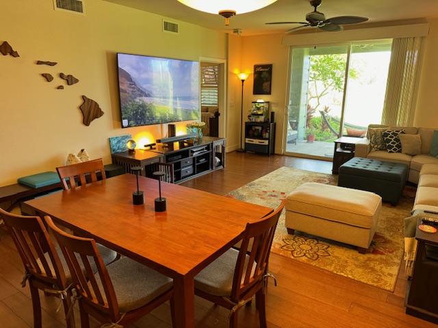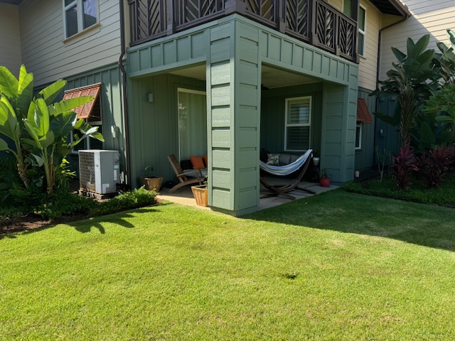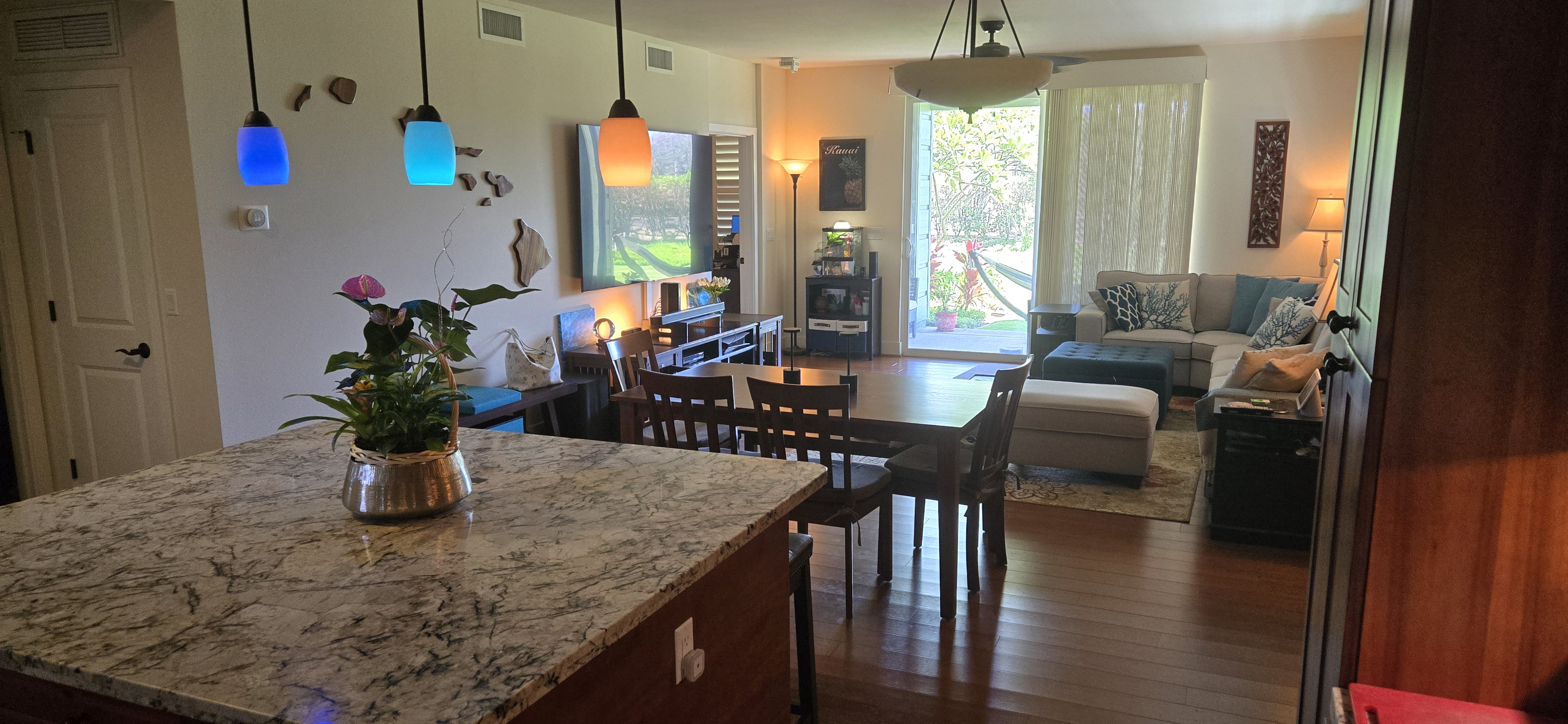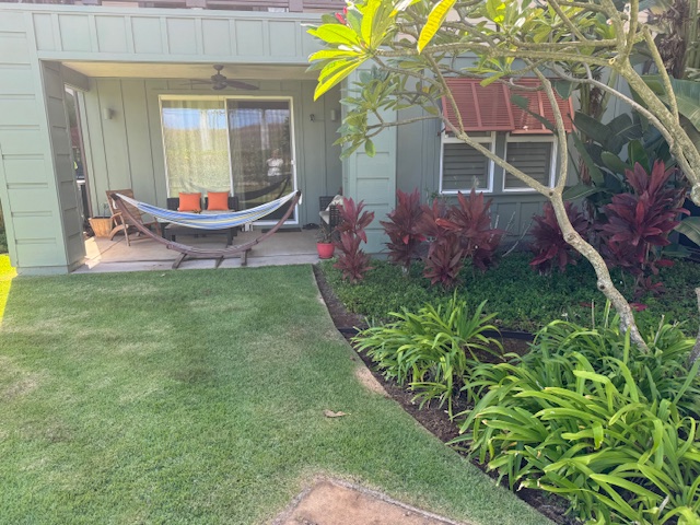 Indulge in outdoor bliss: Step onto your private lanai and savor breathtaking views of Mount Ha'upu. The semi-private lawn offers a serene space for outdoor entertaining or enjoying the warm Hawaiian breeze. The Clubhouse is just a block away and has a Pool, Jacuzzi, Gym, Children's pool, and Barbeques. The pool is reserved for Lap swimming daily 8-9am. Experience the pinnacle of comfort: With central air conditioning, spacious rooms, and a one car garage and additional deeded parking, Unit 1J provides everything you need for a luxurious and comfortable lifestyle.