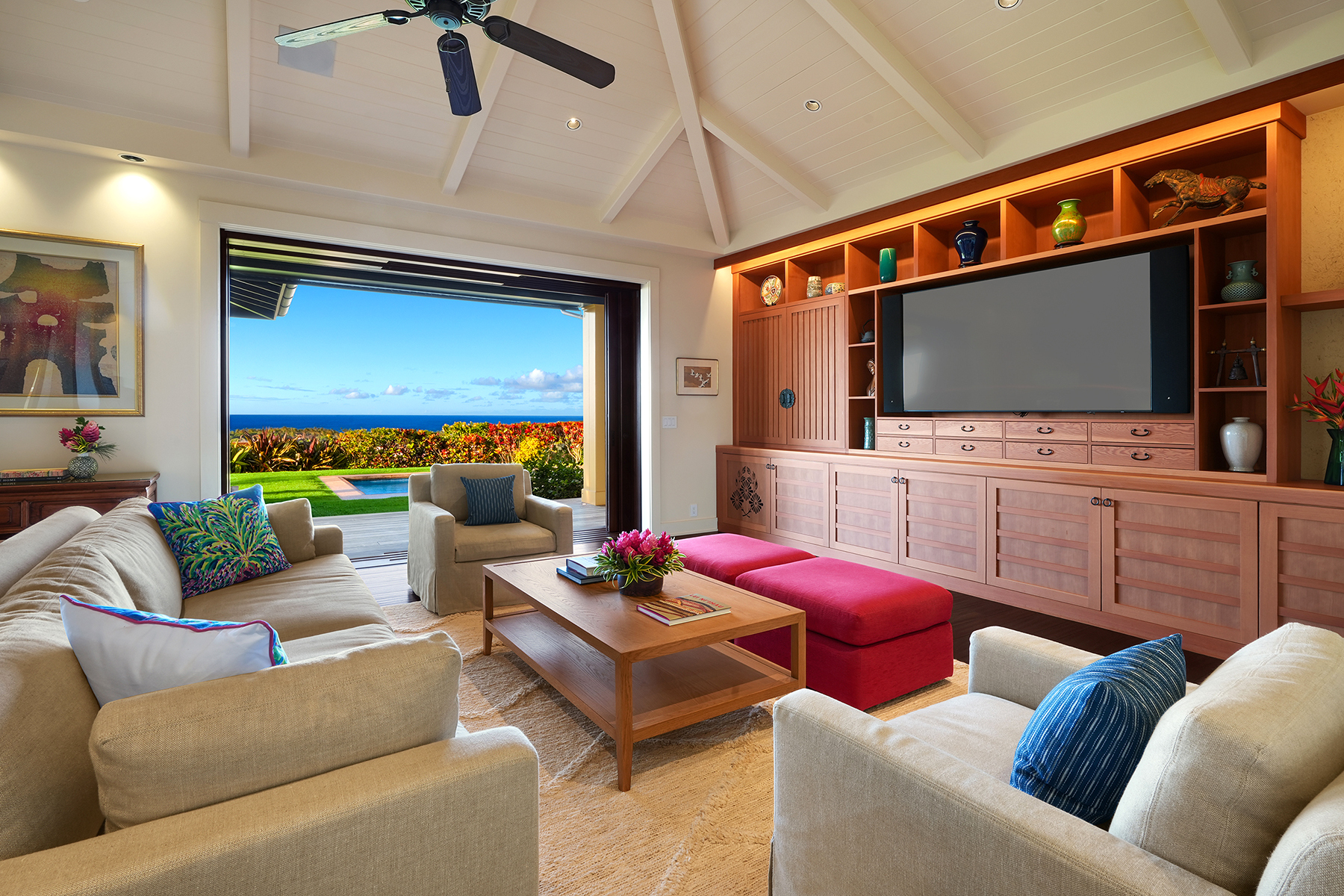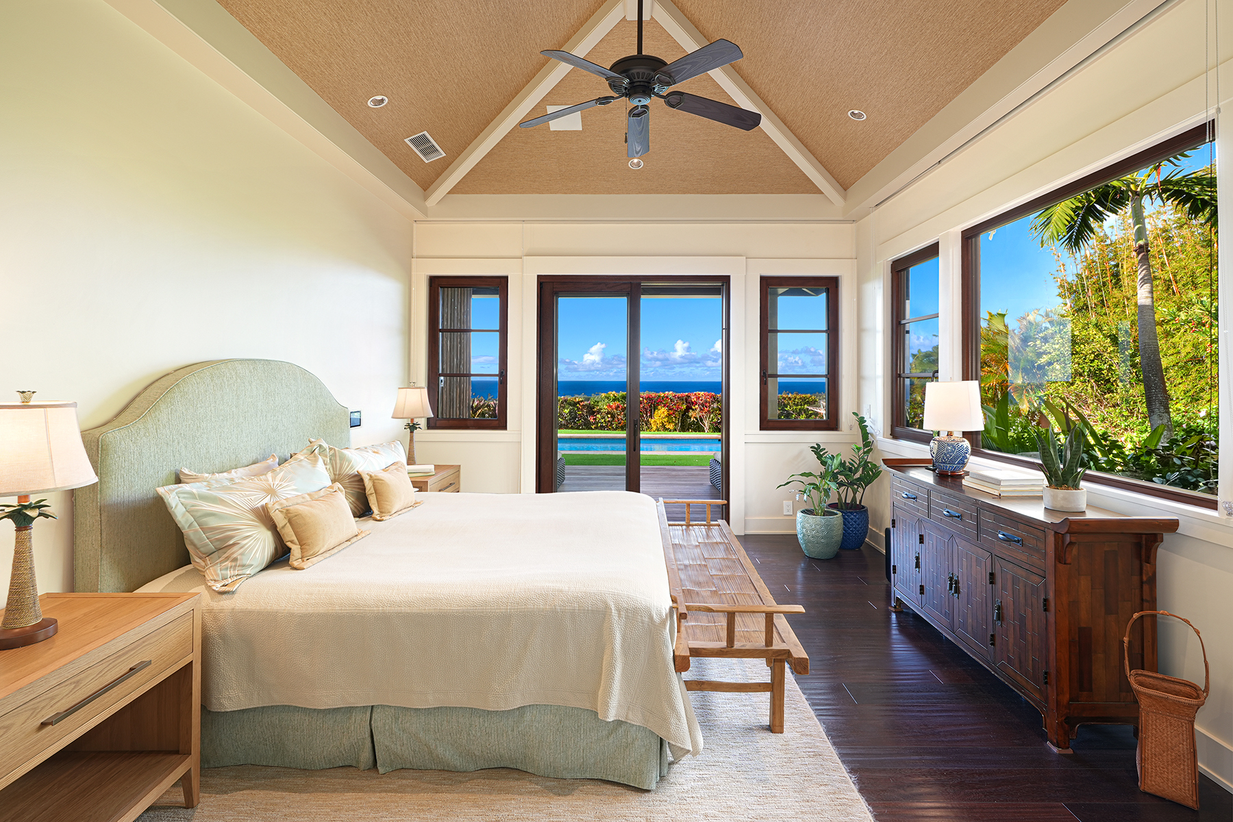 This estate-caliber residence, within the prestigious Kahalawai enclave of Kukui‘ula, commands sweeping whitewater vistas, coastal panoramas, and mountain silhouettes illuminated by glowing southwest sunsets. Oriented for exceptional privacy, the nearly 1-acre grounds are impeccably maintained and tailored for effortless hosting. The home offers 4 bedrooms, 4.5 baths, pool bath, 2 private offices, expansive garage, and a sunset-facing lanai and pool that frame coveted views. This residence is designed as a gathering place, equally suited to relaxed island living and refined entertaining. The great room’s vaulted ceilings, Brazilian Jatoba wood floors, and custom Douglas Fir built-ins set a warm, sophisticated tone. The kitchen elevates culinary artistry with its state-of-the-art design: Belmont custom cabinetry, a handcrafted central island, separate Sub-Zero refrigerator and freezer, and Thermador and GE Monogram appliances ensure every need is flawlessly met. Imported Albertini windows and doors open seamlessly to the lanai, inviting guests to enjoy cocktails, dinner, and the beauty of the setting. As evening settles, each guest retreats to the serenity of their private bedroom suite, with the primary bedroom offering a spa-inspired bath and generous walk-in closet. For those who rise early and require a study, choose from two oceanview options. All appreciate the ease of this technology-forward residence. A 34-panel photovoltaic array, Tesla Powerwall, solar hot water system, and zoned air conditioning deliver exceptional efficiency. Paired with a whole-home media system, the property offers seamless integration. FACTS & FEATURES Land Area: 35,937 SF Interiors: 4,490 SF Covered Lanai: 1,500 SF Garage: 730 SF Rooms: 4 Bedrooms, 2 Offices, 4.5 Baths, Pool Bath Views: Ocean, Mountain, Golf, Sunrise, Sunset A/C: 8 Zones, 4 Handlers View the video (copy/paste into browser): https://tinyurl.com/3mwpzsxd