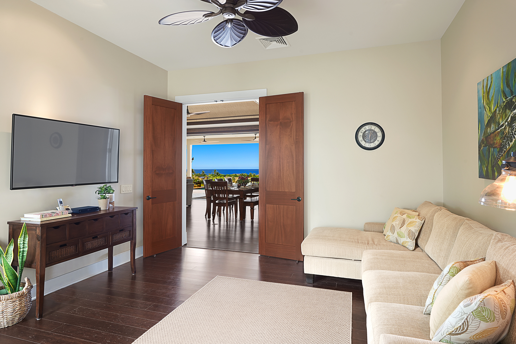 Adjacent to the kitchen, a dedicated media room offers an intimate space perfect for movie nights. On opposite wings of the home, two ocean-view primary suites each include walk-in closets, dual vanities, and private garden showers. The third ensuite bedroom overlooks the garden, while the attached Ohana suite, complete with its own entrance and bath, provides an additional private haven.