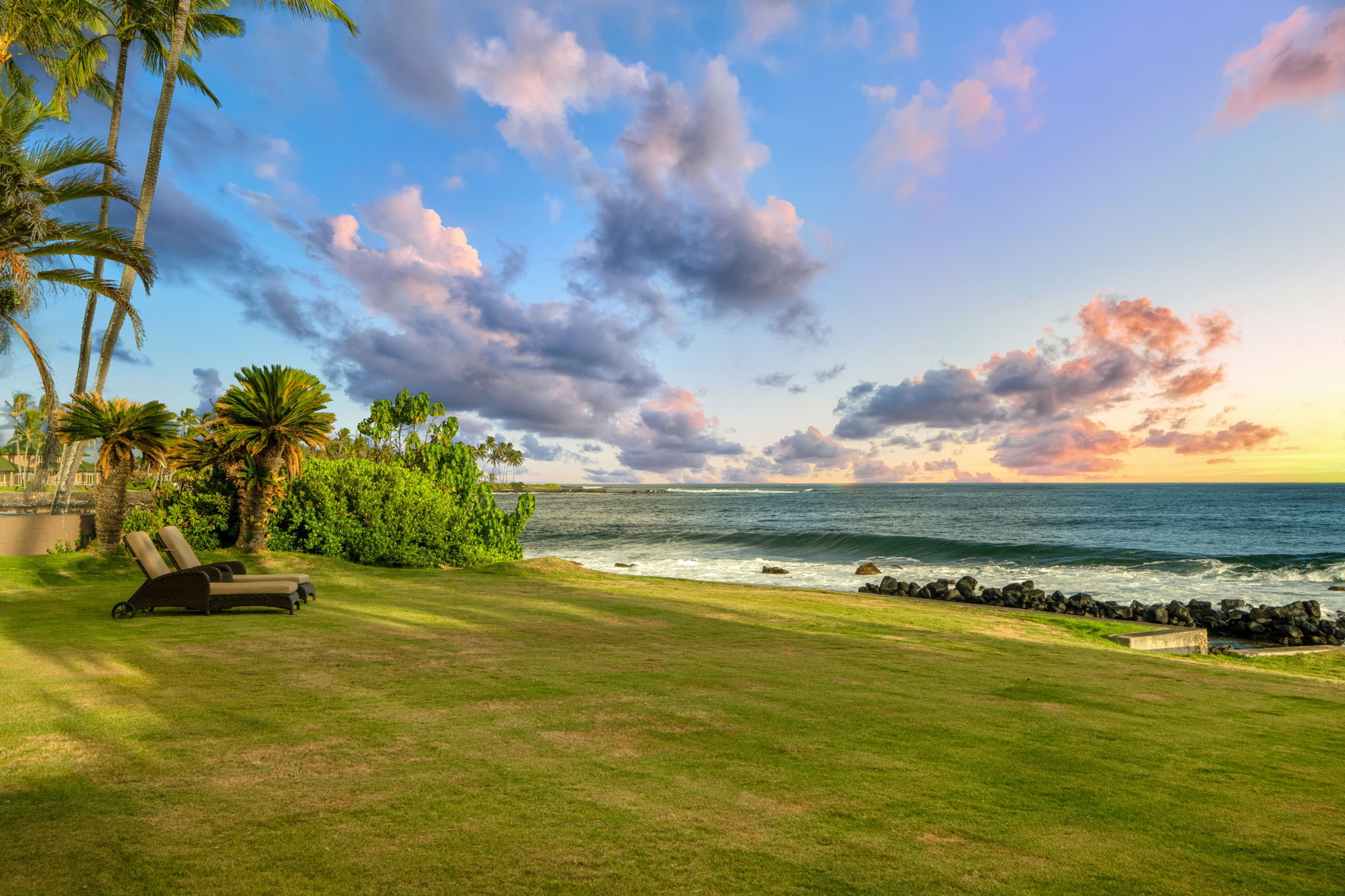 This turn-key, fully furnished oceanfront property is located near Kukui‘ula Harbor on Kauai’s South Shore. From the backyard, enjoy private beach access, offering a rare and seamless connection to the shoreline. Positioned along one of the island’s most desirable coastlines, the landscaped lot opens to unobstructed views of the Pacific Ocean, where sunsets, the Spouting Horn, sandy beaches, and passing marine life create a daily connection to island beauty.